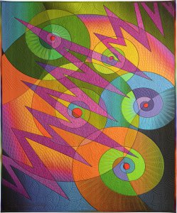 This is one of a series of quilts that combine zigzags, and curved shapes, in this case, logarithmic spirals. I turned my line drawing into separate shapes and filled the shapes with solid colors and gradations. Where the shapes crossed, I used different colors, which makes every shape appear transparent. The design was printed on cotton fabric by Spoonflower. The quilting was done with many different thread colors and patterns. The backing fabric is from my Splash collection for Benartex. |