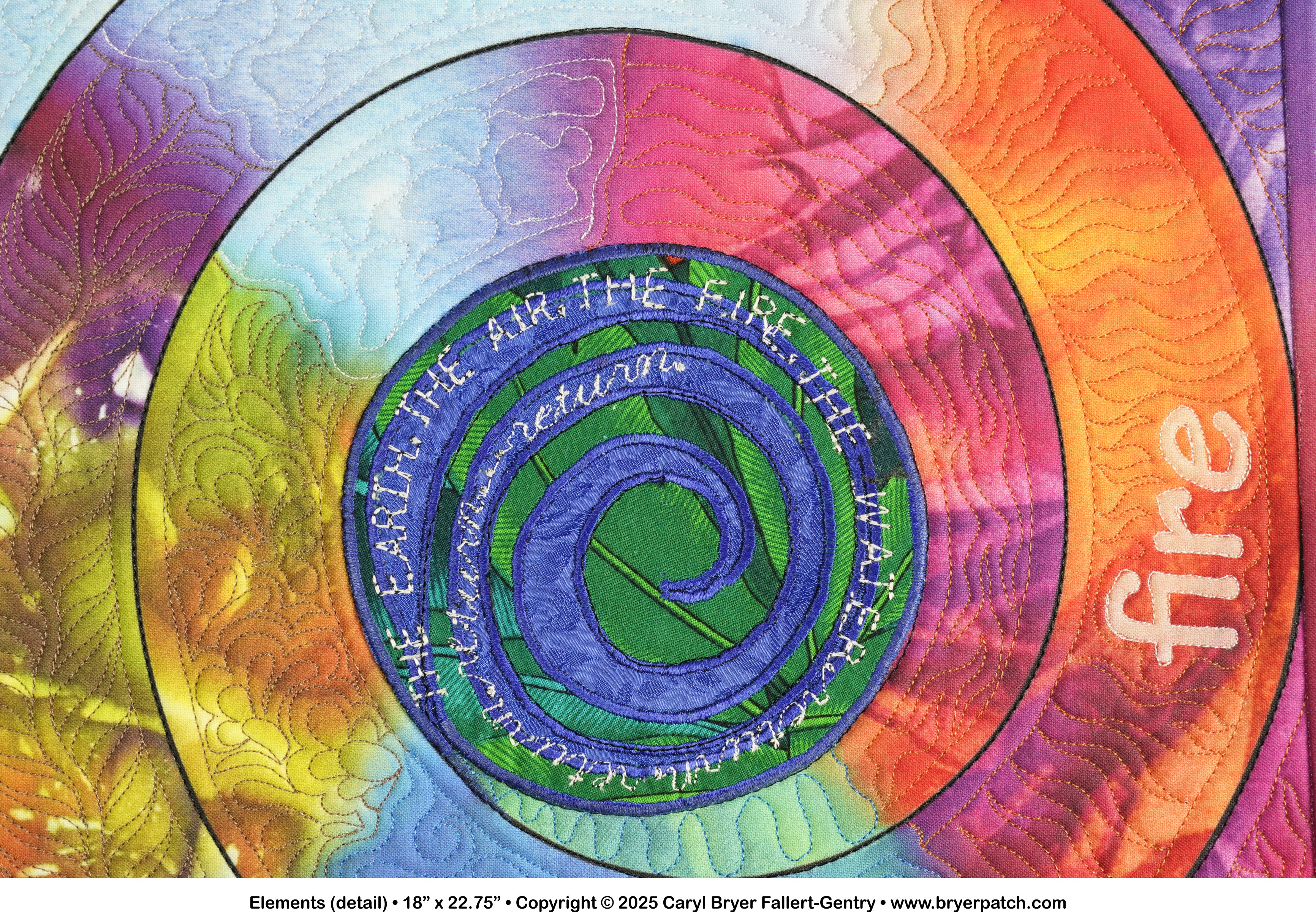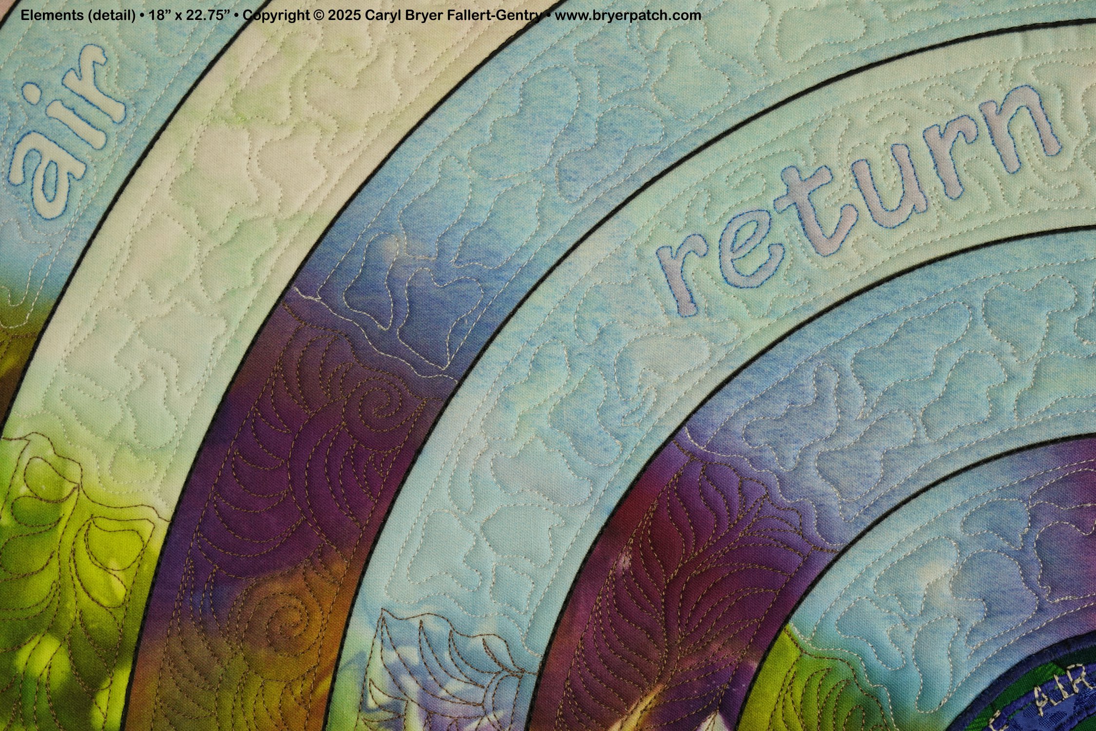 I stitched the polyester spiral onto the background fabric in the center of the spiral then outlined the semitransparent words with stitching. The rest of the spiral was free-motion quilted in patterns that represent the four elements. |