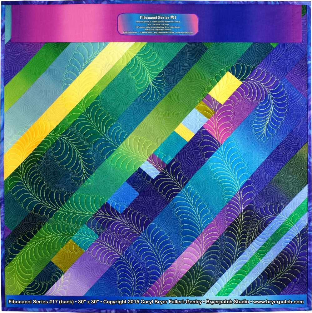 The design for this quilt is based on the orderly progressions of scale, observed in nature by thirteenth century mathematician Leonard Fibonacci. This quilt, including the back was made from leftover strips of fabric from my Gradations collection from Benartex. My goal in this quilt was to use bits of yellow along with shades of blue. The strips were cut into 1.5", 2.5", 3.5" & 5.5" widths to finish in the Fibonacci proportions (1-2-3-5) when sewn together. Each strip was chosen to provide value contrast with the adjoining strip. They were sewn together until the width equaled 30.5". The strip-pieced fabric was cross cut into strips in the same proportions, and every other strip was rotated 180 degrees, so some of the seams line up and other do not. These strips were sewn together until they formed a 30.5" square. One strip was left and this runs diagonally across the back of the quilt, with other fabrics from my gradations collection completing the back. This piece is quilted in spiraling feather patterns stitched with fluorescent yellow top-stitching thread. The negative spaces are quilted with a medium grey #60 thread in all-over fan patterns. |