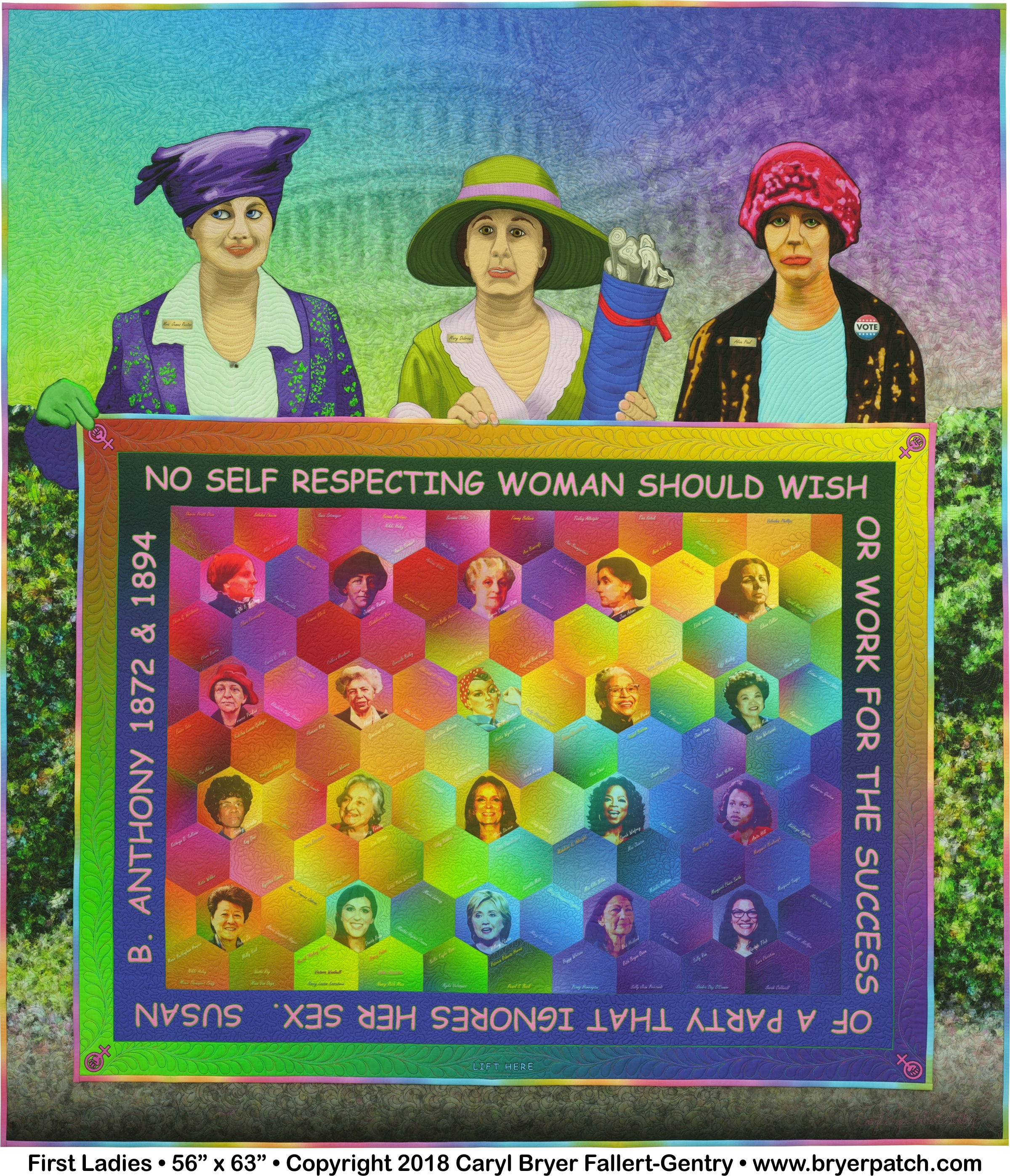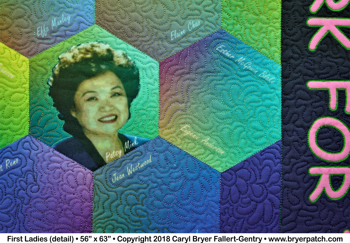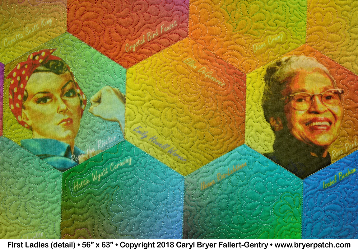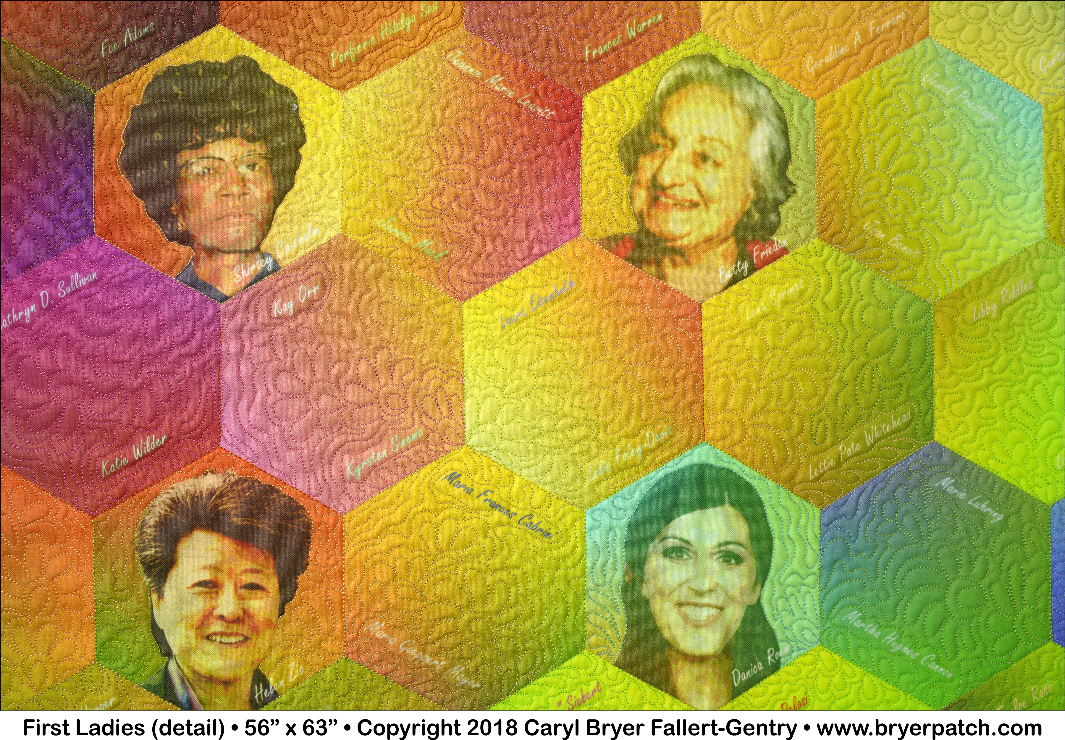 The three women were printed first. The hexagon quilt was printed separately along with the sky fabric and the lower border fabric containing the list of important first ladies. The hands holding the quilt were also printed separately and were the last elements to be added.