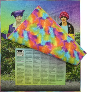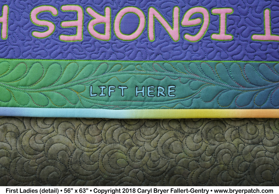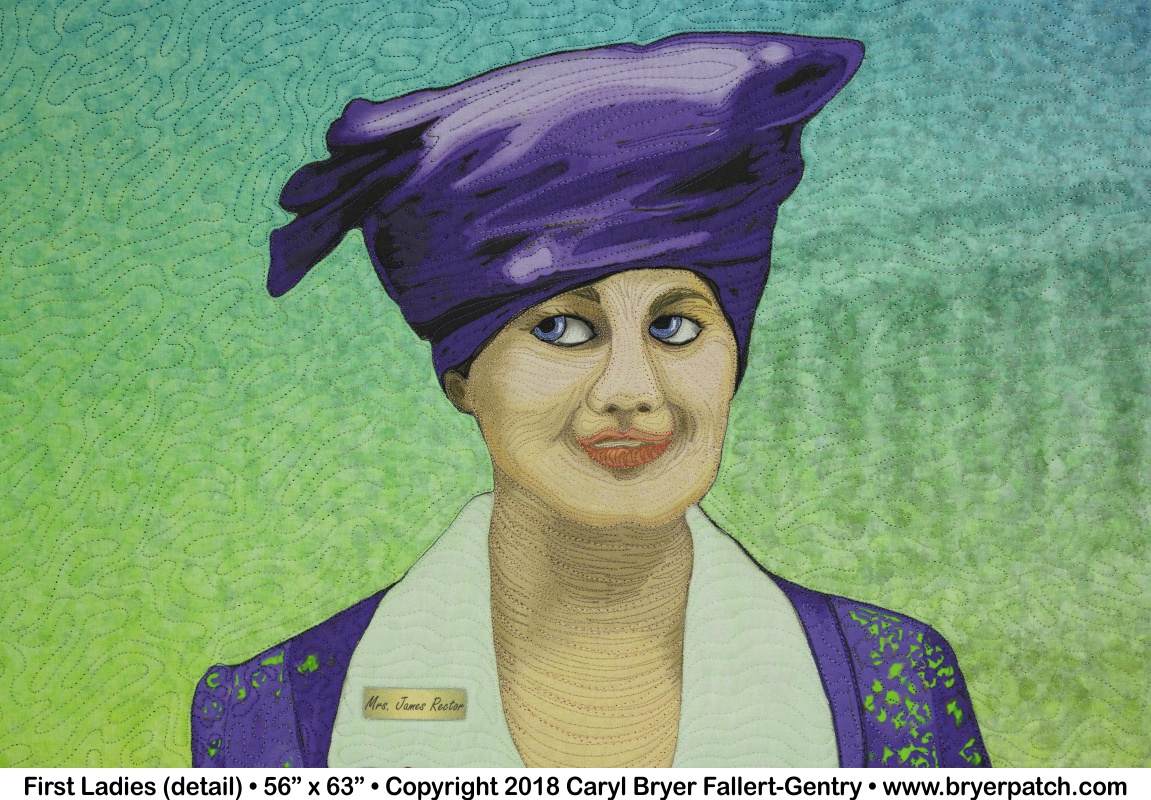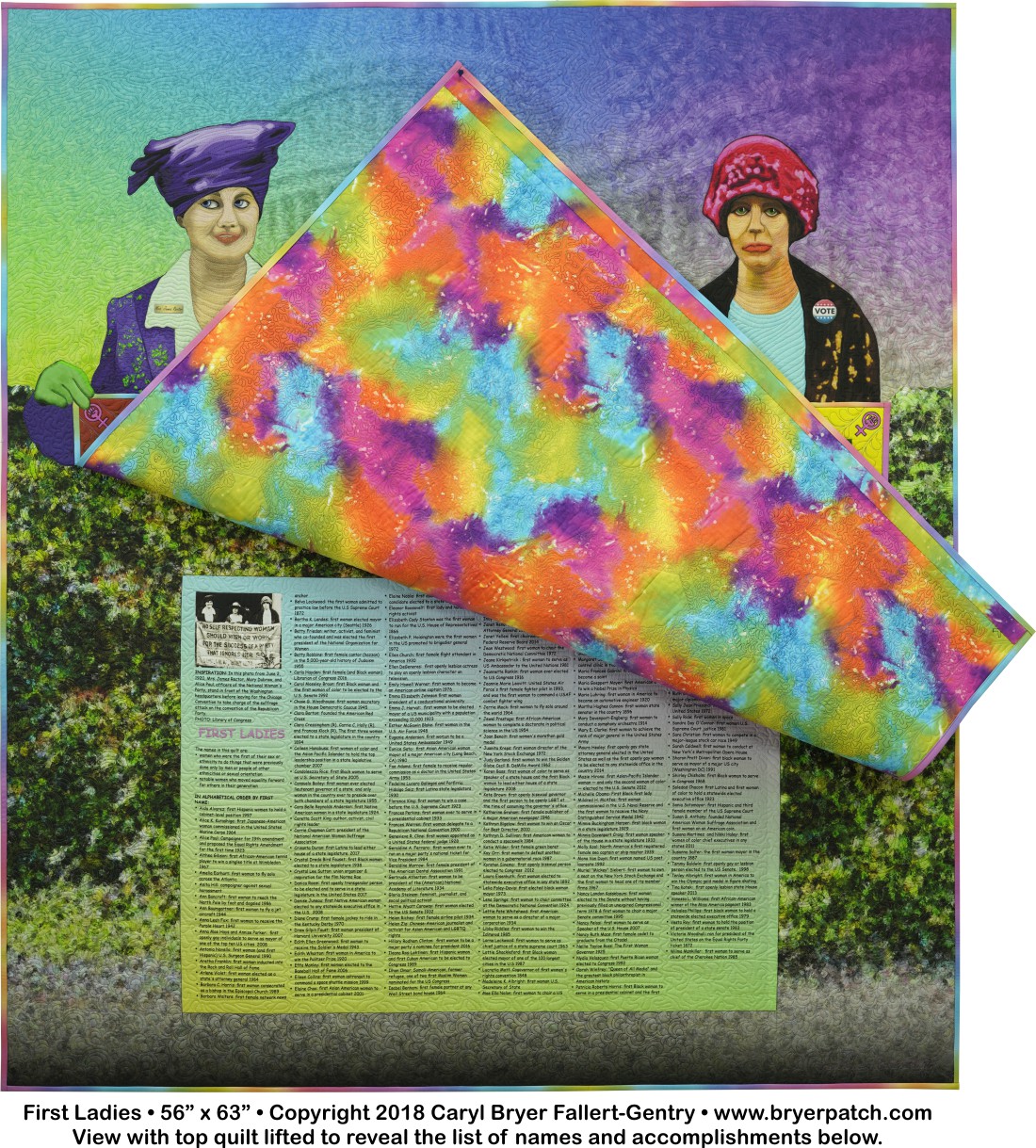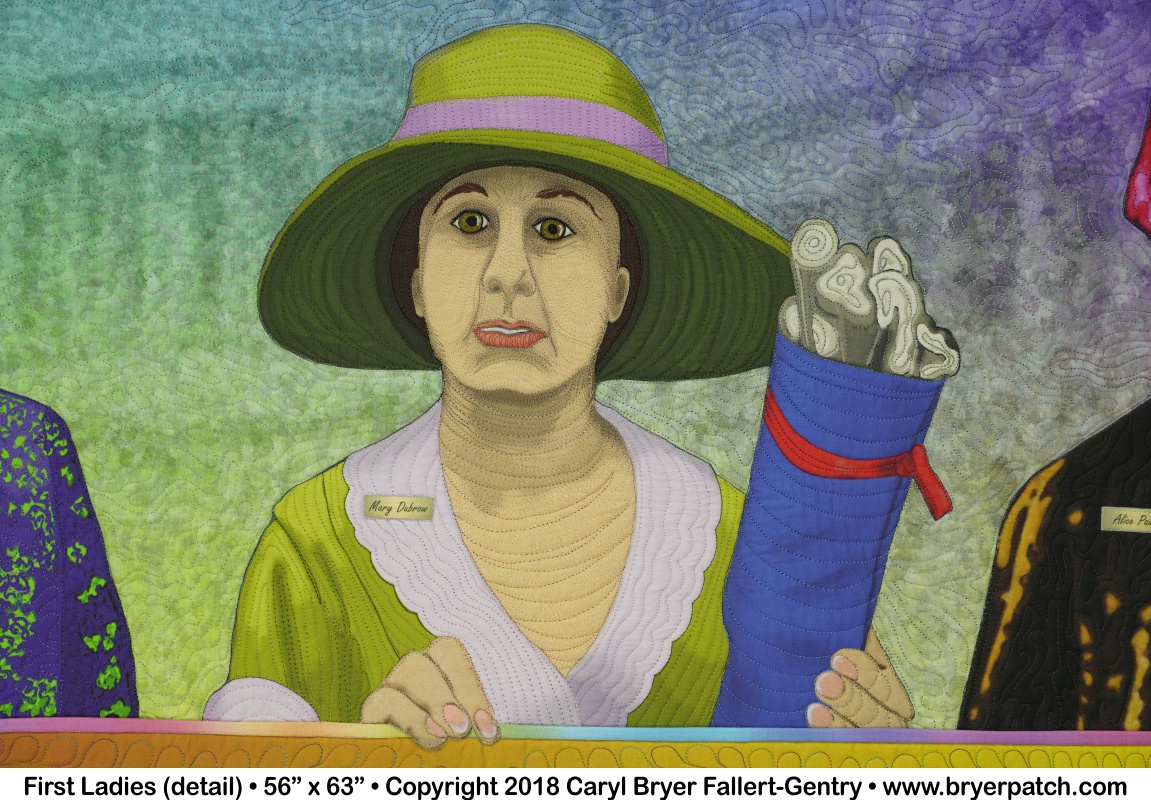The three women were printed first. The hexagon quilt was printed separately along with the sky fabric and the lower border fabric containing the list of important first ladies. The hands holding the quilt were also printed separately and were the last elements to be added.