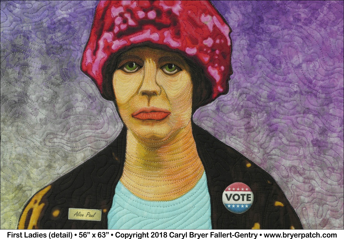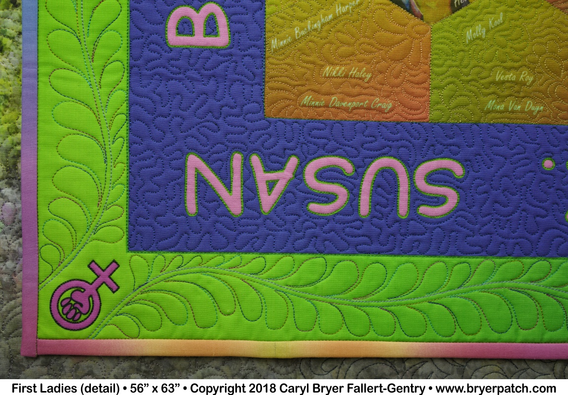 By this time, (Summer of 2018) I had purchased a new "Surface Design Studio" computer that allows me to draw and paint right on the computer screen. I experimented with some of the faces in the old photos and was soon having a very good time playing with all of the brushes, pencils, and unlimited colors available in Corel Photo Paint. I decided to use only the three women actually holding the banner and started my digital paintings with them. Eventually I also made digital paintings of all twenty of the women in the hexagons. For several years I had been meaning to try having some custom fabric printed by Spoonflower but it had not yet reached the top of my to-do list. At this point, the design for First Ladies had grown to the point where Spoonflower seemed like the best solution. Given that decision, I decided to tweak the colors of each hexagon, giving each a subtle ombre of several different colors. I turned the digital drawings of the twenty women into bitmaps and made them semi-transparent, so the images blended with the colors in the hexagons. The colors of the hexagons are arranged, more-or-less, in a gradation of rainbow colors, representing our diversity. The images of the women are arranged in more-or-less chronological order. The quote by Susan B. Anthony dominates the inner border. The outer border has another rainbow gradation, with a pink, "women's power" symbol in each corner. To create the sky behind the three women, I tweaked a texture fill with fuchsia, blue, green, and yellow in the four corners, creating a subtle gradation. On top of this I added a semi-transparent photo of the Capital building in Washington DC. The composite image was turned into a bitmap and texture was added using an "art strokes' function. The Capital building is clearly visible from a distance but can't be detected up close. The green to gray border fabric was a photo of my driveway and garden, also distorted with an "art strokes" function and an added gradation from light to dark at the bottom.