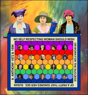 The photo reminded me of quilters holding up a quilt for show and tell, so I grabbed a random photo of an antique quilt and plugged it into the photo. The quilt had 60-degree triangles forming large hexagonal open spaces. It occurred to me that the open spaces could be used to depict some of the women who had moved forward the cause of women's rights, and human rights in general, in the century since the ratification of the 19th amendment. I started making a list of women I could think of who had made significant contributions, trying to find at least two from each of the intervening decades. I came up with twenty names and found pictures of each of them. As the idea progressed I abandoned the design of the antique quilt and designed a quilt center composed entirely of hexagons with the Susan B. Anthony quote in a border surrounding the center. The hexagons are similar to the traditional "Grandmother's Flower Garden" a popular pattern in the 1920's. I plugged pictures of my chosen twenty women into evenly spaced hexagons in my design and showed my design idea to my husband, Ron, who immediately said "why not Madeline Albright?". Well, because she wasn't the first woman to serve as a cabinet officer. That was Frances Perkins, back in the 1930's. There were lots of other women I would have liked to include, and I began doing more research on women who were the first of their gender or ethnicity to do things that were previously done only by men or people of other ethnicities. |
