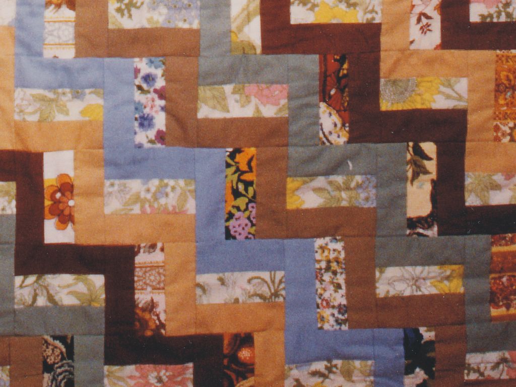 This is my very first quilt, made in 1976. I didn't know very much about quilts or how to make them, so I made a single template out of cardboard and cut out each piece with scissors. The print fabrics are drapery samples from a book of discontinued wallpaper samples. The solid fabrics are heavy "trigger" cotton/poly blends. I laid out the pieces like a knitting pattern and began to sew. The whole quilt was made with 5/8" seam allowances, and when I started to sew the rows together I discovered that accurate cutting and seaming might have made the task easier. I didn't know how to quilt, so I tied it with knitting yarn, using a sheet as a backing. Instead of batting I used an old, very used-up quilt that had been made by my husband's grandmother. It was filled with layers of thin, white, wool, knitted fabric, which I can only conclude, must have been worn out long underwear. The finished patchwork comforter weighs about fifteen pounds, and is very warm even on the coldest nights. |