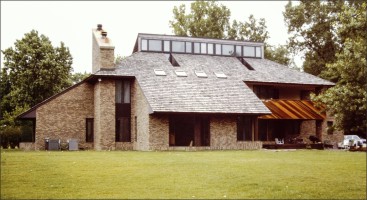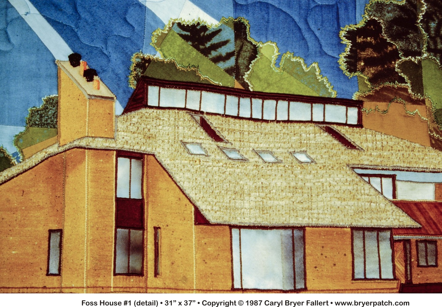 This house portrait quilt was commissioned by the owners of the house, Phil and Debbie Foss, of Lake Forest, Illinois, as a gift for their architect, Richard Deam, of the University of Illinois (Chicago). The house is made of hand painted silk and Herculon upholstery fabric. The landscape fabrics are all hand dyed cottons. The border design is from the patterned redwood ceiling inside the house. A traditional house quilt block and log cabin piecing make up the back of the quilt. |