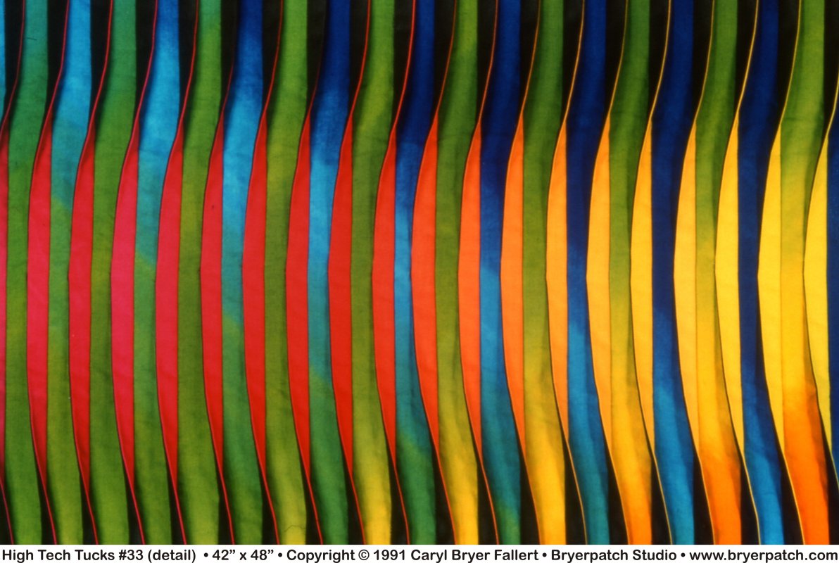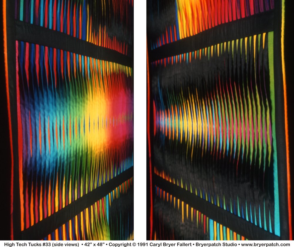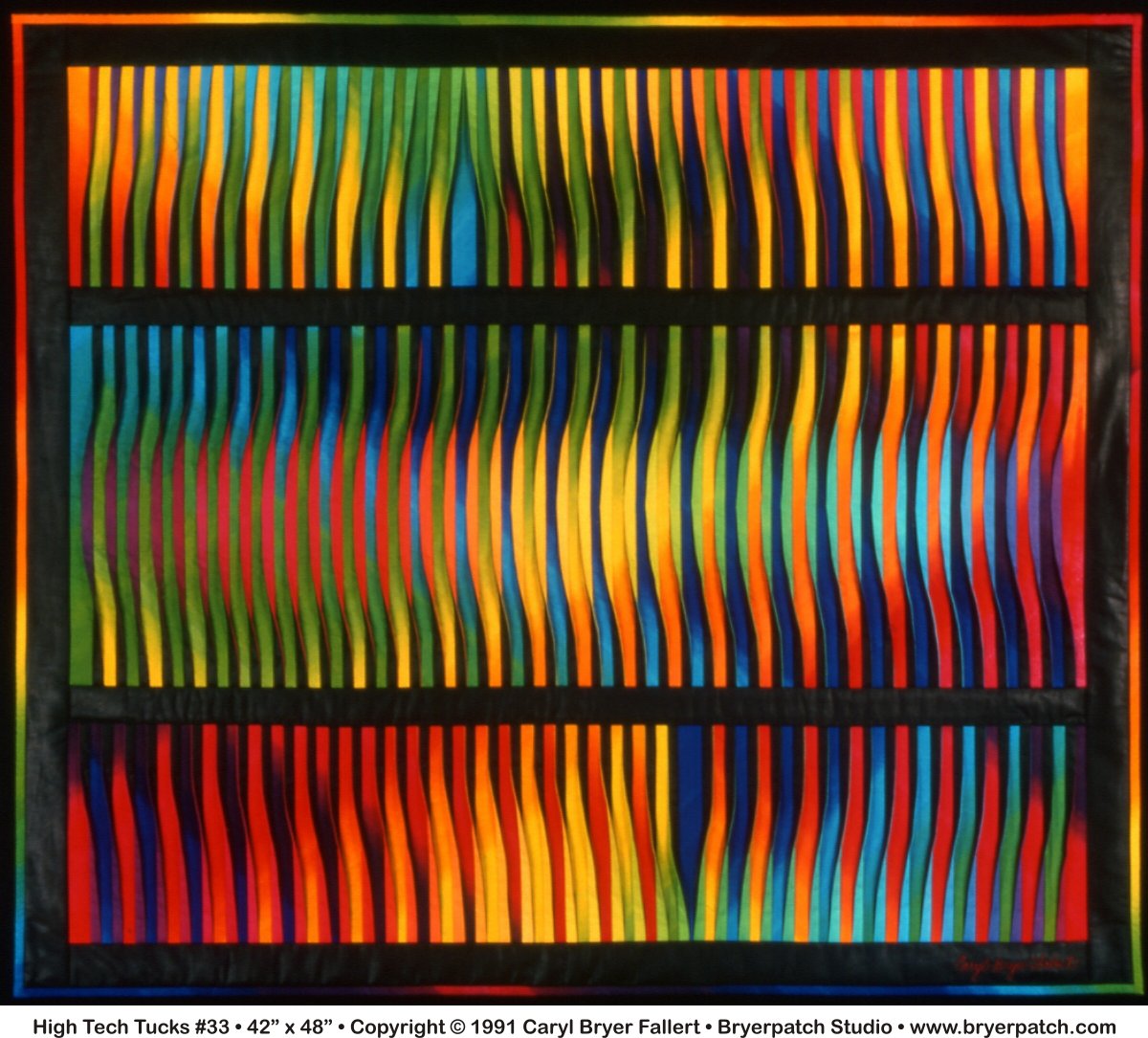 Concept This is one of a series of quilts in which three dimensional, constructed tucks are pieced into a patterned background. The background fabrics were hand painted with fiber reactive dyes in diagonal atripes of rainbow hues. Two different sets of diagonal stripes are alternated, creating the illusion of glowing spots of color coming from an unknown source. The compositing is divided into three horizontal sections, divided and bordered by solid black. The left sides of the tucks are made from a 40 shade gradation of pure rainbow hues. The rights sides are solid black.