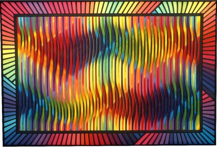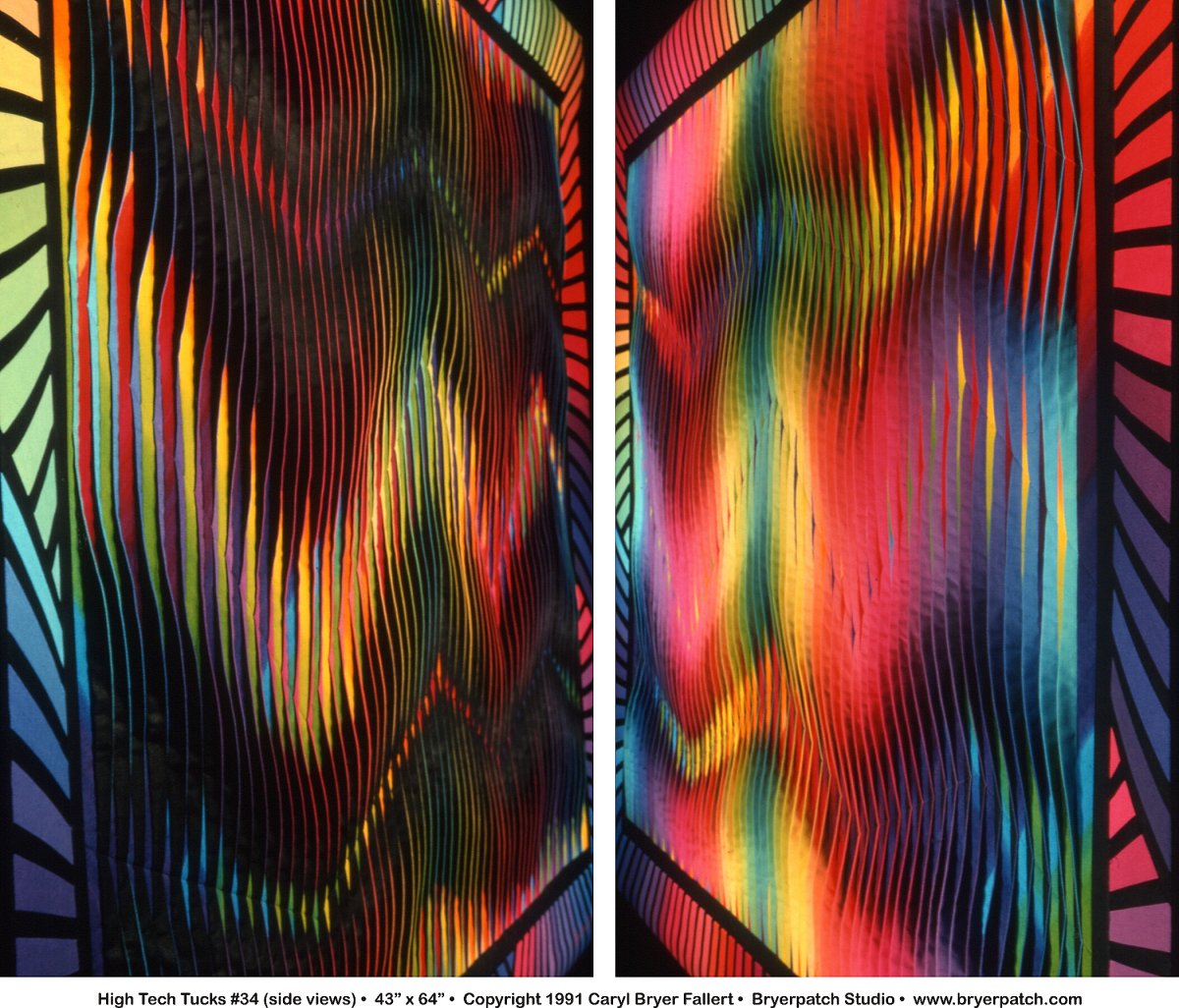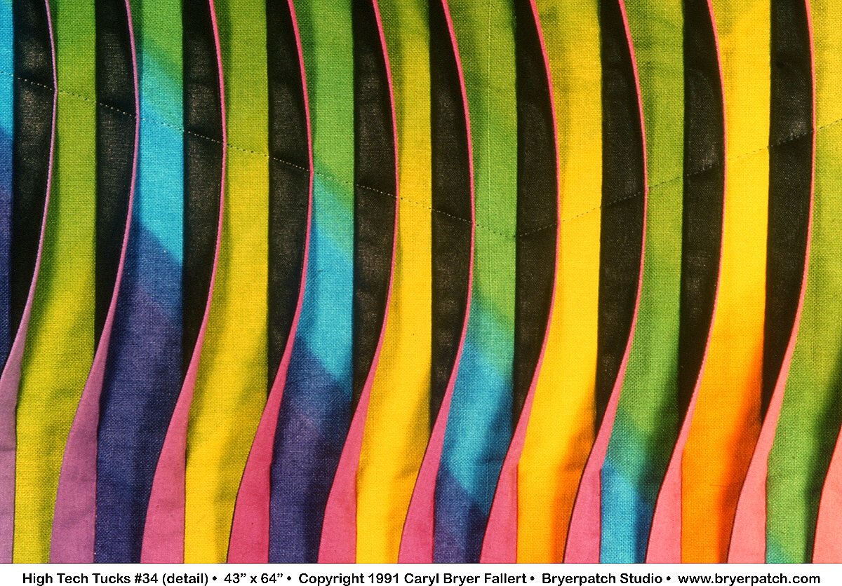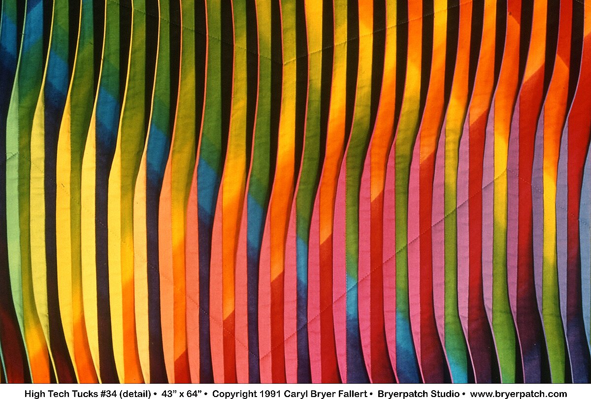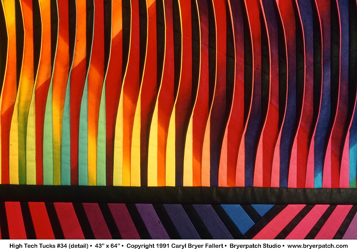 Each of the 1/2" "tucks" were constructed from two different fabrics. The right sides of the tucks are a 26 shade gradation of pure rainbow hues. The left sides of the tucks are black polished cotton. The use of color and value gradations, and the twisting of the tucks from side to side, create the illusion of movement and light across the surface of the quilt.