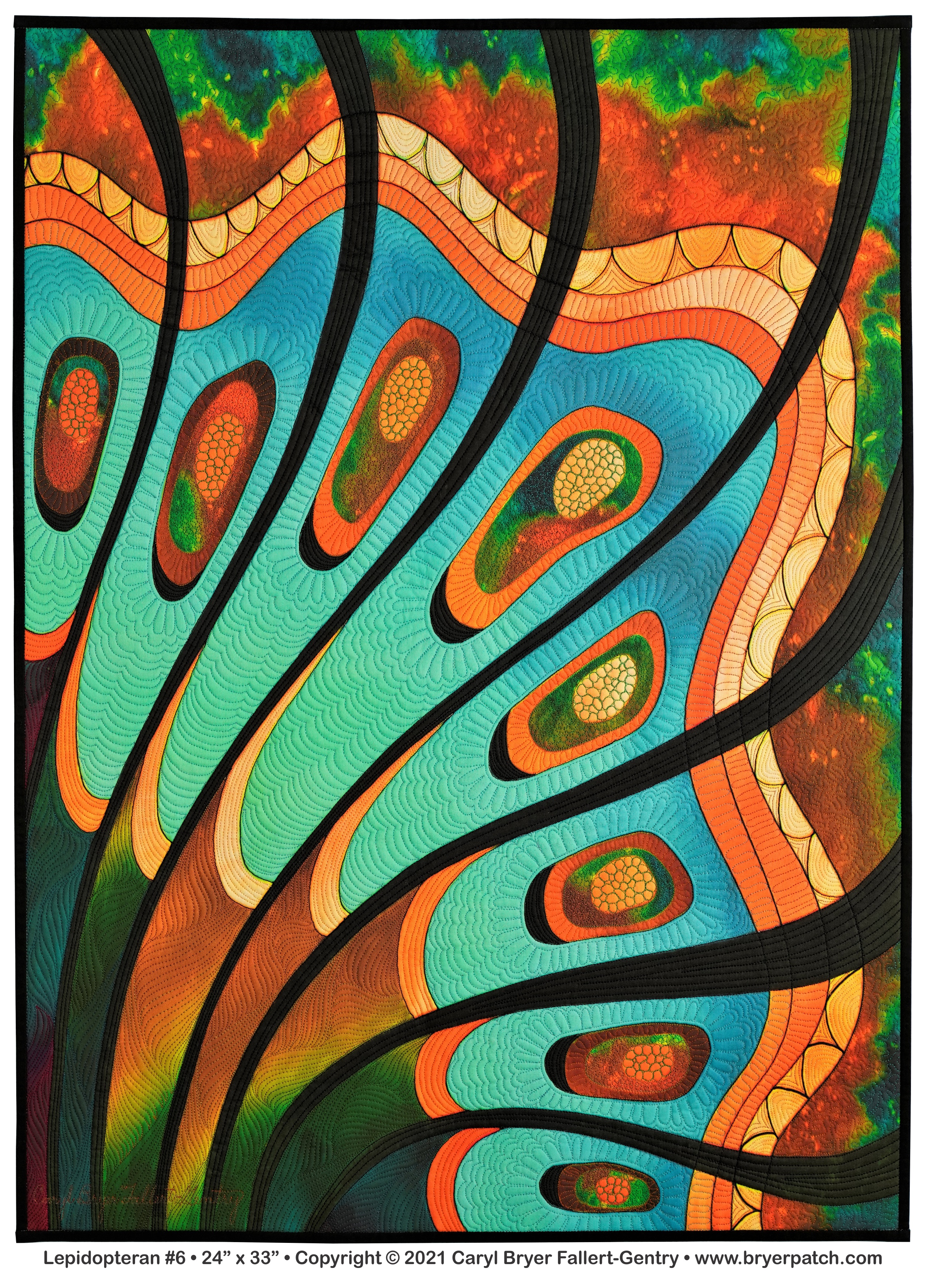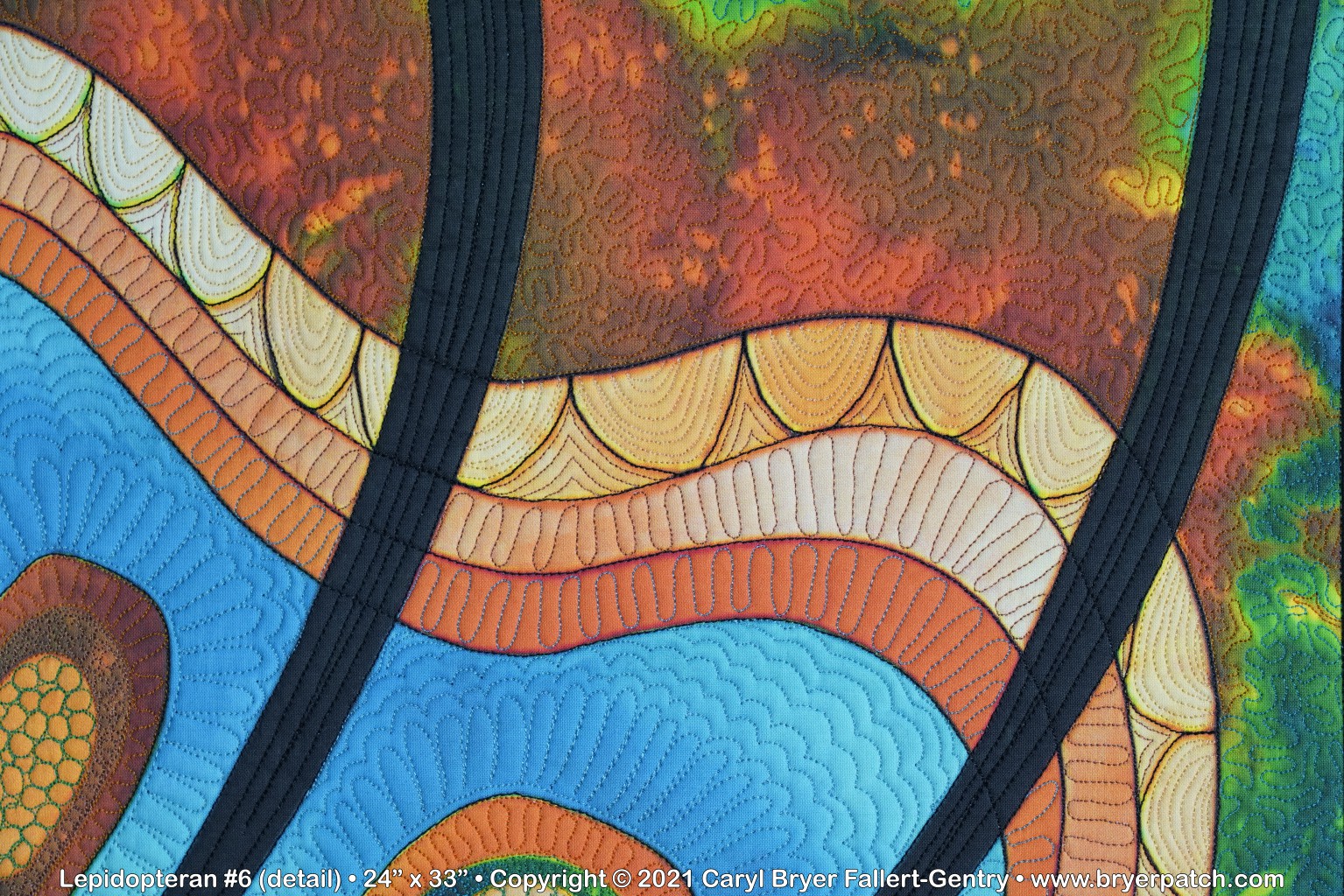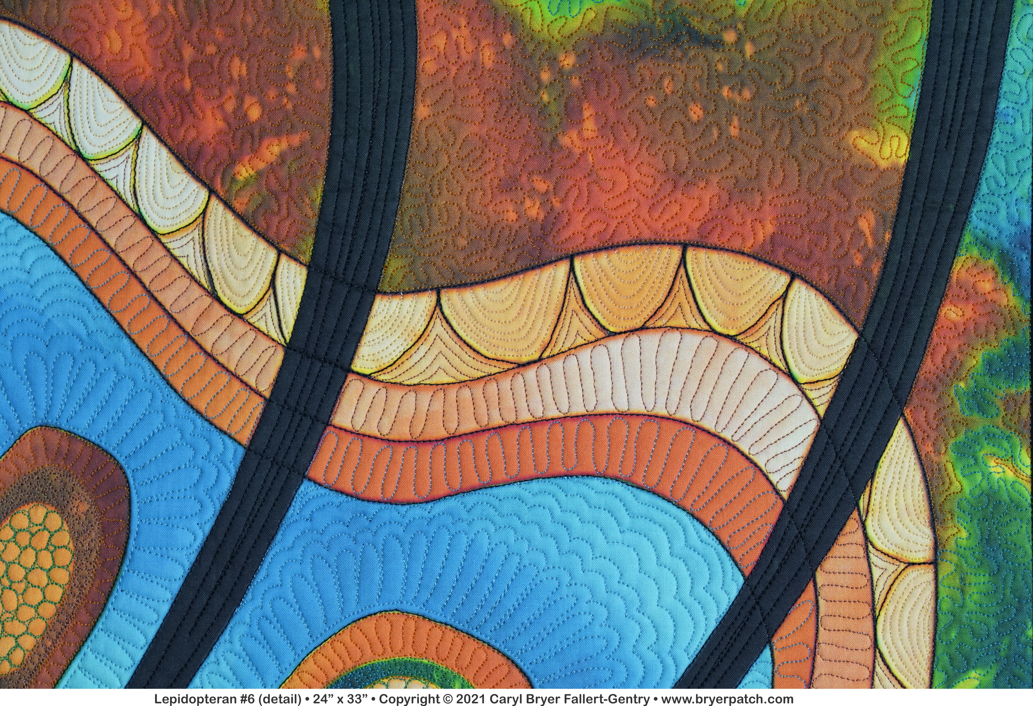 This is an updated version of my 2012 quilt, Lepidopteran #3, which was pieced and appliqued, using fabrics from the various collections I designed for Benartex. The design is based on patterns found on the wings of butterflies and moths. For this piece, I used a photograph of the unquilted top of Lepidopteran #6. All of the colors were changed, and I painted the whole design on my Surface computer, using Corel Photo-Paint. My painted design was printed by Spoonflower and heavily machine quilted with many different colors of polyester and acrylic thread. The backing fabric was hand painted with dye. |