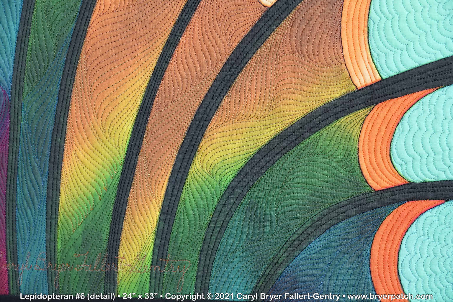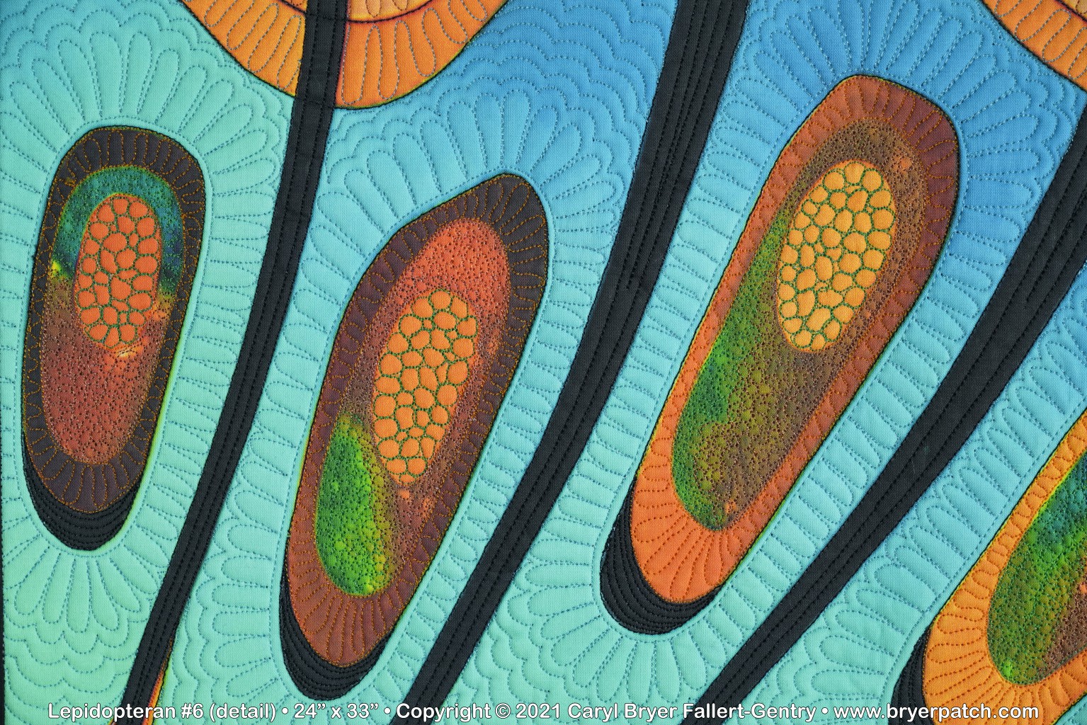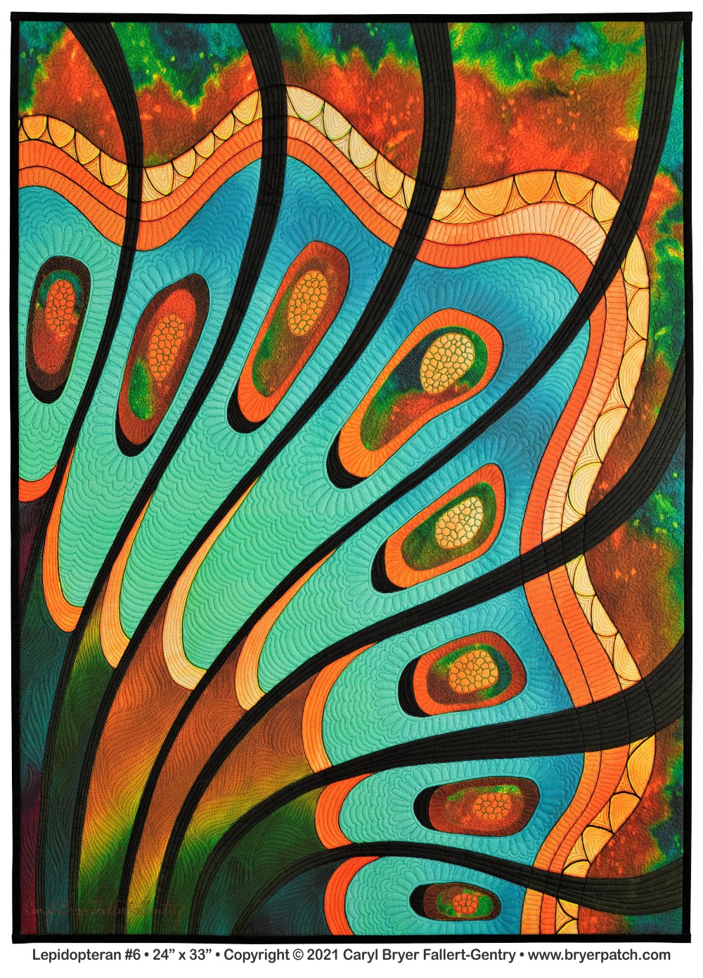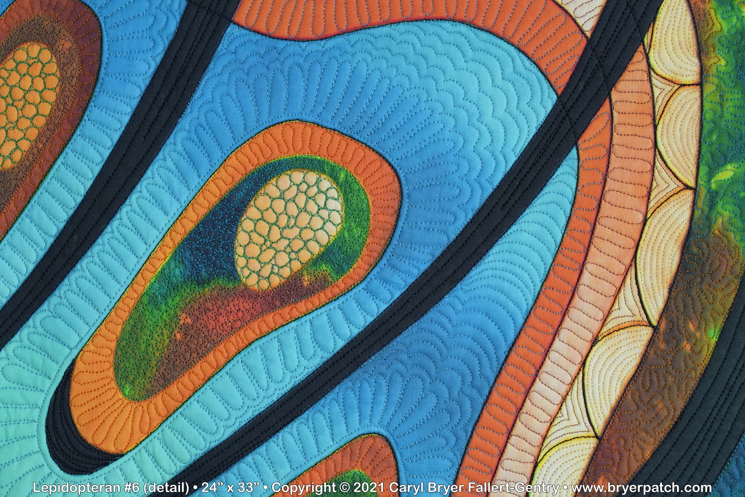 This is an updated version of my 2012 quilt, Lepidopteran #3, which was pieced and appliqued, using fabrics from the various collections I designed for Benartex. The design is based on patterns found on the wings of butterflies and moths. For this piece, I used a photograph of the unquilted top of Lepidopteran #6. All of the colors were changed, and I painted the whole design on my Surface computer, using Corel Photo-Paint. My painted design was printed by Spoonflower and heavily machine quilted with many different colors of polyester and acrylic thread. The backing fabric was hand painted with dye. |
