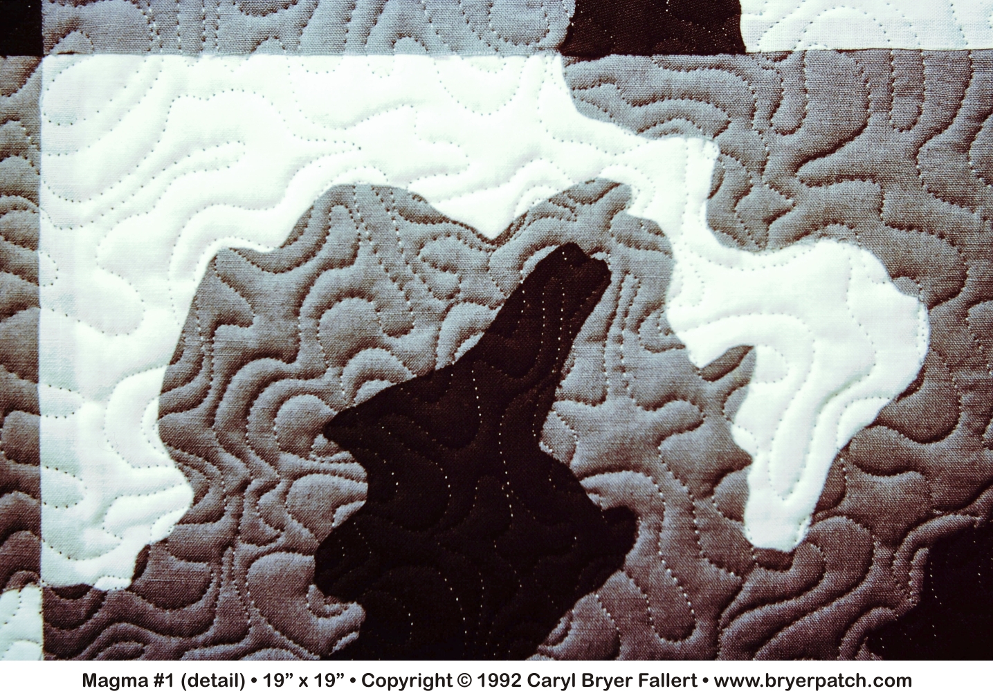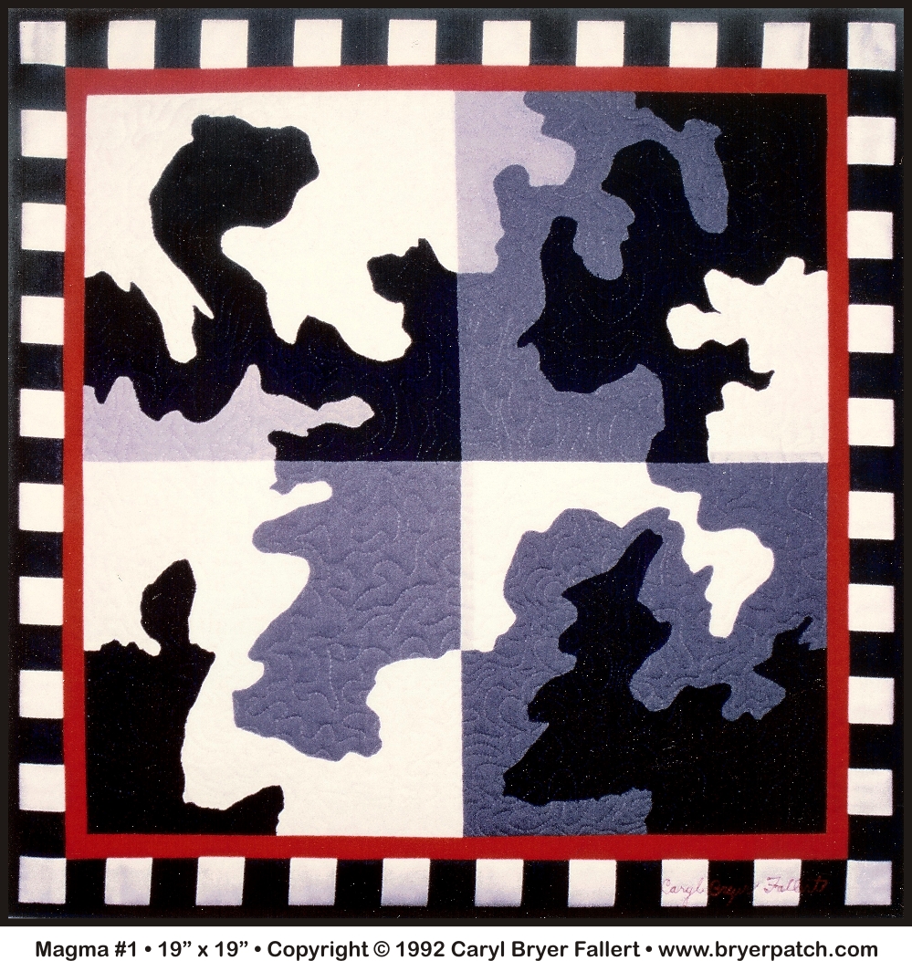 This is the first of a series of quilts inspired by the contours of the earth as seen from an airplane. Five shades of black white and gray were cut into contoured shapes and fused onto cotton batting. The composition was then quilted in lines that echo the contoured design. A narrow red border surrounds the center square, followed by a second border of large black and white checks. |