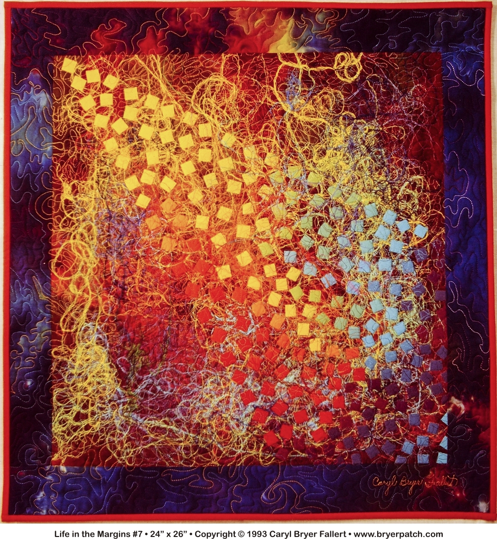 Life in the Margins #7 is part of a series of small works in which my process is very much like doodling with fabric, i.e.. the design was developed spontaneously, working directly on a background, with bits of fabric and thread. Each part of the design grew out of the last, just as a doodle grows to fill a page, when the mind is engaged elsewhere.