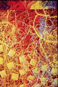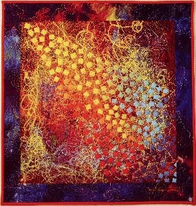 The background fabric was hand painted with fiber reactive dye. Threads in various colors were arranged on the painted fabric. Small rectangles of fabric left over from other projects were laid on top of the threads in a wedge shaped pattern, and bits of thread were arranged over them. The layers of fabric bits and thread were then machine stitched with various colors of thread. Several layers were built up on the background before the design was complete. Shadows of the first layers can be seen through the spaces in the top layers.