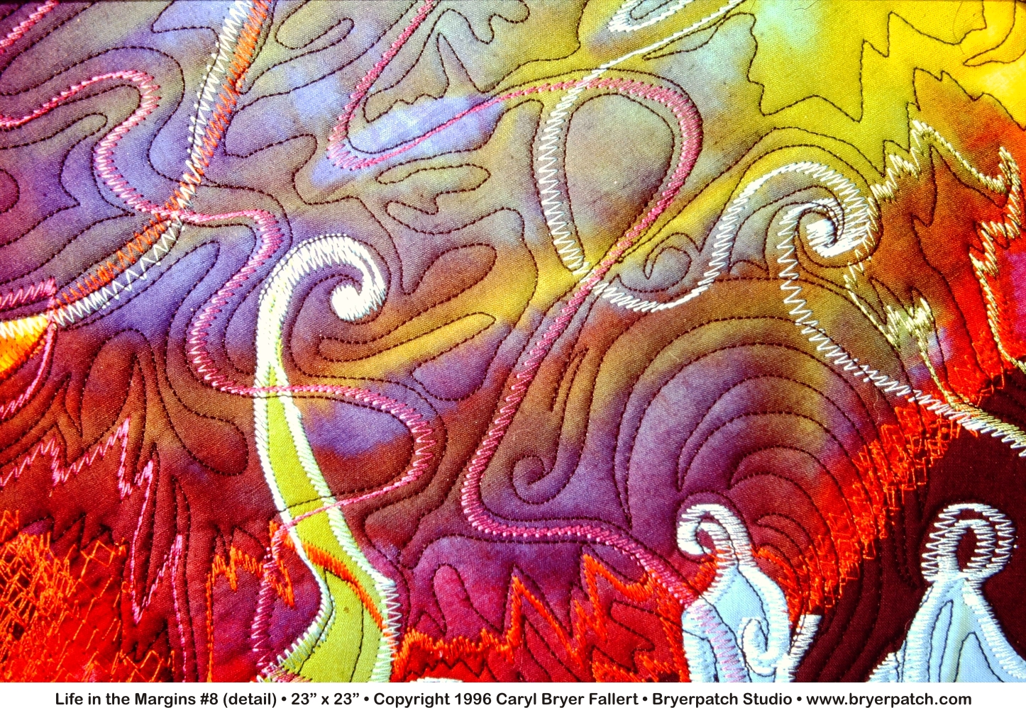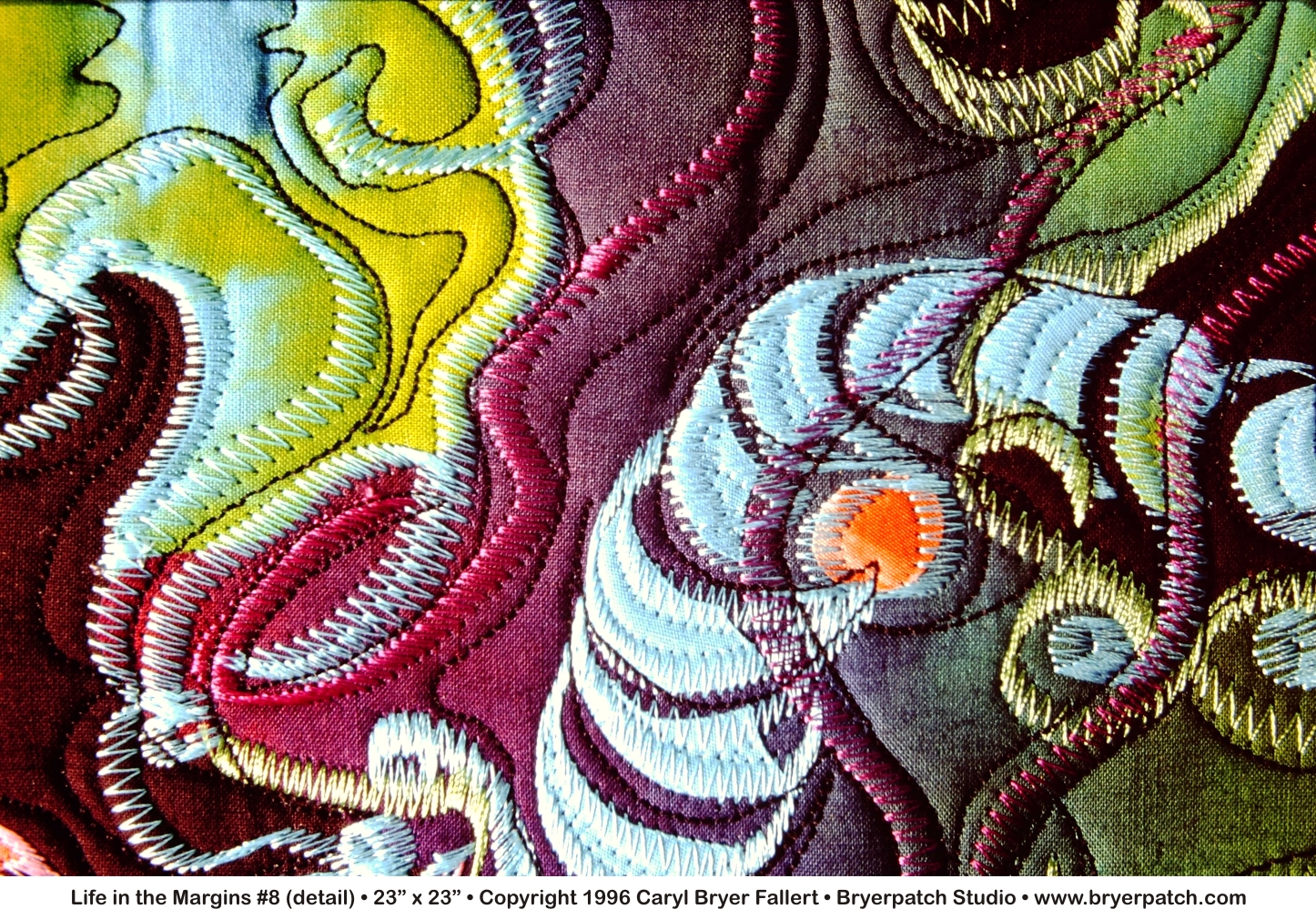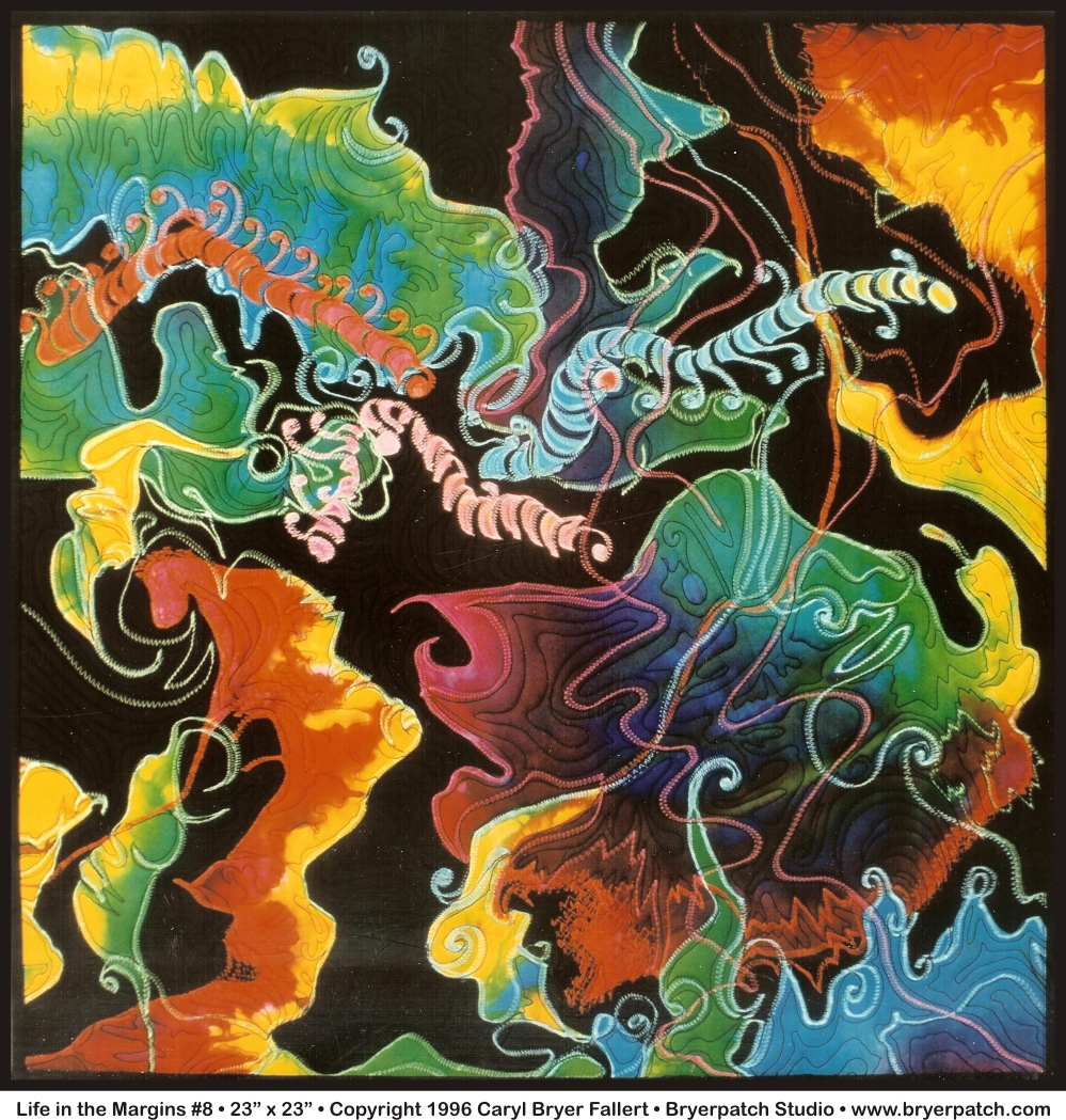 LIFE IN THE MARGINS #8 is one of a series of small works in which my process is very much like doodling with fabric, i.e. The design was developed spontaneously, working directly on a black background, with bits of hand painted fabric randomly cut, and arranged layer upon layer. After the fabric was arranged on the background, machine embroidery was added in a style I call "drawing with thread." Each part of the design grew out of the last, just as a doodle grows to fill a page, when the mind is engaged elsewhere. As a child, all the margins of my school notebooks were filled with doodles, thus the title of this series— "Life in the Margins." This composition was machine quilted and finished with a solid black binding. |