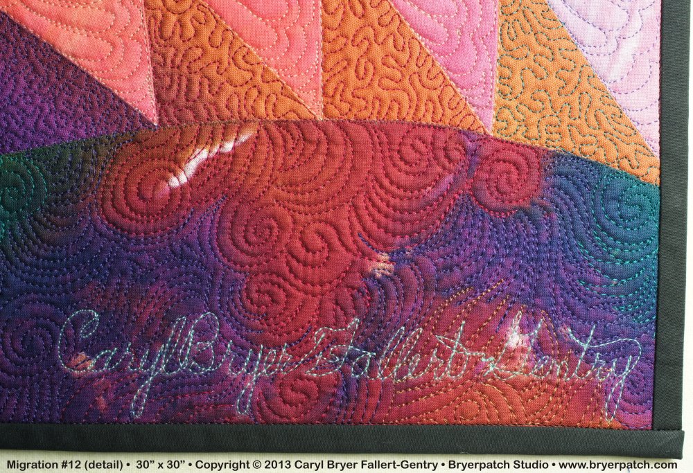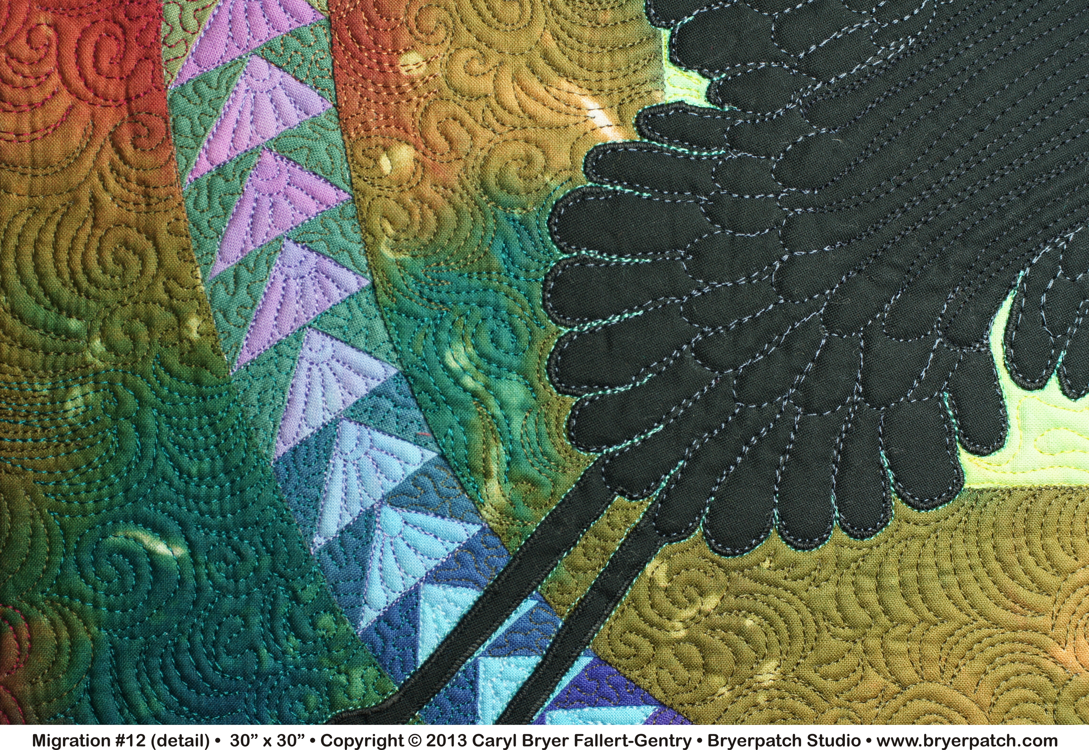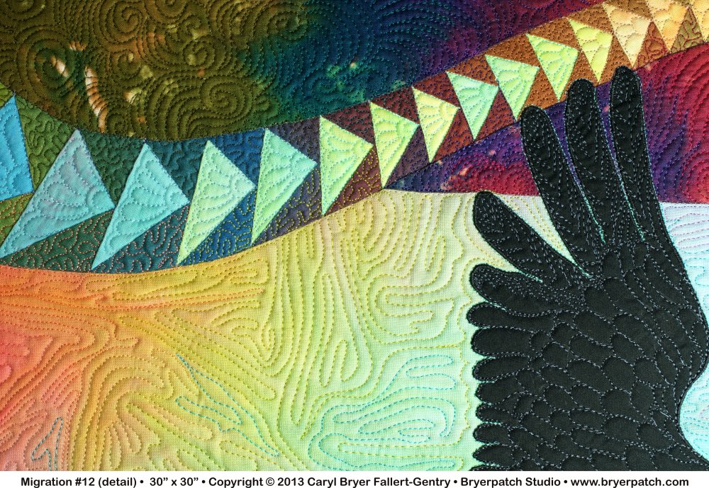 The quilting was done with many different colors of top stitching thread in colors that blend with the background fabrics. A “Caryl Flower”, one of my signature quilting patterns, was quilted into each goose triangle. The black birds, whose species is intentionally ambiguous, are quilted in charcoal grey. They are also outlined in light blue thread to create contrast and make them stand out. |