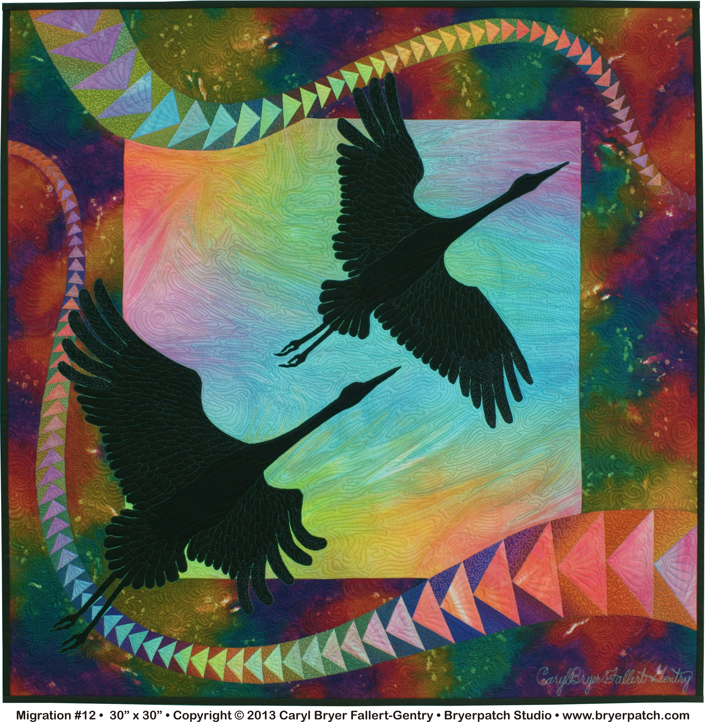 In January of 2013, I married Dr. Ron Gentry in a private ceremony at The National Quilt Museum. Our ceremony was held in front of my 1995 AQS Best of Show quilt, Migration #2, which has 21 black birds flying from the bottom right corner to the top left corner. We chose this piece as a backdrop because we have become migratory humans, spending half of the year in Paducah KY, and half in Port Townsend, WA. This quilt, a miniature version of Migration #2, has only two black birds, and was made to hang at our April, 2013 reception to celebrate our marriage.