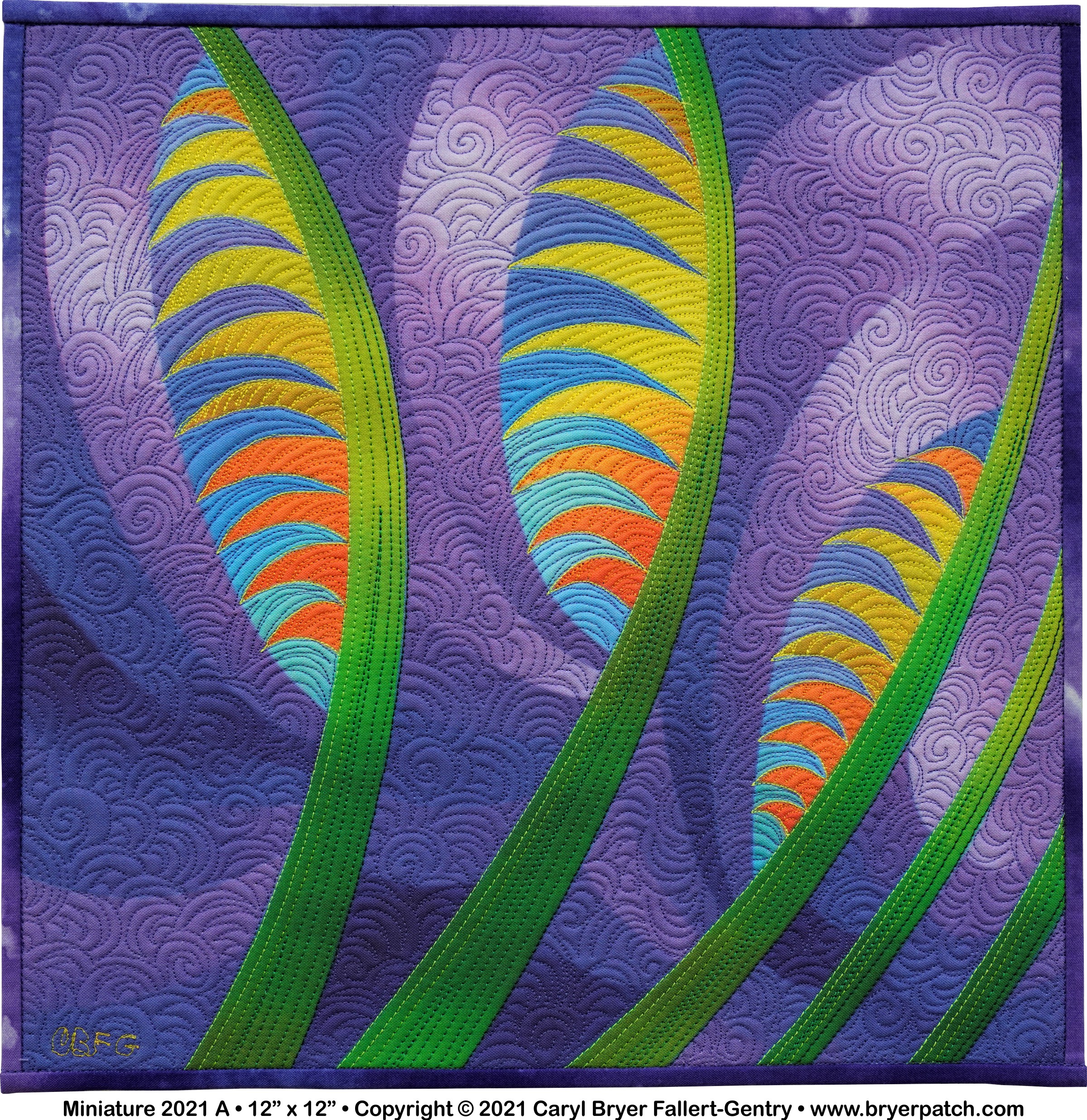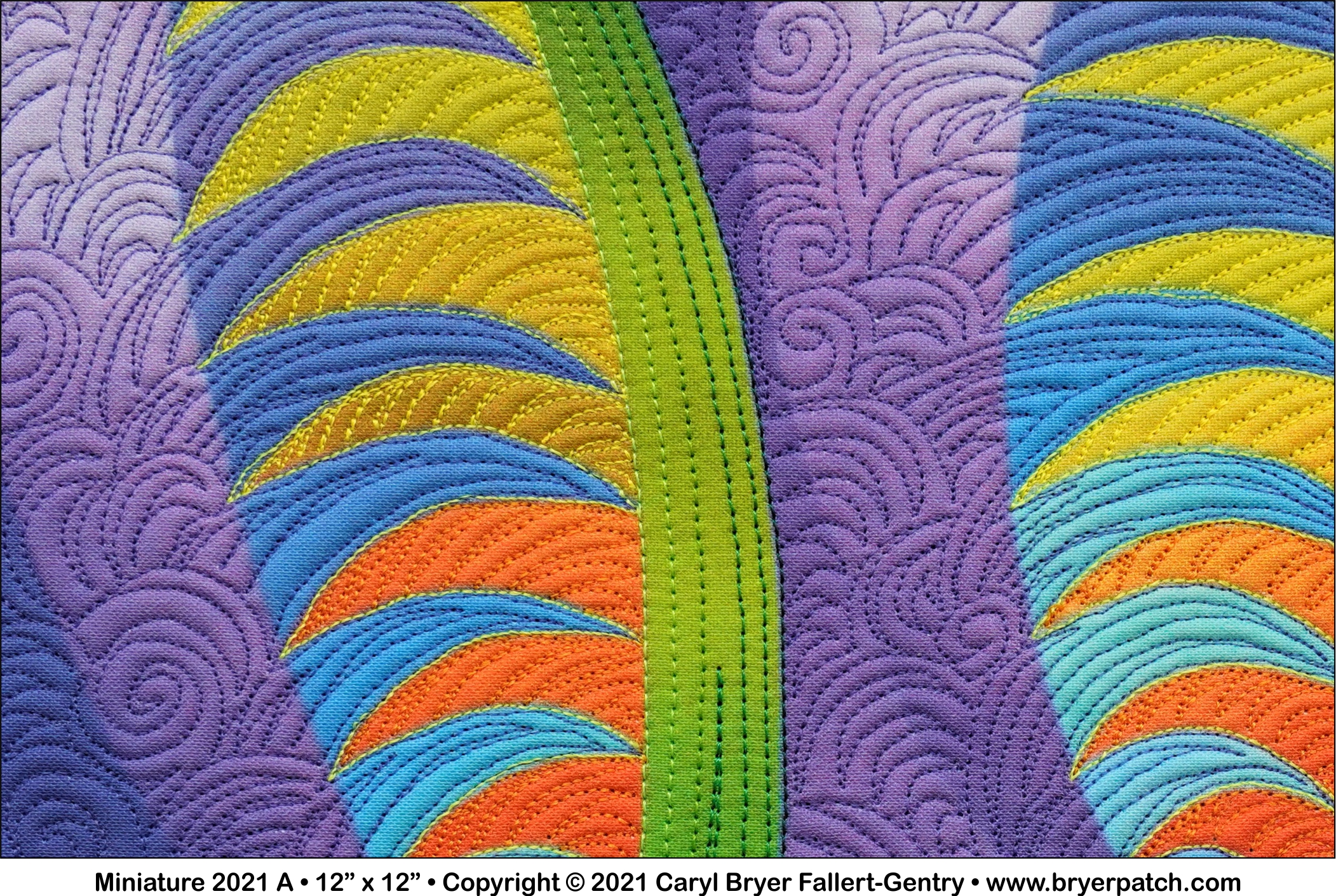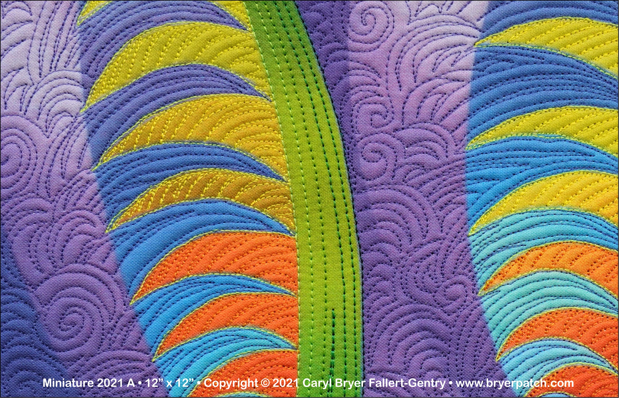 This one a series of miniatures based on my previous original designs. This is based on my feather study series. The unquilted top for my 2012 quilt, Feather Study #33, was photographed and digitally altered in Corel Draw. The colors, shape, and size were all changed, and the design was printed on cotton fabric by Spoonflower. It was machine quilted with many different colors of thread. The backing fabric is from one of my collections for Benartex.
