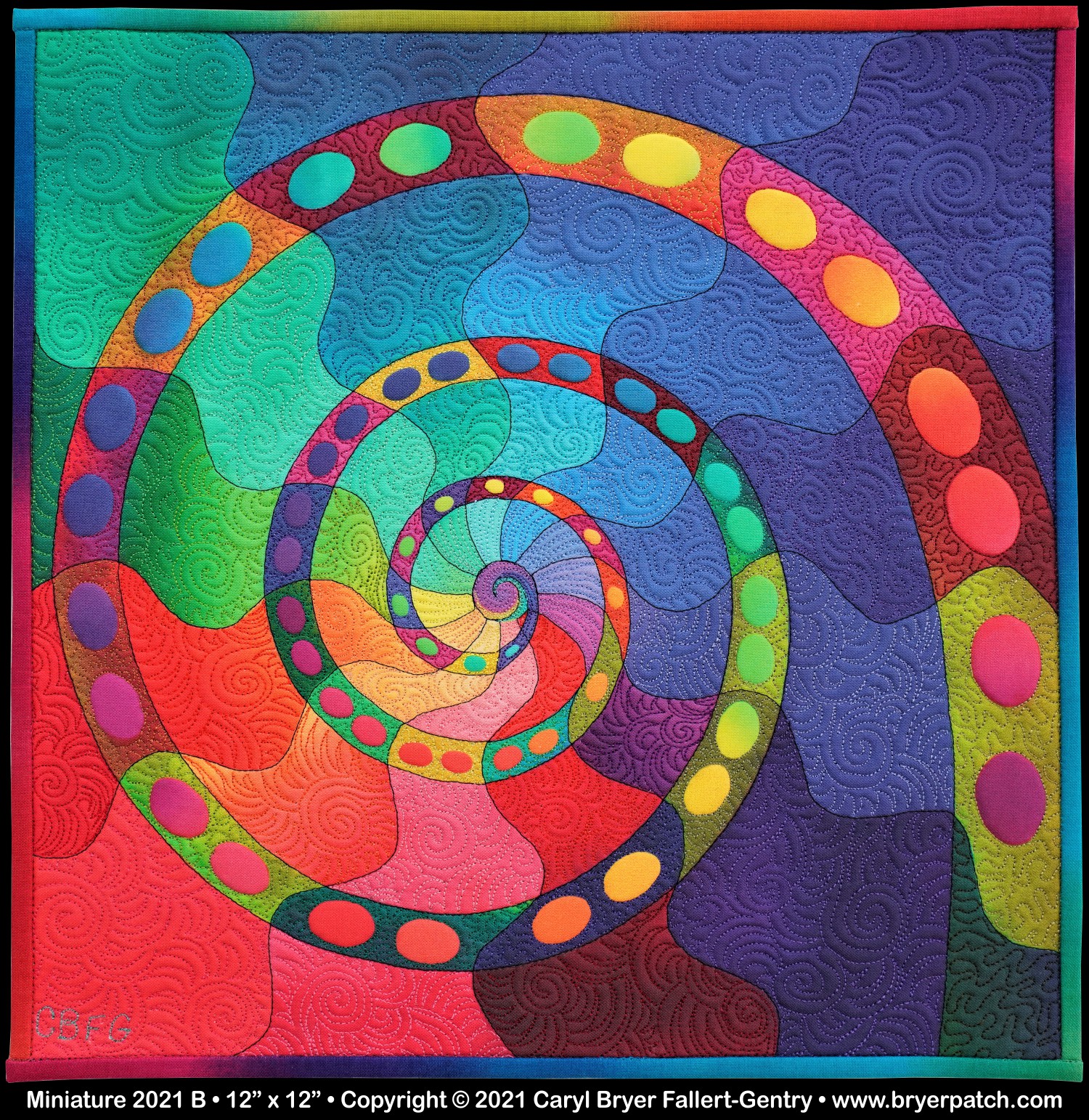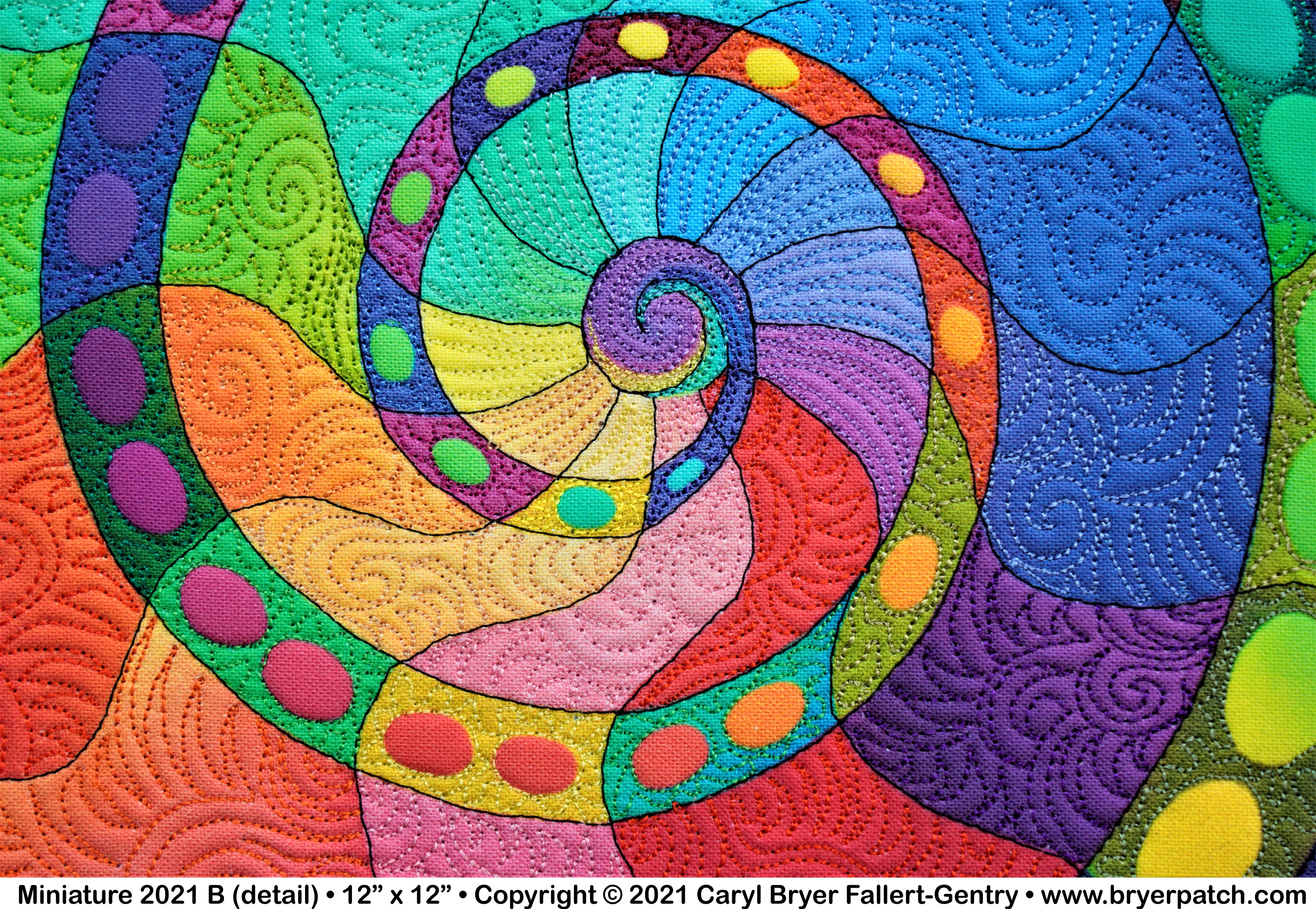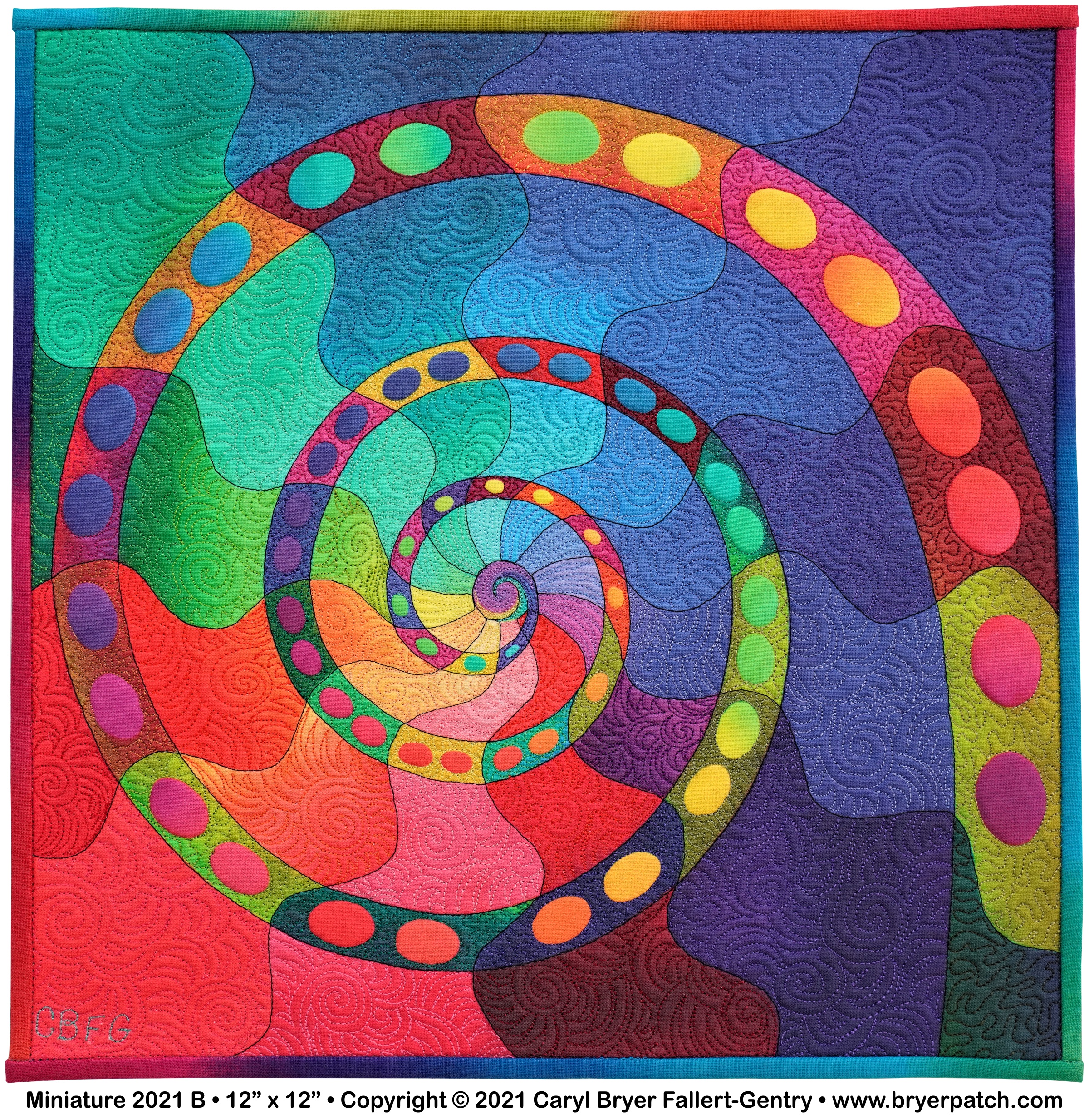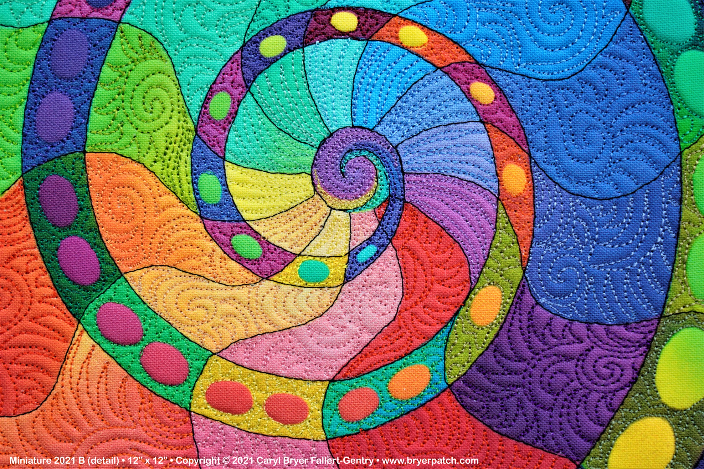 This one a series of miniatures based on my previous original designs. This is based on my Spirogyra series. The unquilted top for my 2012 quilt, Spirogyra #5, was photographed and digitally painted in Corel Draw. The colors, shape, and size were all changed, and the design was printed on cotton fabric by Spoonflower. It was machine quilted with many different colors of thread. The backing fabric is from one of my collections for Benartex.