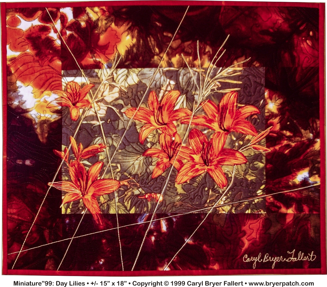 This is one of a long series of miniature quilts I have made. It was one of my first experiments with ink jet printing on fabric. The center panel is my original photograph of the day lilies that grew under the fence at our home in Oswego, Illinois. The border is a fabric that I painted with dye. The quilting extends the lines from the photograph out into the border. |