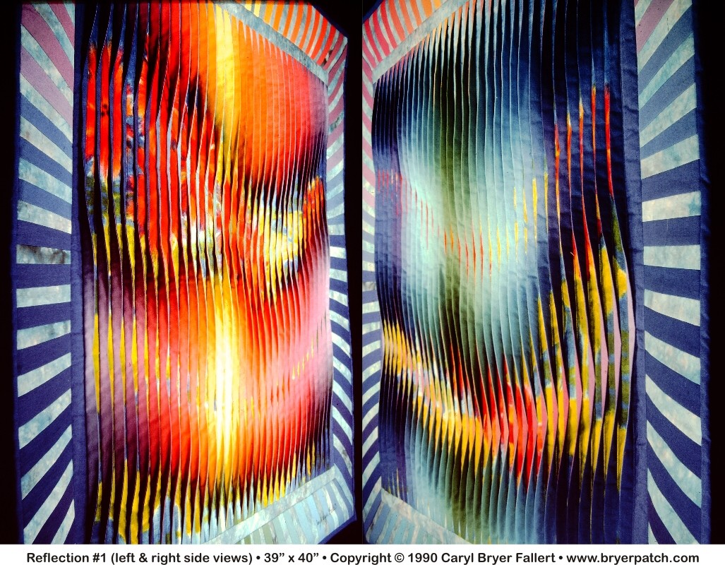 A radiating, string pieced border draws the eye into the three dimensional center panel. It is constructed of alternating strips of painted fabric and the color gradations used to make the tucks. |