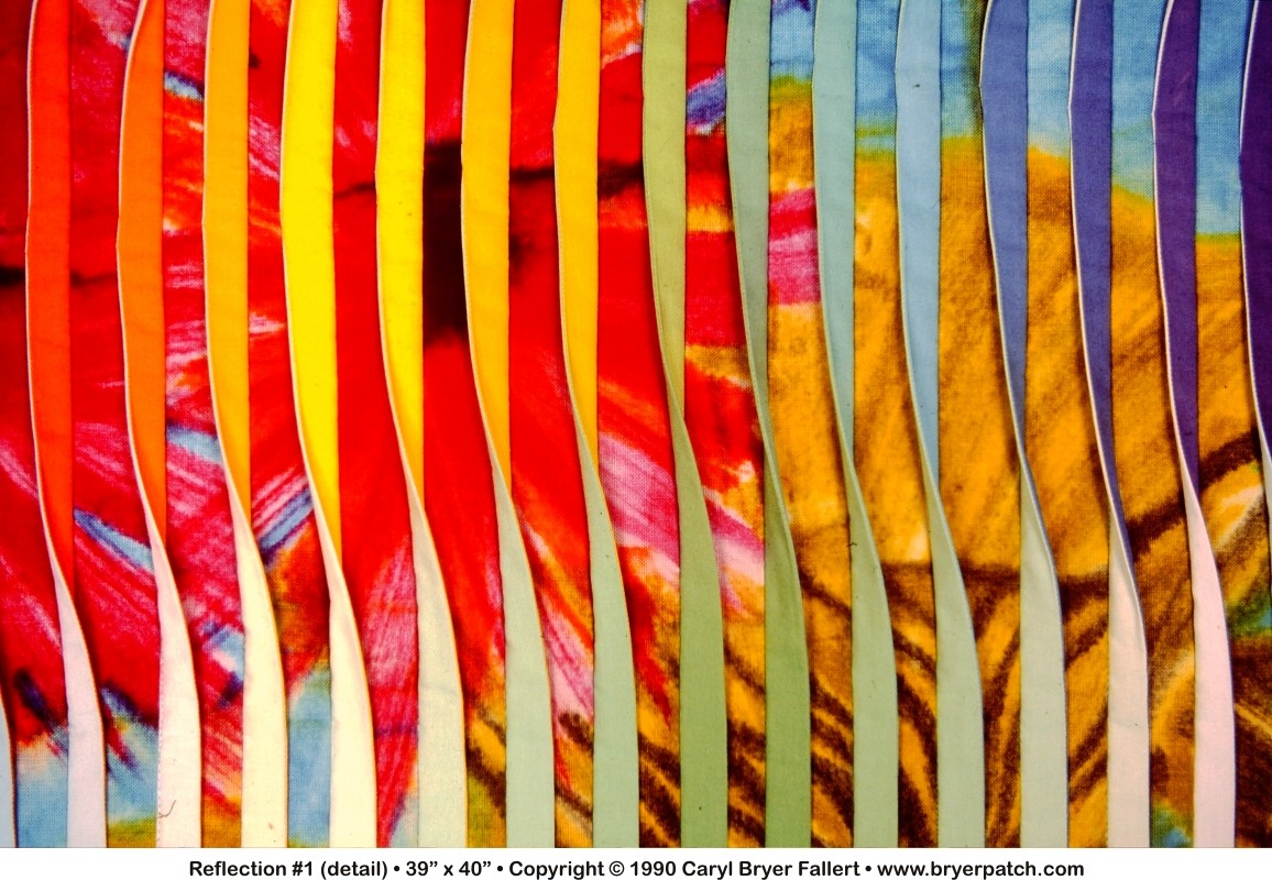 Each of the ½" "tucks" was constructed from two different fabrics. The left sides of the tucks were made from fabrics dyed in a gradation of warm colors, from purple to red to yellow, the warm hues of the flowers. The right sides of the tucks were dyed in a gradation of colors from purple to blue to green, the cool hues of the water. The use of color gradations, and the twisting of the tucks from side to side, create the illusion of movement and light across the surface of the quilt.