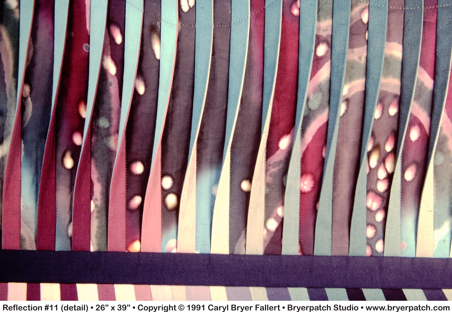 Each of the 1/2" "tucks" was constructed from two different fabrics. The right sides of the tucks were made from fabrics dyed in a gradation of light to dark purple and turquoise. The left sides of the tucks were dyed in a gradation from turquoise to black. The use of color gradations, and the twisting of the tucks from side to side, create the illusion of movement and light across the surface of the quilt.