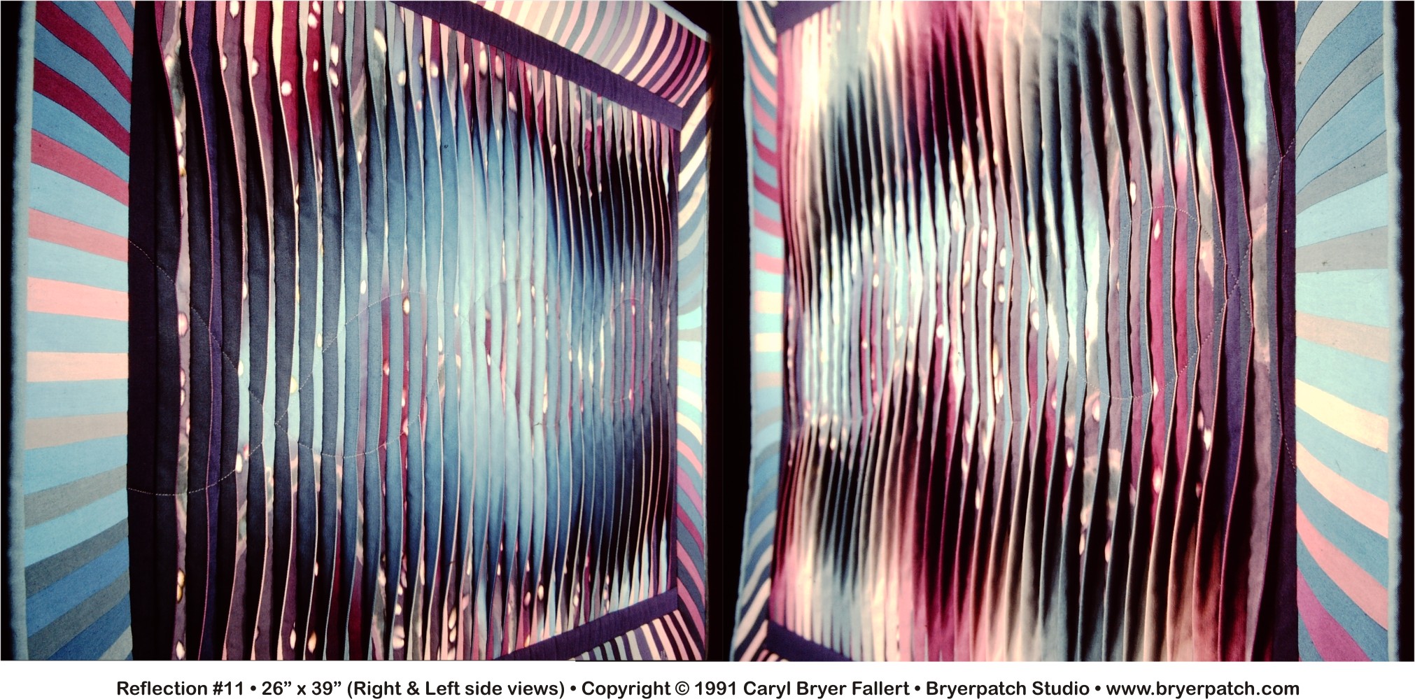 A radiating, string pieced border draws the eye into the three dimensional center panel. It is constructed of alternating strips of the color gradations used to make the tucks. |