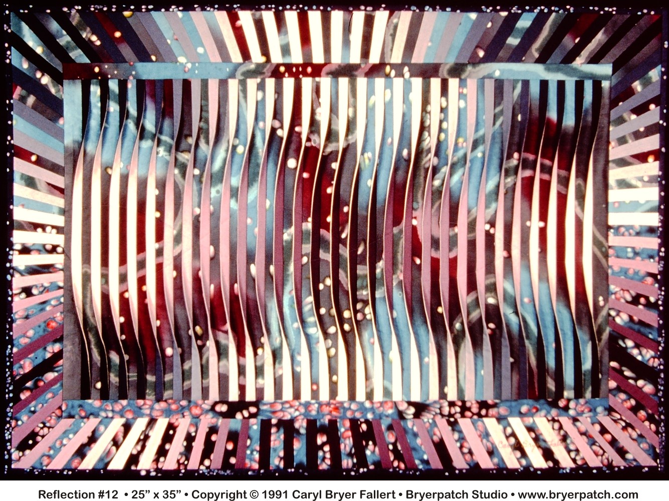 A radiating, string pieced border draws the eye into the three dimensional center panel. It is constructed of alternating strips of background fabric and the color gradations used to make the tucks. |