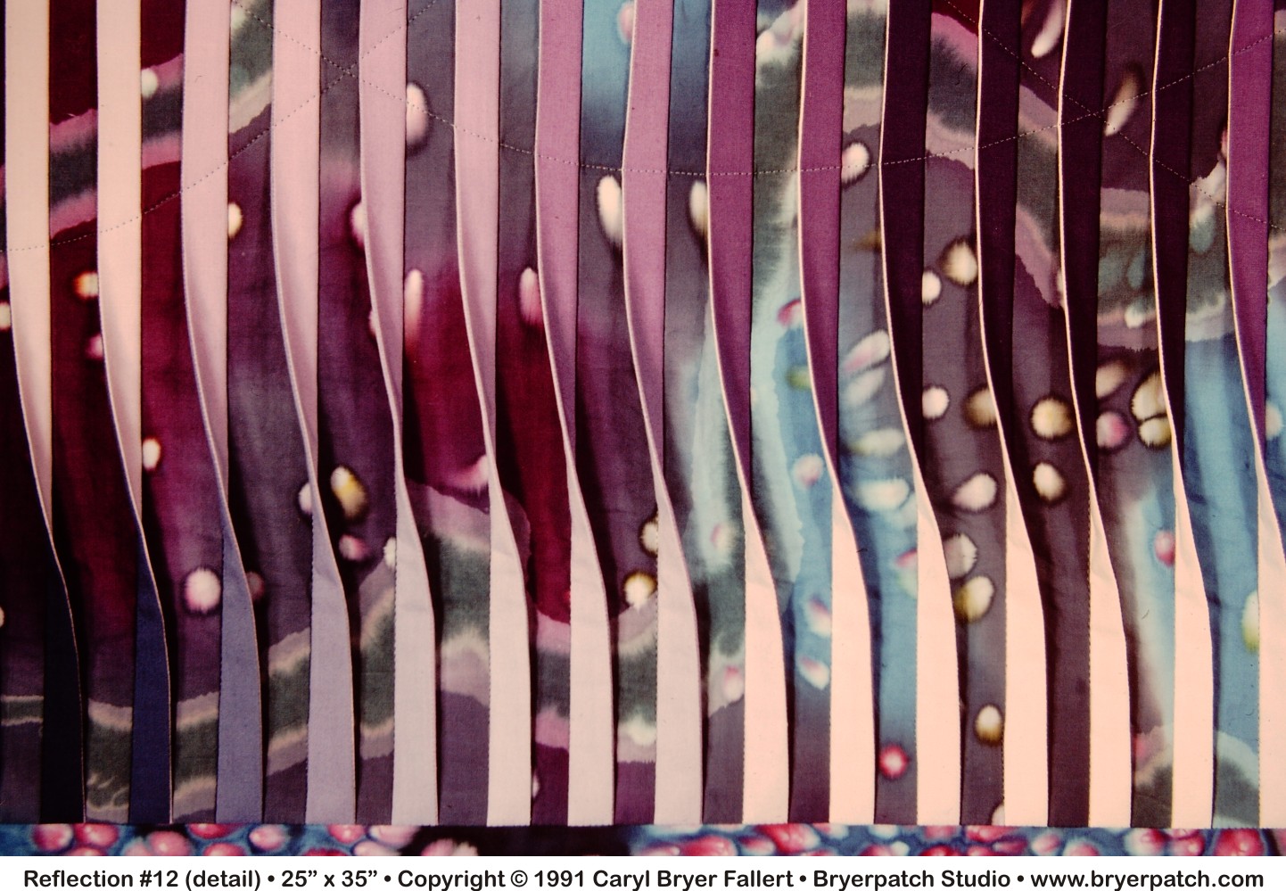 Each of the 1/2" "tucks" was constructed from two different fabrics. The right sides of the tucks were made from fabrics dyed in a gradation of light to dark purple. The left sides of the tucks were dyed in a gradation from light to dark navy. The use of gradations, and the twisting of the tucks from side to side, create the illusion of movement and light across the surface of the quilt.