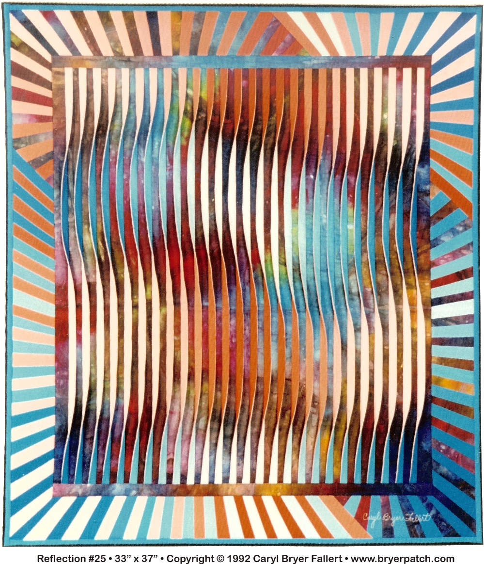 This is one of a series of quilts in which three dimensional, constructed tucks are incorporated into a patterned background. The background fabric was painted with fiber reactive dyes in an abstract design, in which colors seem to merge into one another.