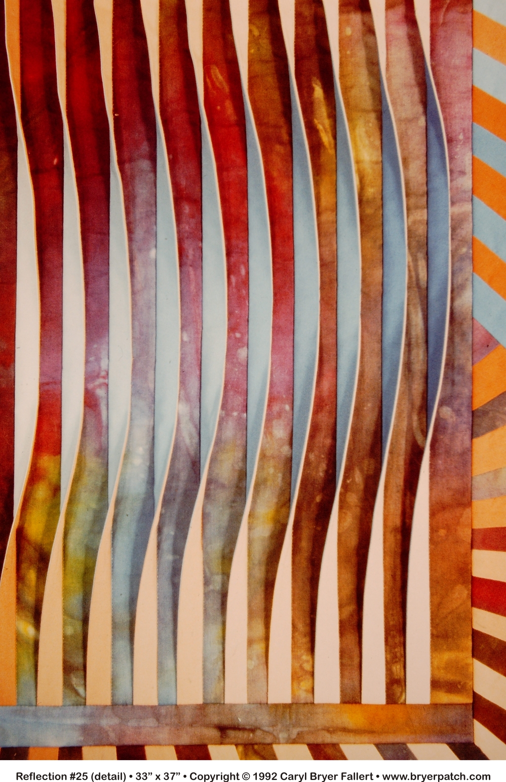 Each of the 1/2" "tucks" was constructed from two different fabrics. The right sides of the tucks were made from fabrics dyed in a gradation of turquoise from a medium value to white. The left sides of the tucks are a gradation from rust to pale peach. The use of value (light to dark) gradations, and the twisting of the tucks from side to side, create the illusion of movement and light across the surface of the quilt.