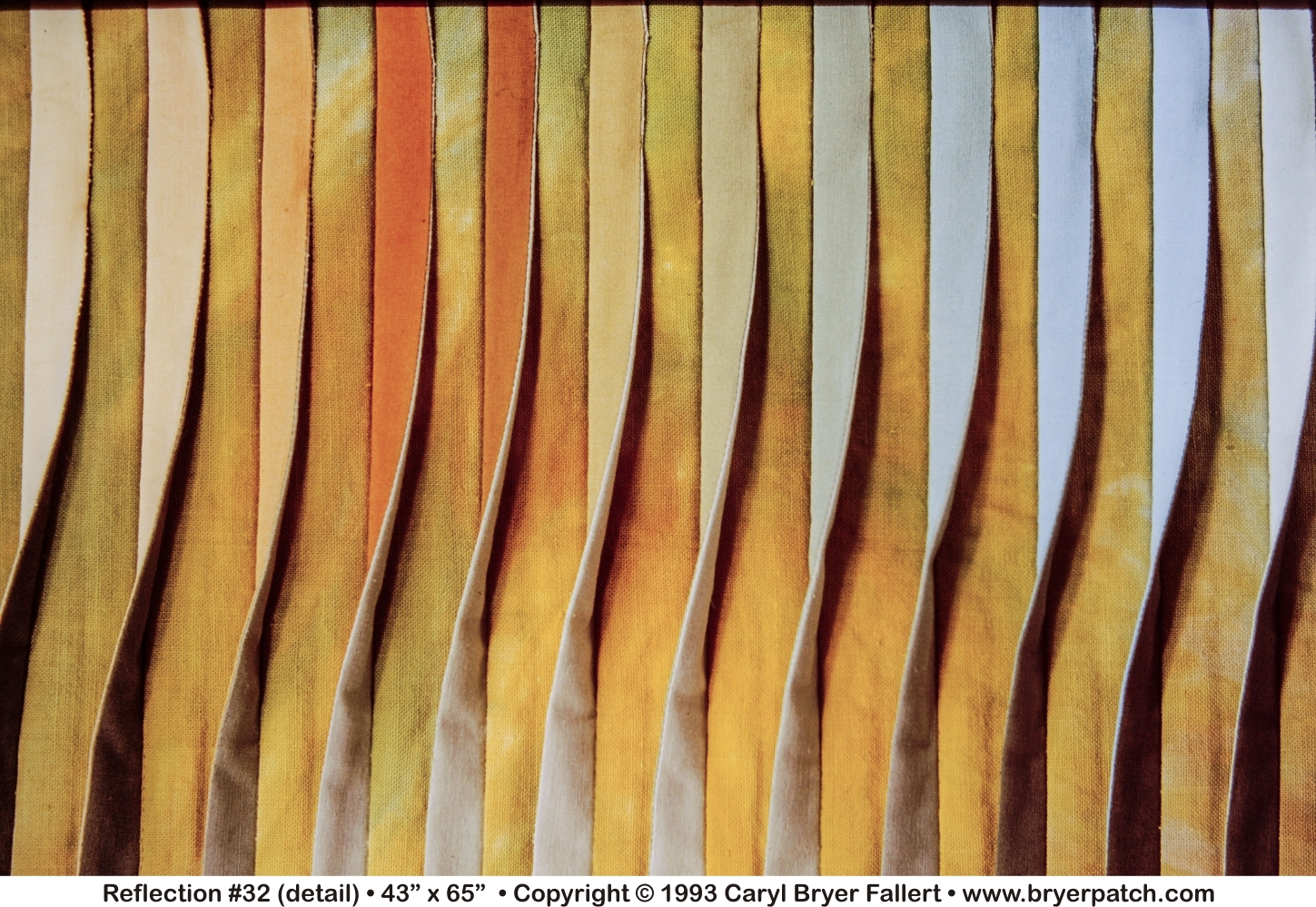 This is one of a series of quilts in which three dimensional, constructed tucks are incorporated into a patterned background.  The background fabric for REFLECTION #32 was  painted with fiber reactive dyes,  in an expressionistic, freeform design.