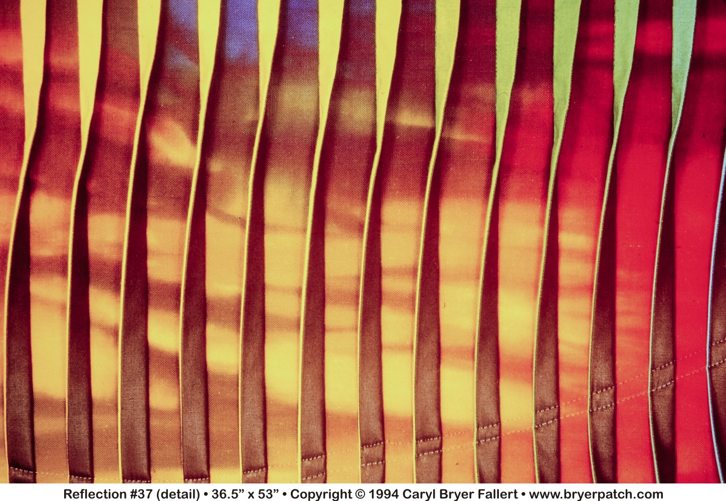 This is one of a series of quilts in which three dimensional, constructed tucks are incorporated into a patterned background. The background fabric for REFLECTION #37 was painted with fiber reactive dyes, in an expressionistic, freeform design.