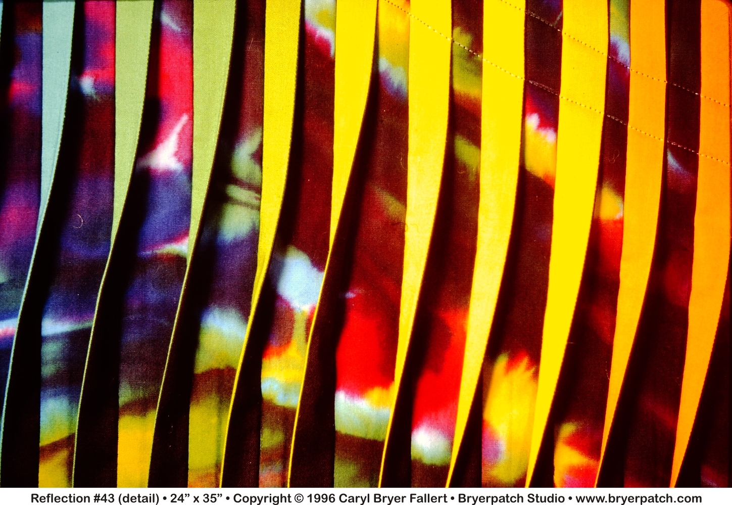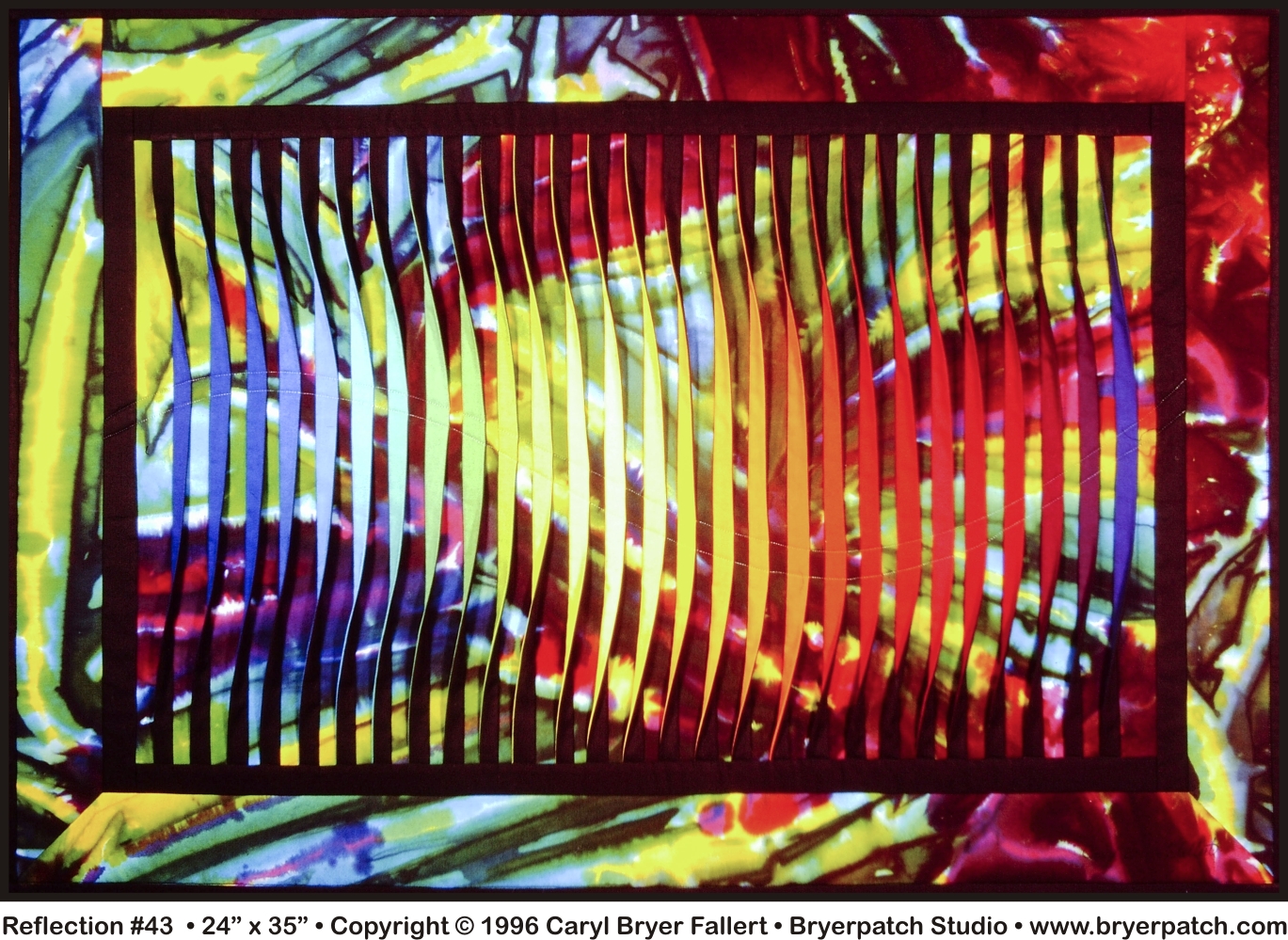 Each of the ½” "tucks” was constructed from two different fabrics. The left sides of the tucks were made from fabrics dyed in a gradation of rainbow hues. The left sides of the tucks are black. The gradations, and the twisting of the tucks from side to side, create the illusion of movement and light across the surface of the quilt. A narrow black border surrounds the center panel and is followed by a wider border of the painted background fabric and a black binding. |