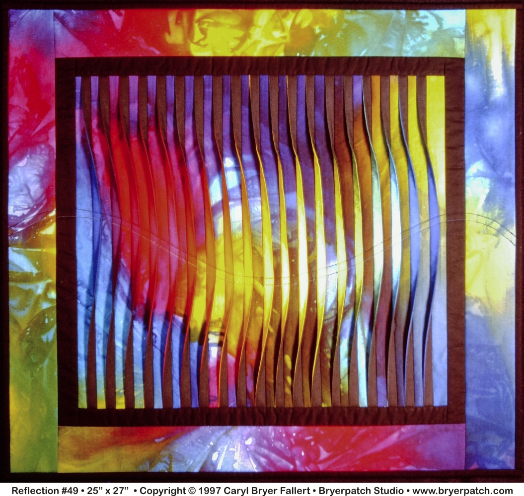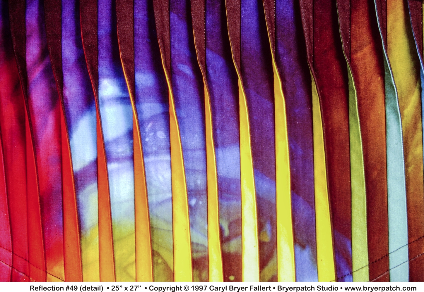 This is one of a series of quilts in which three dimensional, constructed tucks are incorporated into a patterned background. The background fabric was painted with fiber reactive dyes, in an expressionistic, freeform design. Each of the 1/2" "tucks" was constructed from two different fabrics. The left sides of the tucks were made from fabrics dyed in a gradation of pure rainbow hues. The right sides of the tucks are made from black fabric. The use of color gradations, and the twisting of the tucks from side to side, create the illusion of movement and light across the surface of the quilt. Because different colors are used on the right and left sides of the three dimensional tucks, the appearance of the quilt can be changed significantly by changing your point of view. I like to call the quilts in this series "viewer participation art."