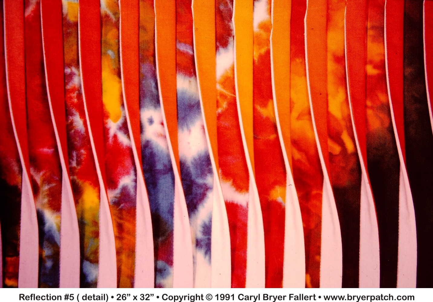 Each of the ½" "tucks” was constructed from two different fabrics. The left sides of the tucks are made from fabrics dyed in a light-to-dark gradation of purple. The right sides are a gradation from purple to golden yellow. The use of color gradations, and the twisting of the tucks from side to side, create the illusion of movement and light across the surface of the quilt.