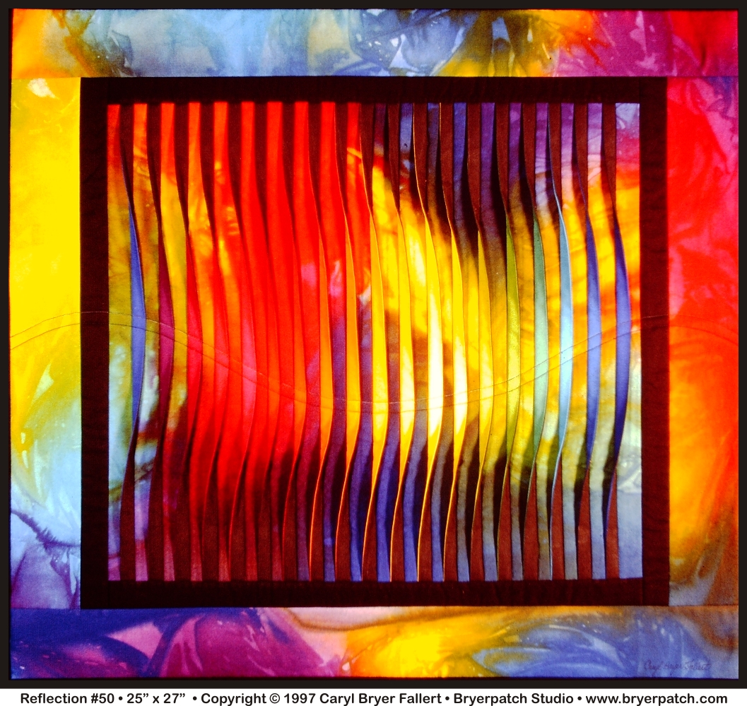 This is one of a series of quilts in which three dimensional, constructed tucks are incorporated into a patterned background. The background fabric was painted with fiber reactive dyes, in an expressionistic, freeform design.