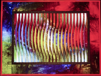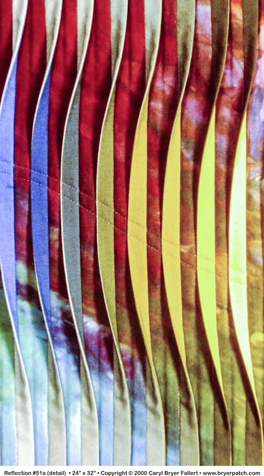 Each of the ½” "tucks” was constructed from two different fabrics. The right sides of the tucks are a gradation of rainbow hues. The left sides are a gradation of light to dark green. The use of color gradations, and the twisting of the tucks from side to side, create the illusion of movement and light across the surface of the quilt. Because different colors are used on the right and left sides of the three dimensional tucks, the appearance of the quilt can be changed significantly by changing your point of view. I like to call the quilts in this series "viewer participation art."
