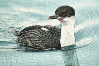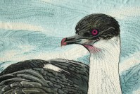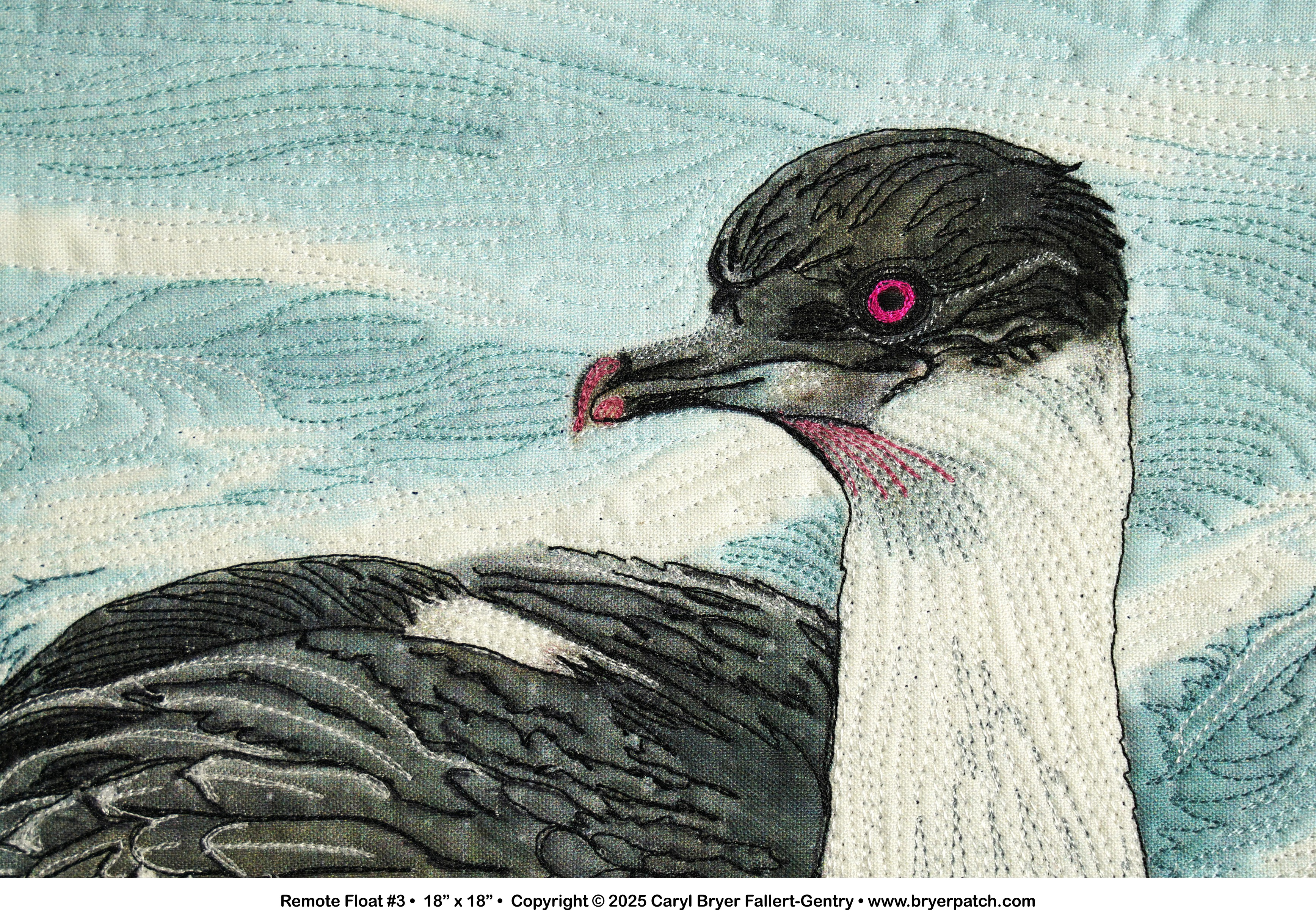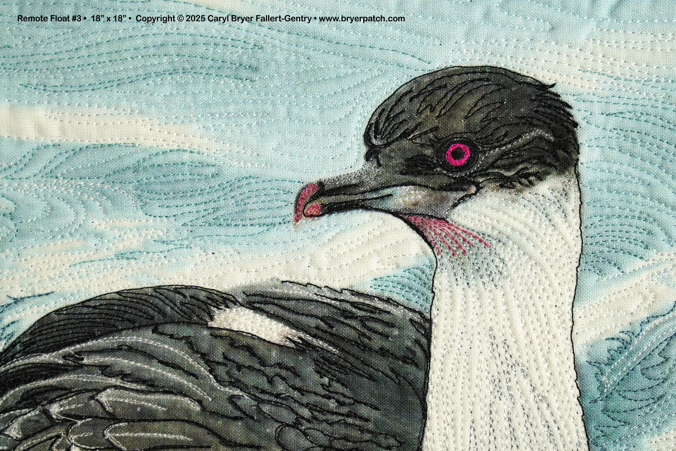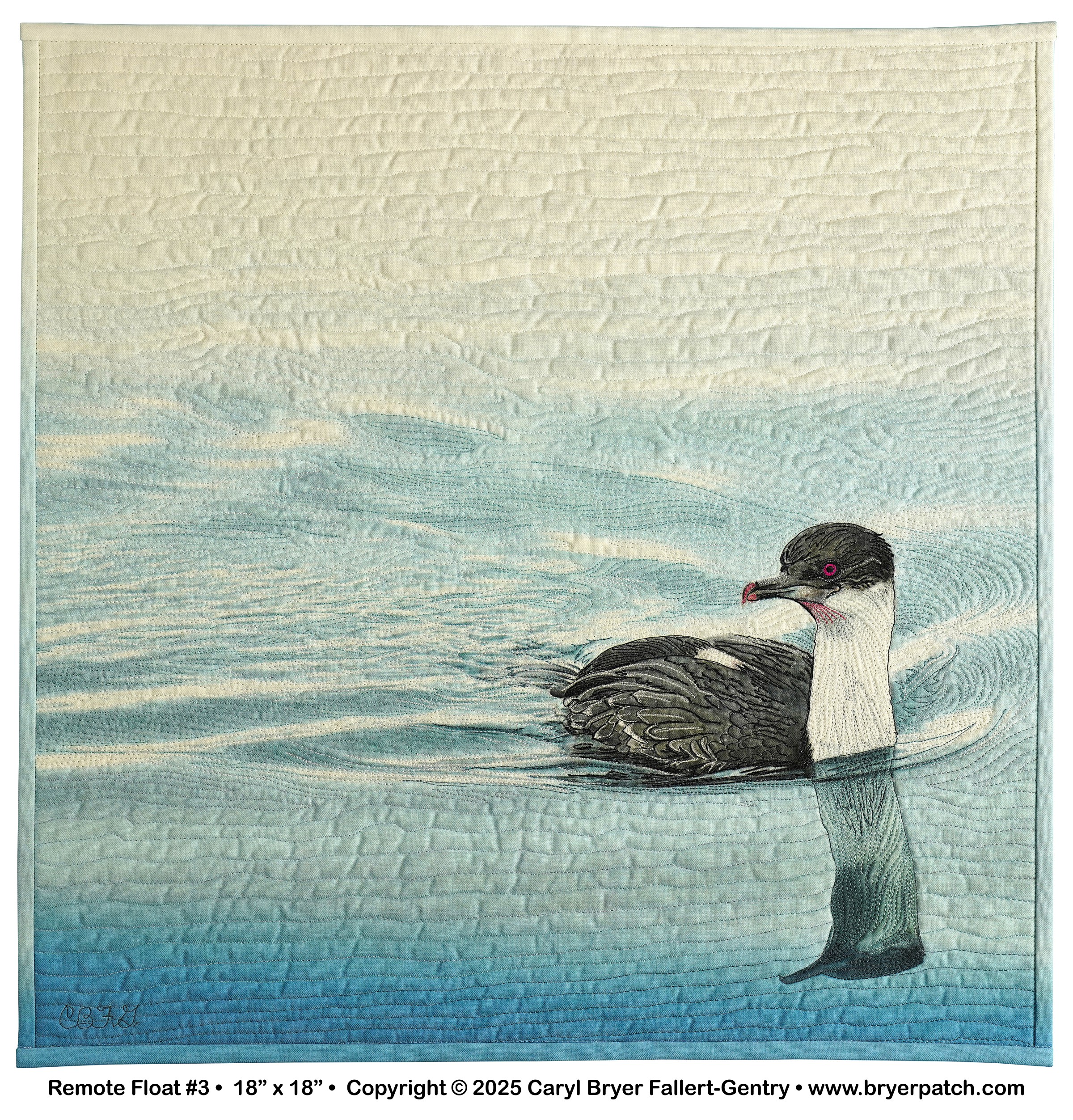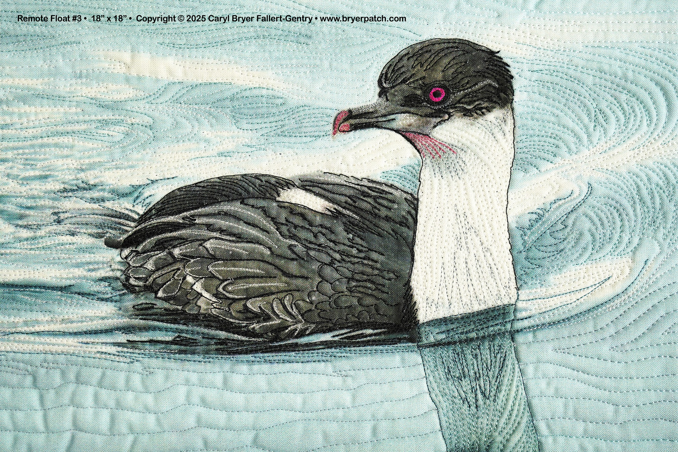 The cormorant and the water surrounding it are heavily quilted and thread painted. The negative spaces are quilted simply with a series of almost parallel lines that echo the ripples in the water. The backing fabric is from my gradations collection for Benartex.
