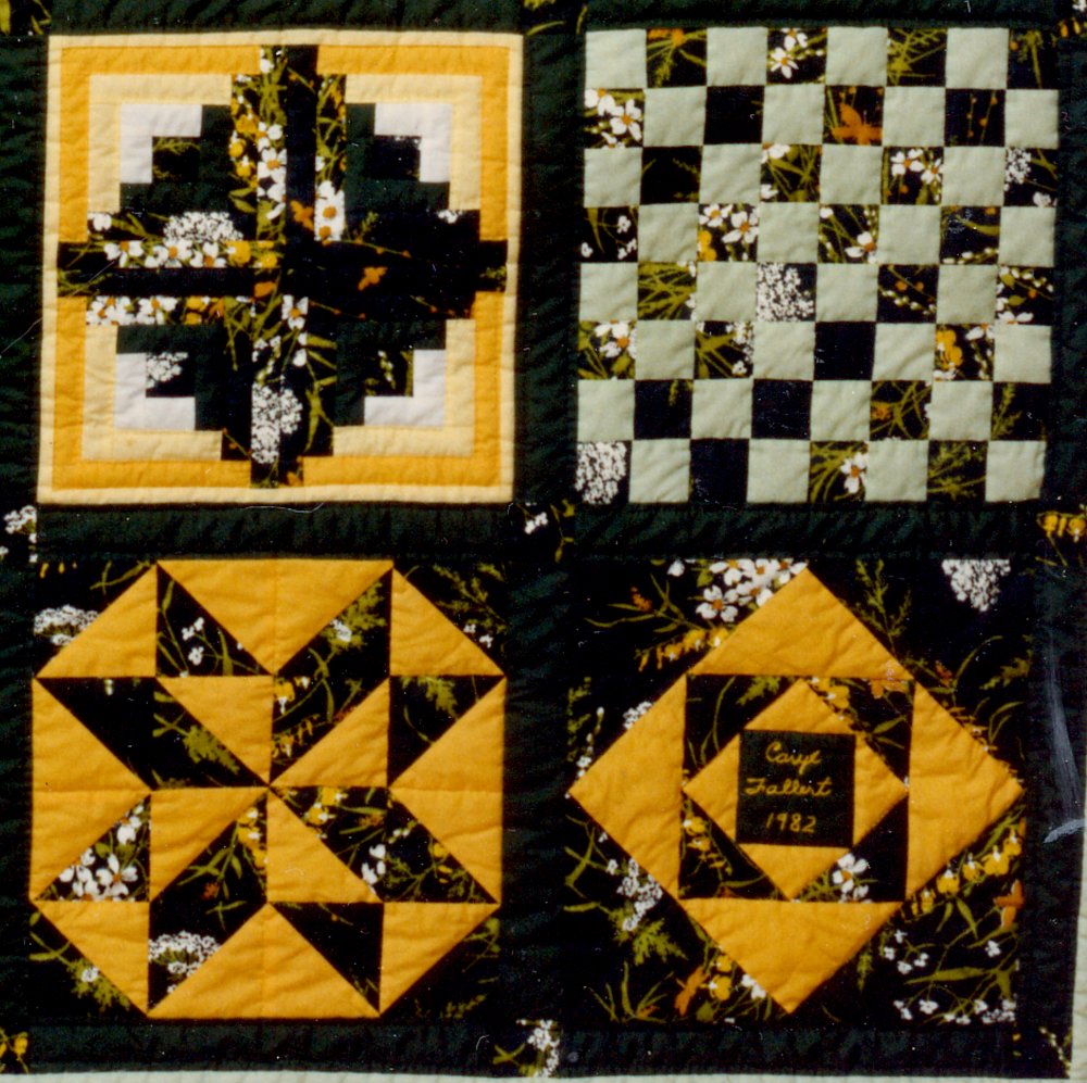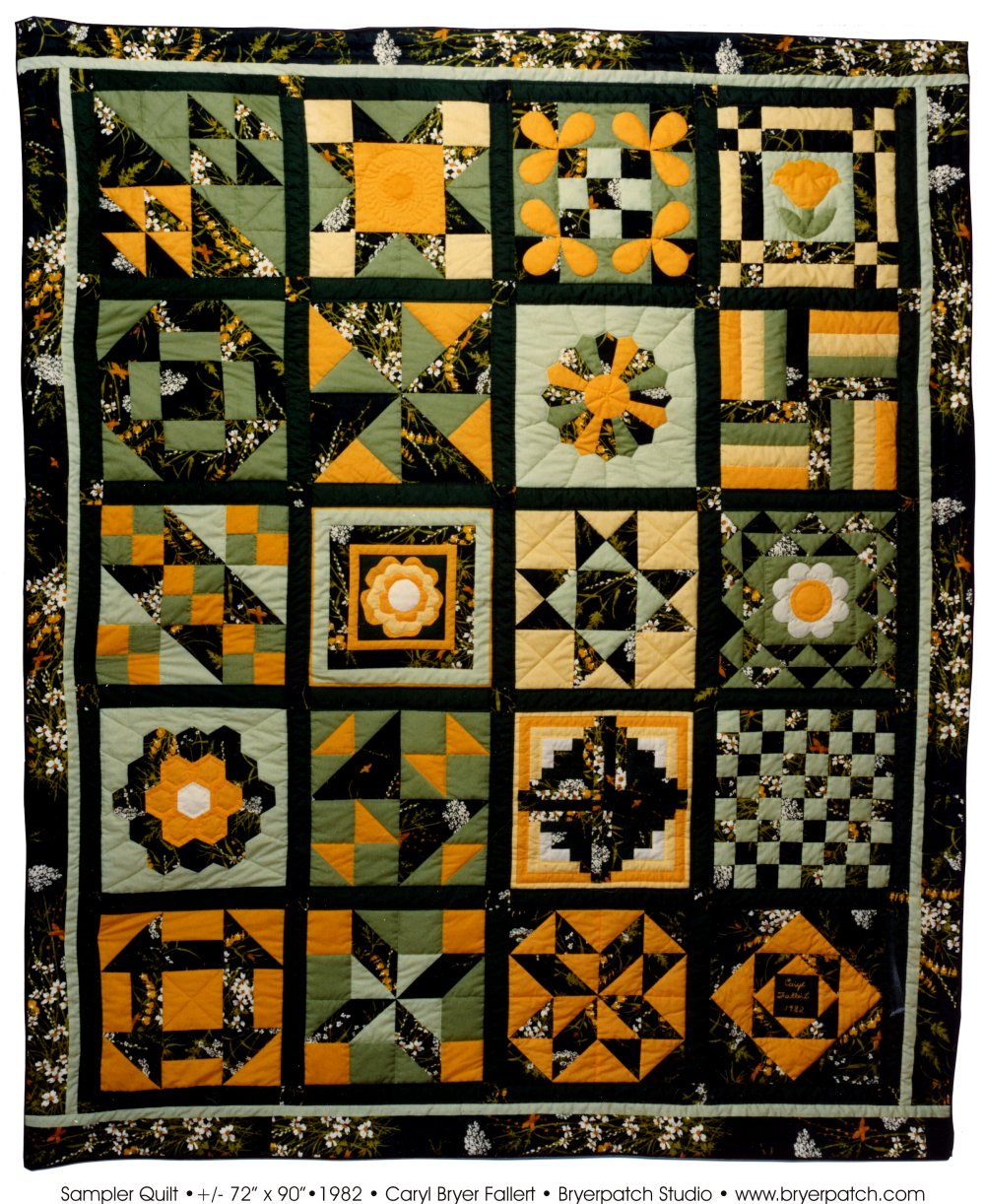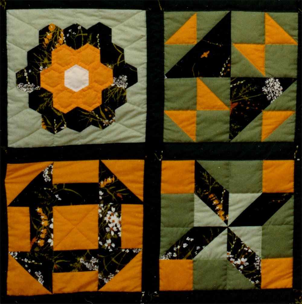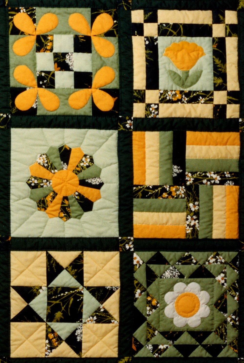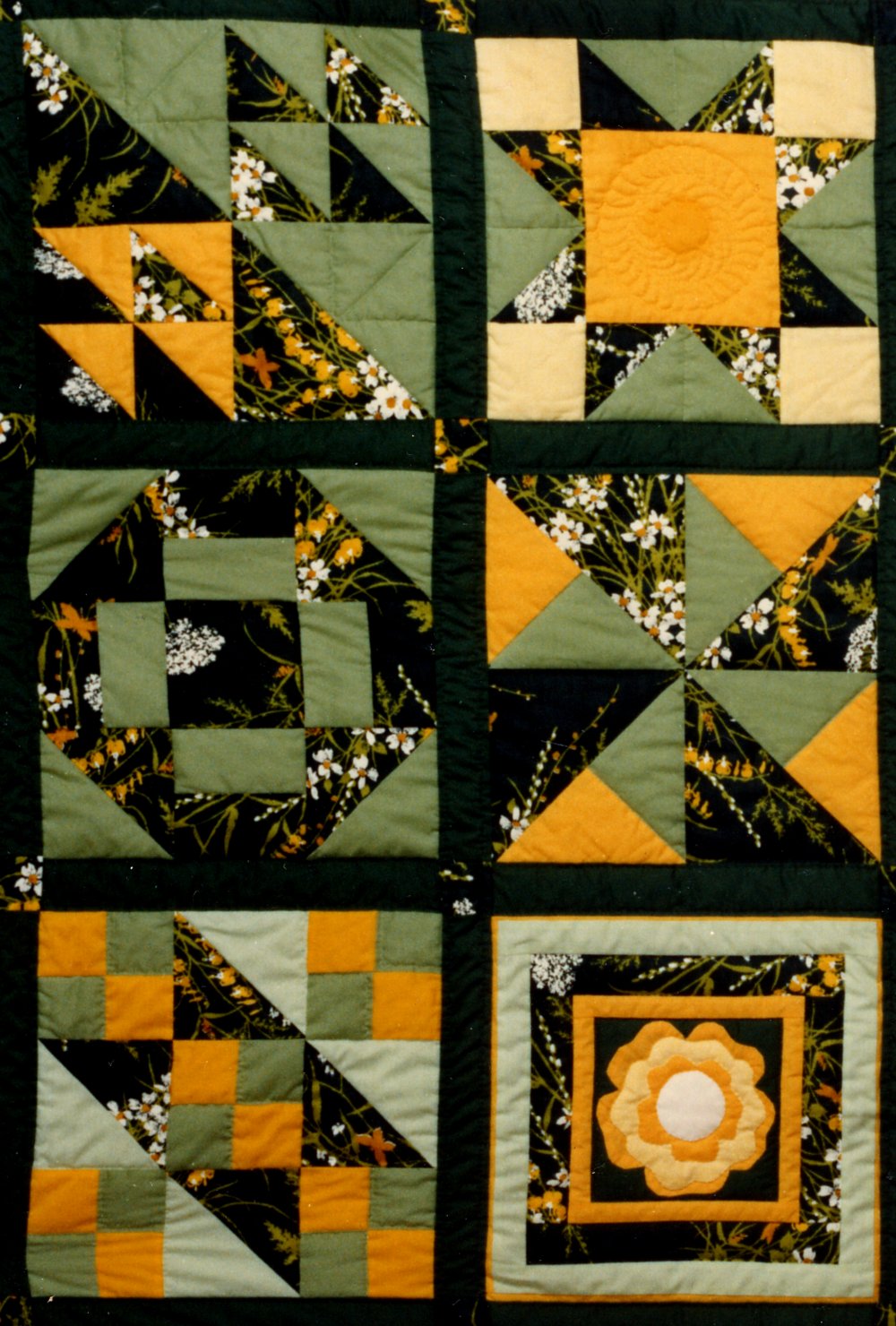 I bought a second book about quilts which had instructions for making some traditional blocks and gave some basic information about quilt construction, including the fact that most quilters used quarter inch seams, rather than the five-eighth-inch seams used by dress-makers. This was a learning experience, as samplers are meant to be. I used left-over upholstery fabric from our (then under-renovation farmhouse) and mixed it with solid cottons and cotton blends in various shades of green and yellow. This is far from a masterpiece, but it was useful as a throw on the matching sofa in our TV room for many years.