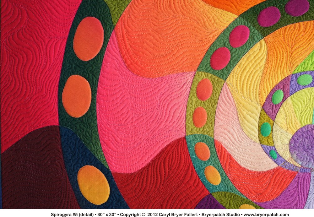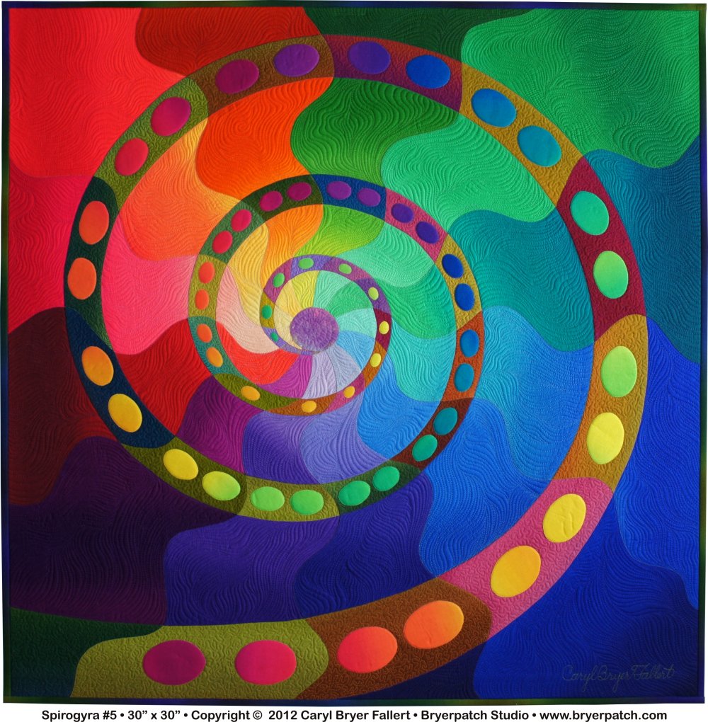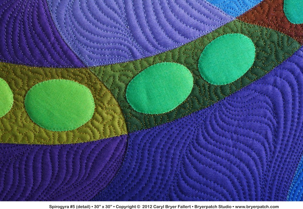 For many years a small clipping from a magazine hung over my desk. It was a picture taken through a microscope of spirogyra, a single-cell, filamentous algae, commonly known as pond scum. This the fifth quilt I have made, inspired by the patterns of dots and curving stripes found in that image. This one is quite different from the original inspiration, but evolved from the four previous quilt designs. This entire quilt is a study in intersecting color and value gradations. The wavy lines radiating from the center form transparencies where they cross the logarithmic spiral (a special kind of curve which often appears in nature). The fabrics used are all from my Gradations collection for Benartex. The spiral and background were pieced using my hybrid “applipiecing” method. The dots were appliqued. |