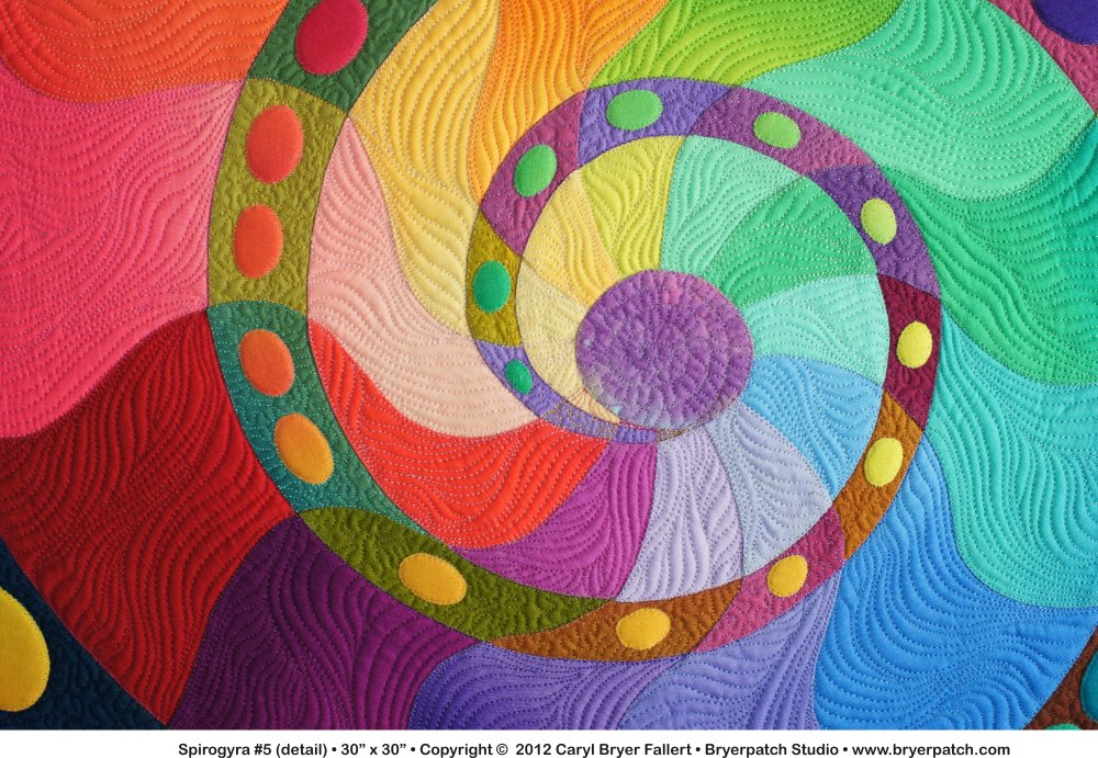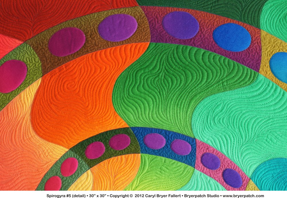 | The spiral fabrics are quilted in a small meander pattern with matching thread. The radiating background segments are quilted in wavy lines that suggest algae in flowing water. The dots are unquilted. The binding is a dark rainbow fabric from the Gradations collection for Benartex. |