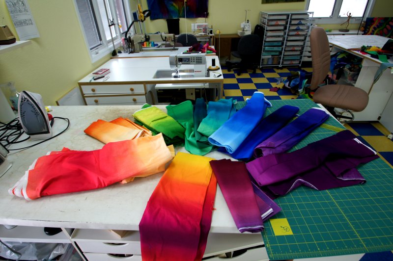 Here fabrics from the Gradations collection are being auditioned on my ironing table |