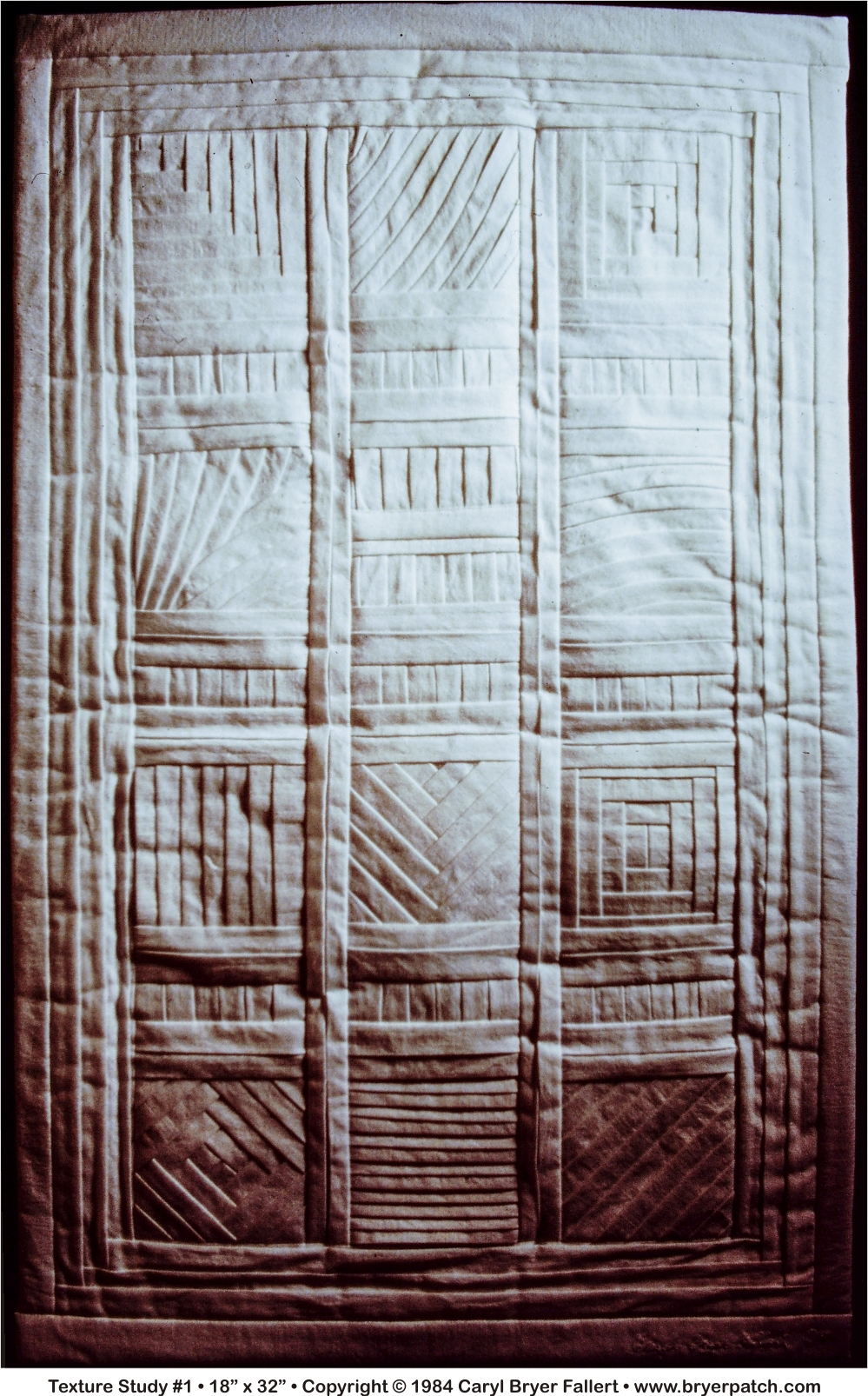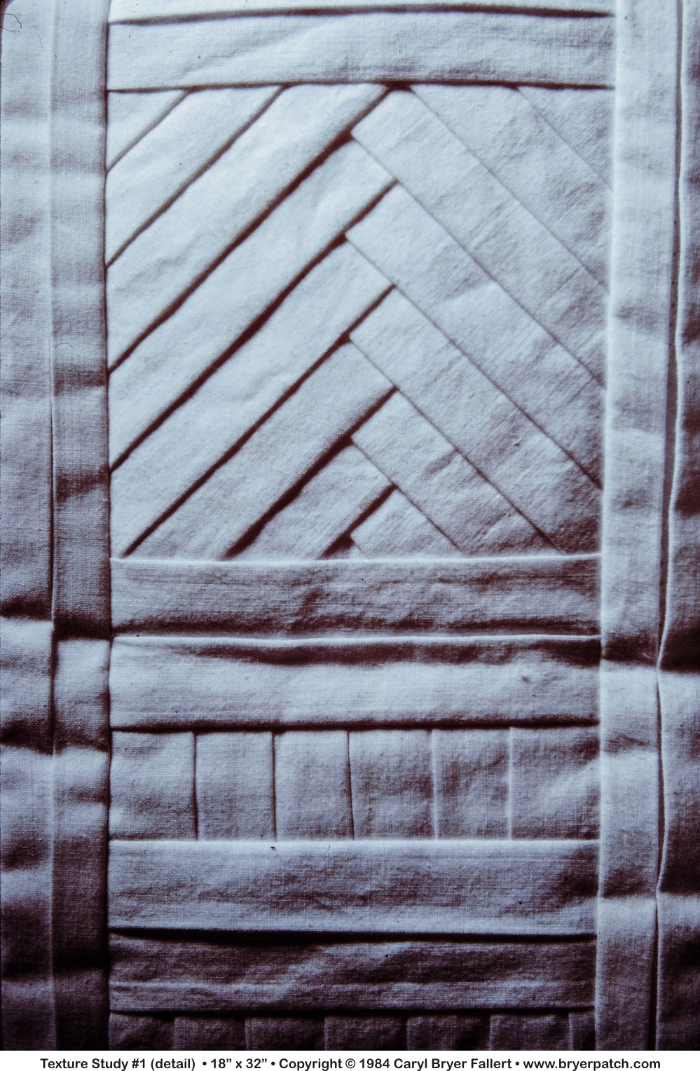 This quilt was made as an experiment in creating texture. I folded fabric in many different ways and cut the samples into rectangles, which were then sewn together to form an 18” x 32” piece. |