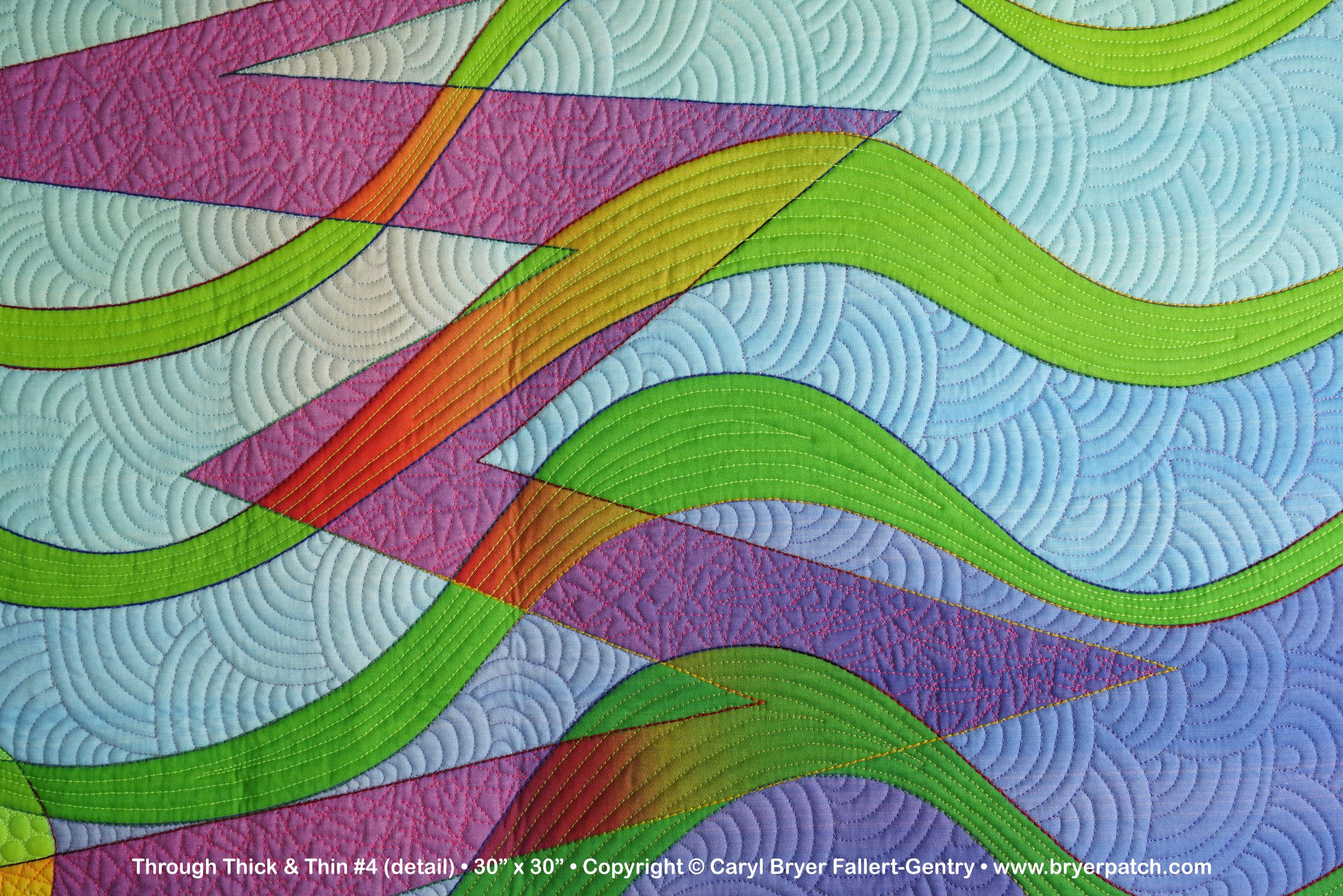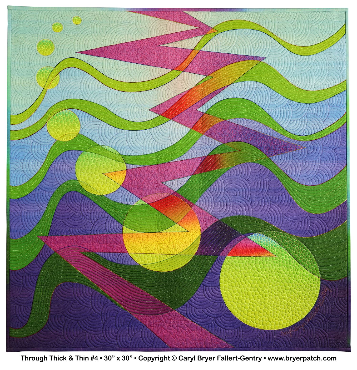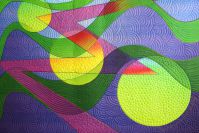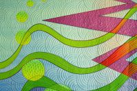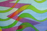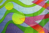This is one of a series of quilts that combine zigzags, circles, and curved shapes, in this case, thick and thin waves and graduated orbs. Using Corel Draw, I drew and painted the design on my computer and had it digitally printed on cotton fabric by Spoonflower. The quilting was done with many different thread colors and patterns. The binding strips were designed especially for this piece. The backing fabric is from one of my collections for Benartex. |