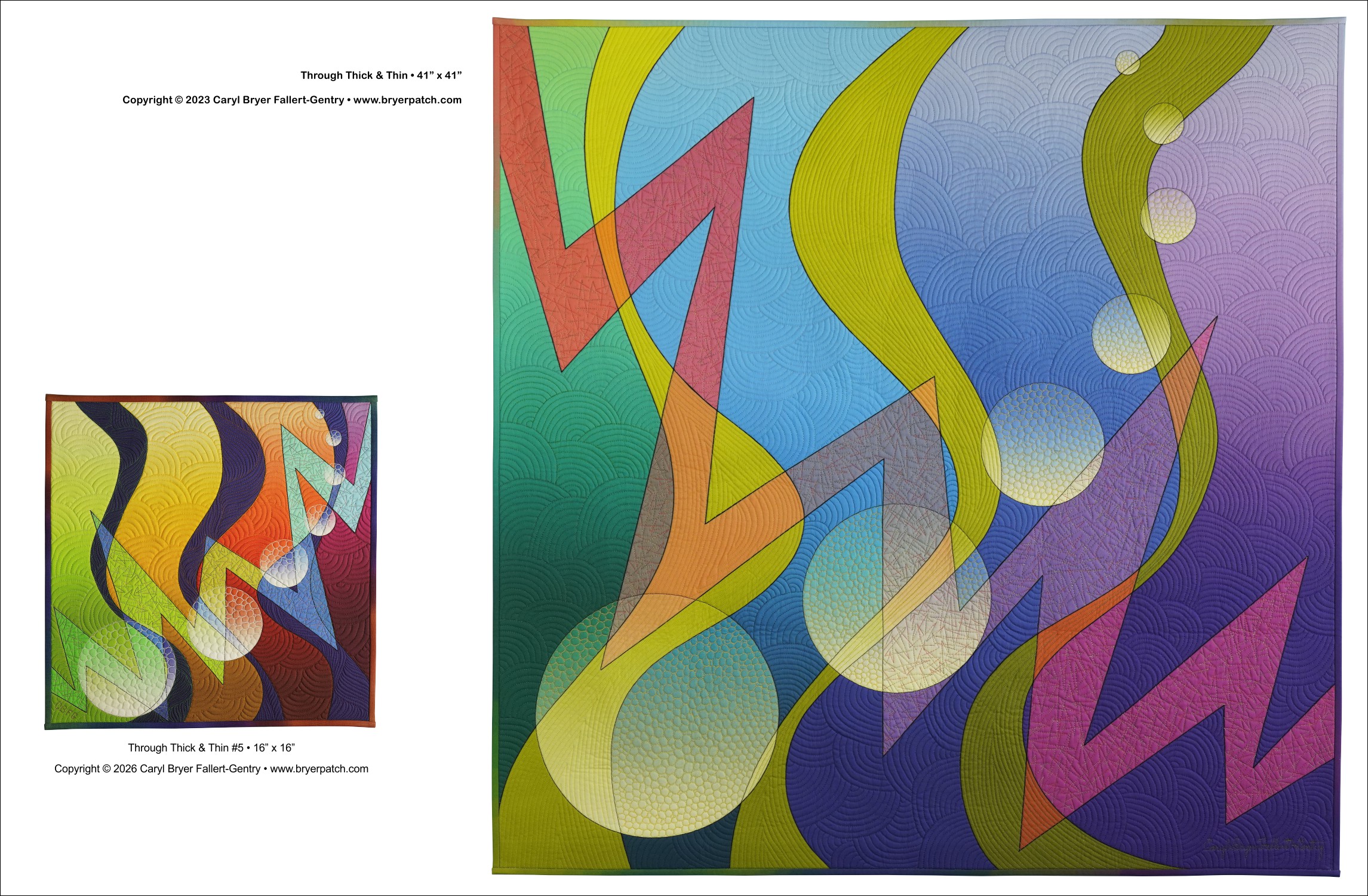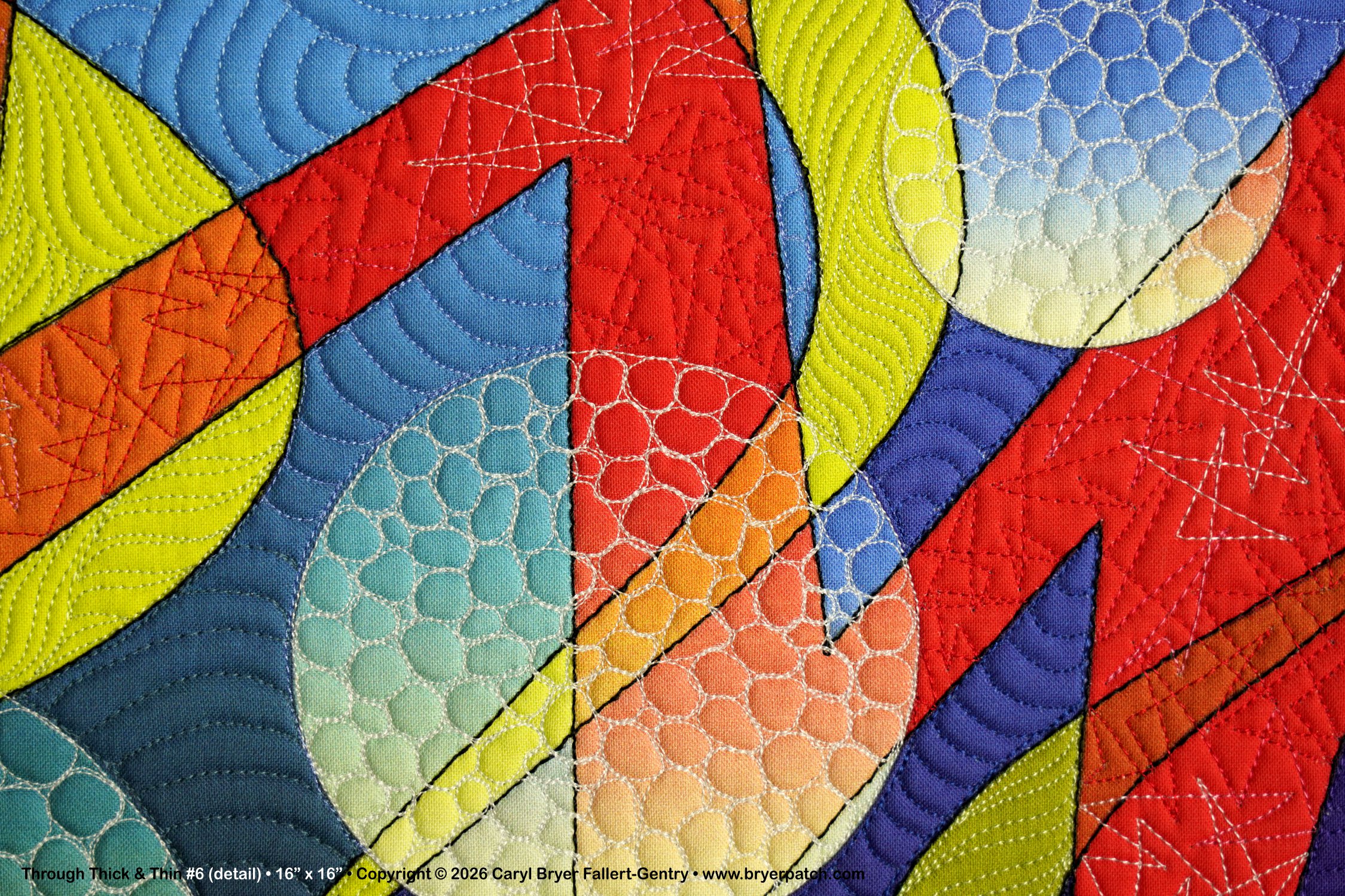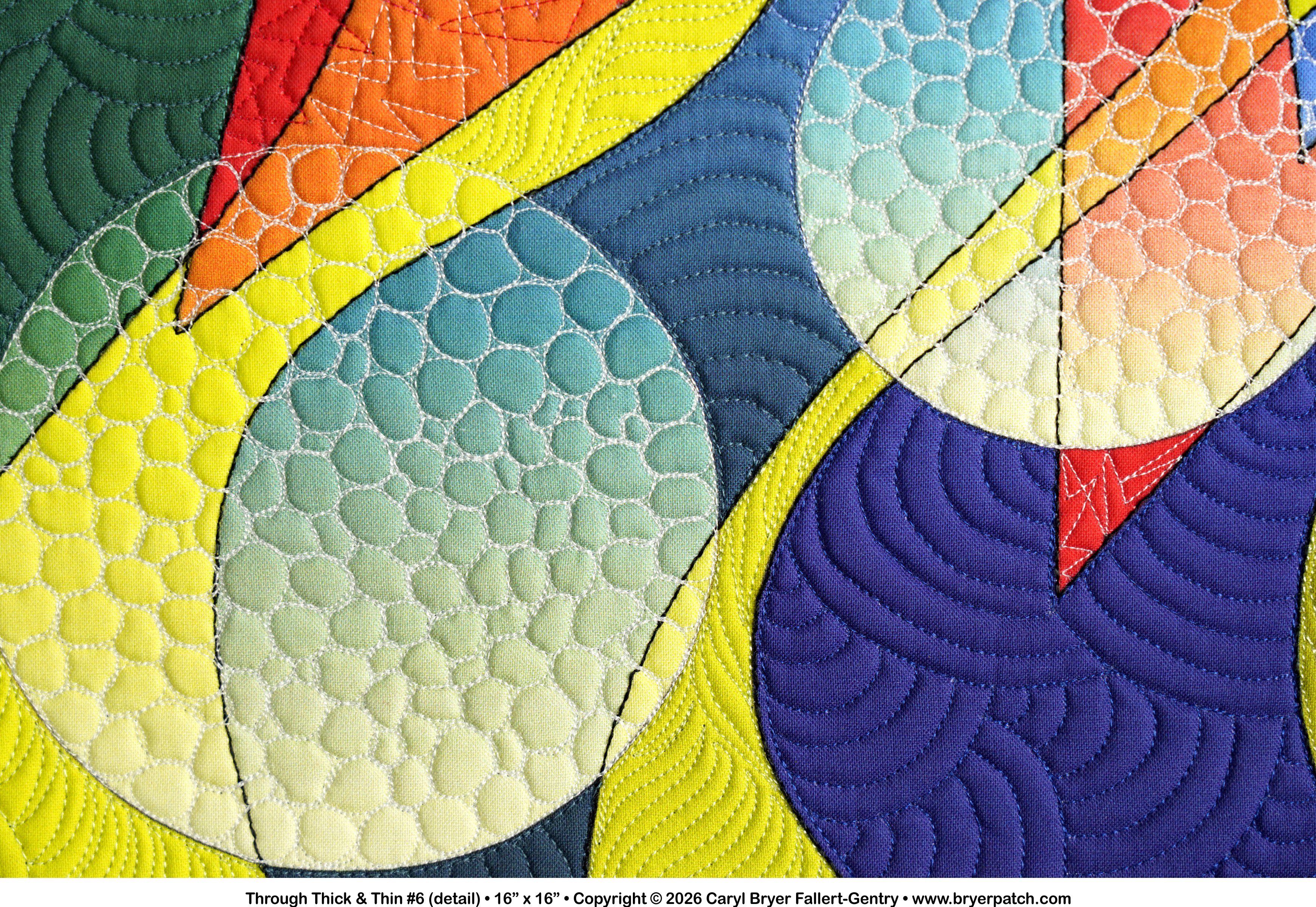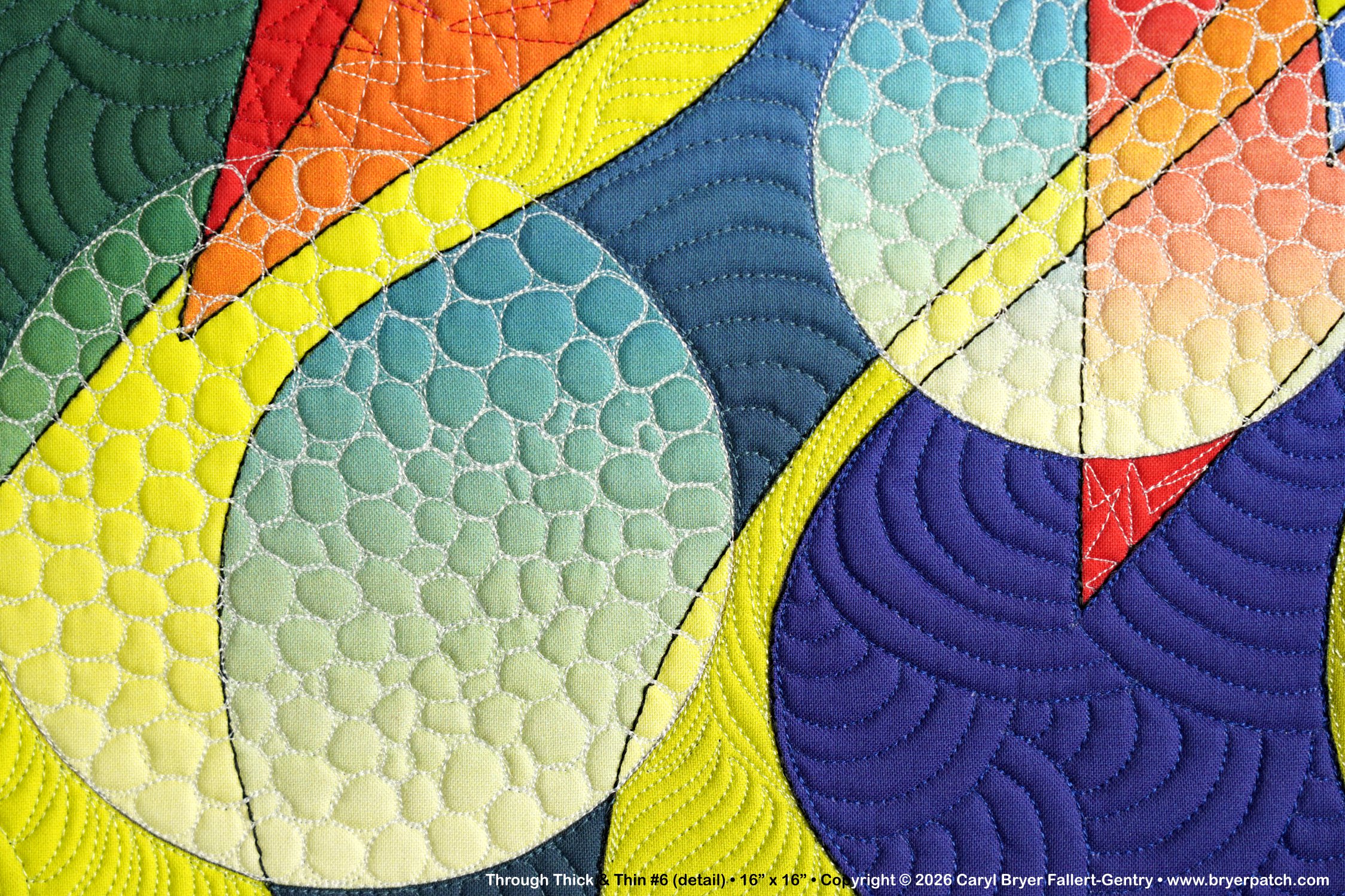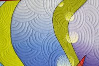 This is one of a series of quilts that combine zigzags and curved shapes, in this case, thick and thin waves and graduated orbs. I turned my line drawing into separate shapes and graduated the colors and values within each shape. Where the shapes crossed, I used different colors, which makes every shape appear transparent. The quilting was done with many different thread colors and patterns. The backing fabric is from one of my collections for Benartex. This is a miniature version, in completely different colors, of my much larger quilt Through Thick & Thin #1. |