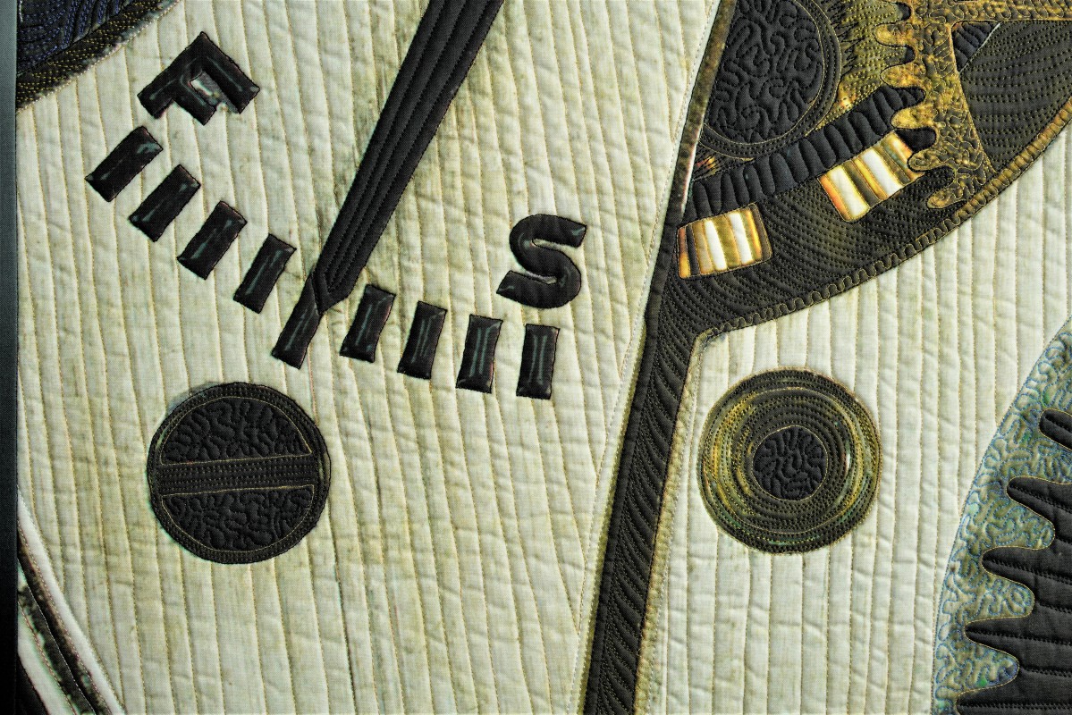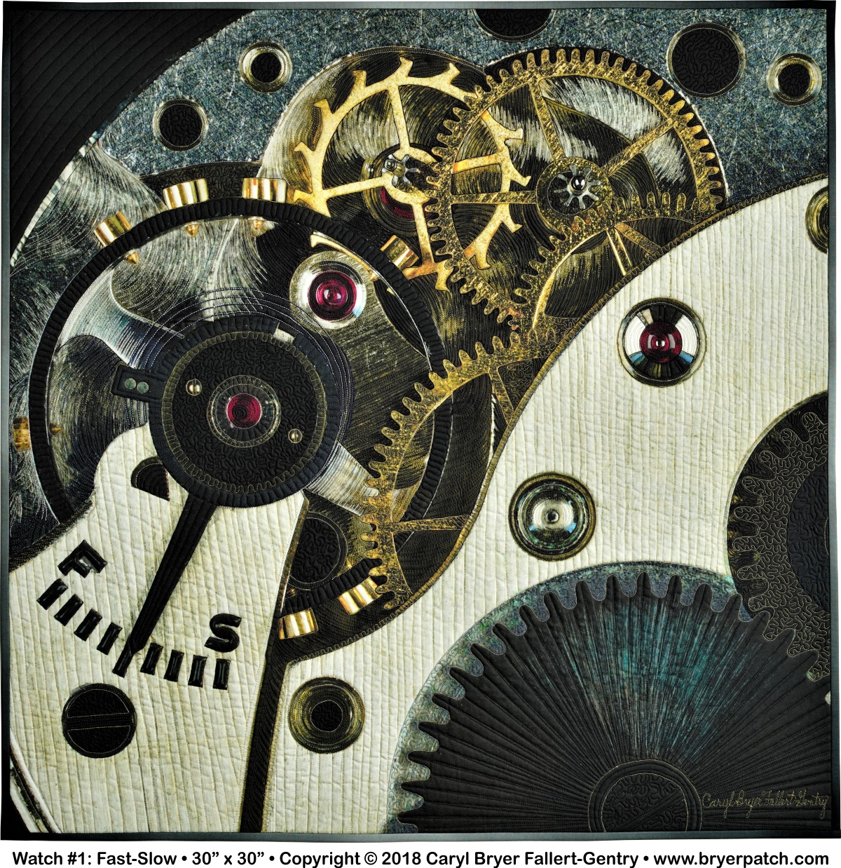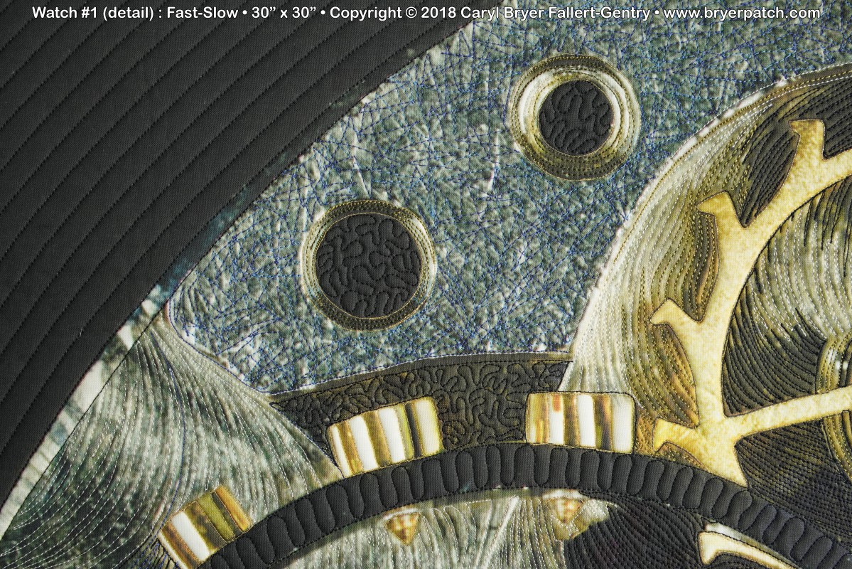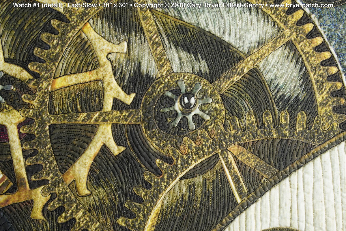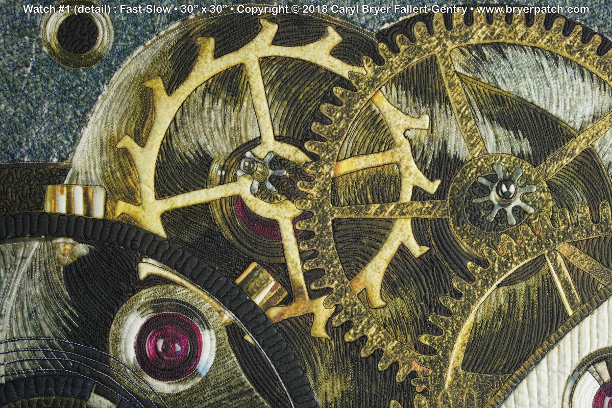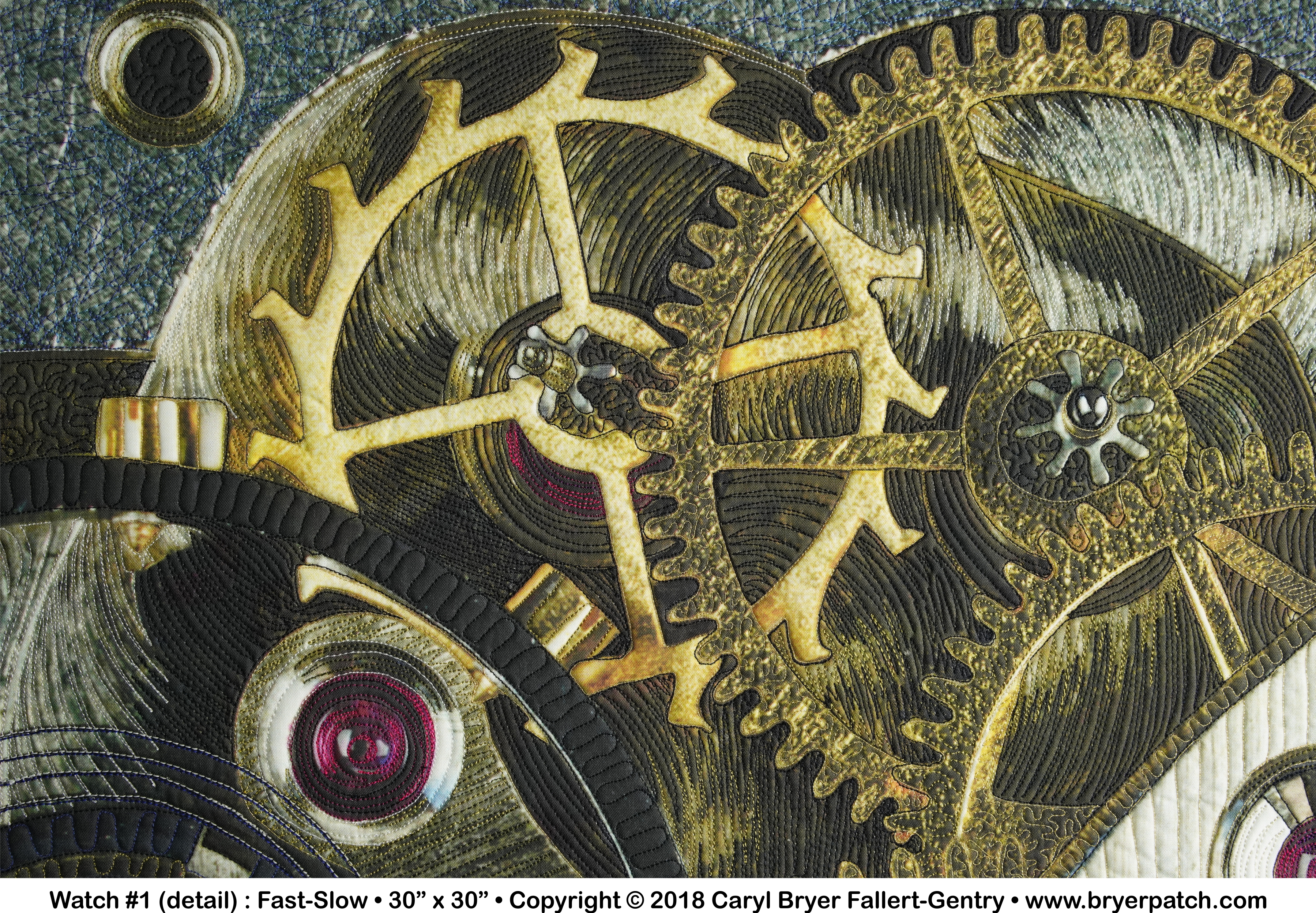 In 2017, my husband Ron and I began looking at these objects close-up, first with a digital microscope and later with a macro lens. Ron discovered that by using a focus stacking technique he could get every part of the image in focus. I cropped one of these images until it became just an abstract composition. After some additional digital manipulation, I had the image printed on cotton fabric. In the quilting, I used many different colors of thread to make quilting patterns that emphasize the subtle textures and colors in the various metals and jewels of the mechanism. |