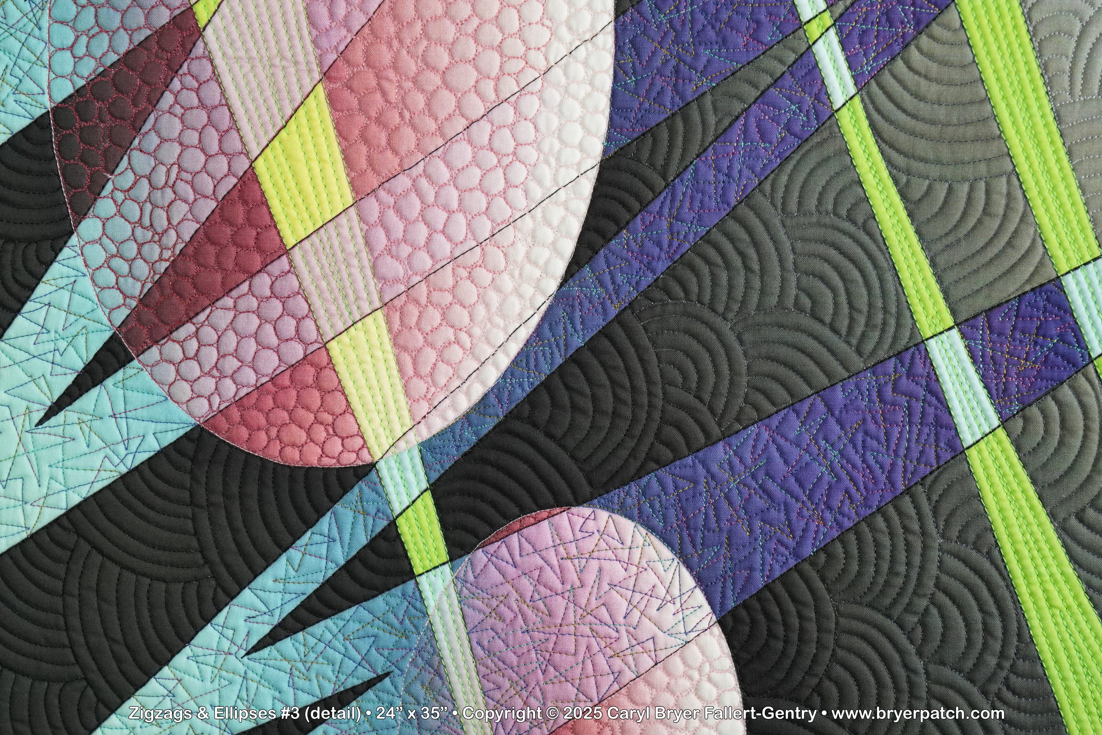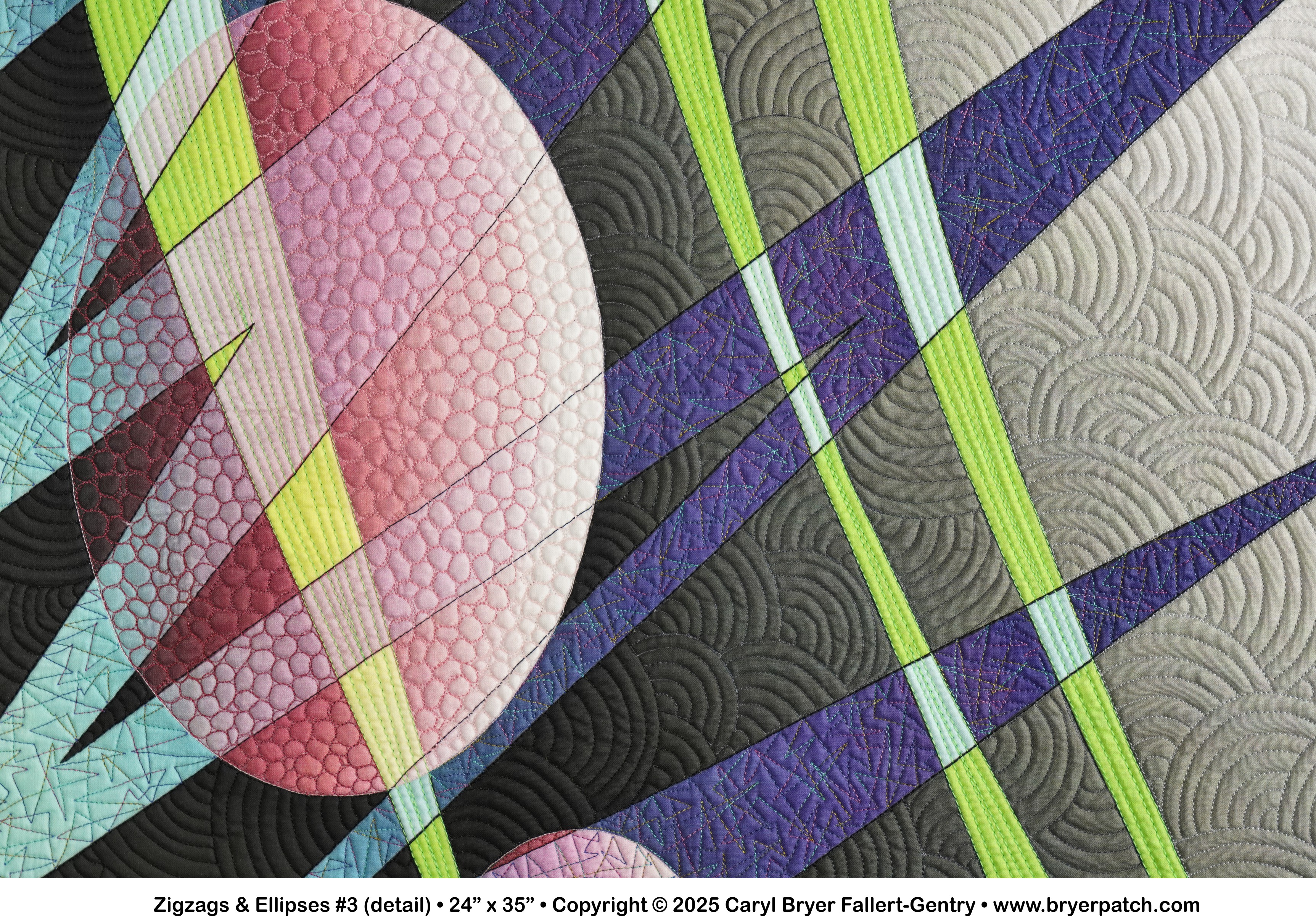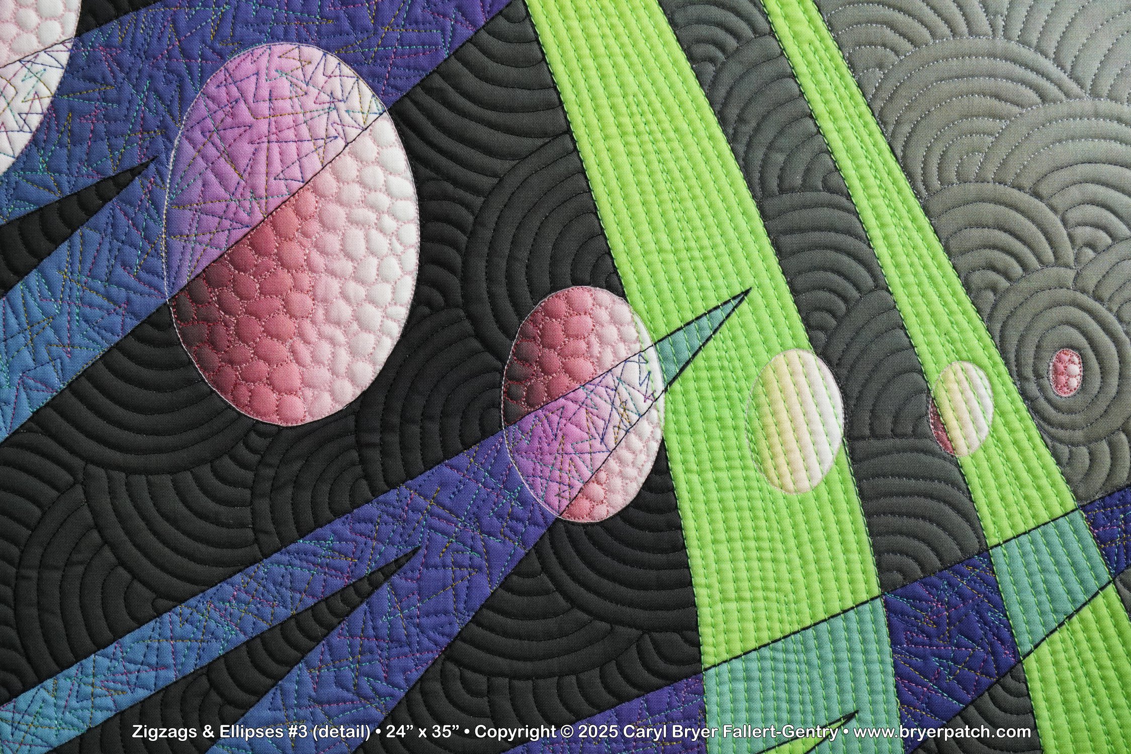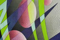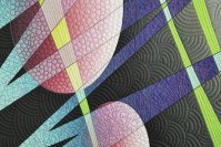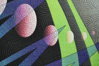This design grew out of my series in which I combine freeform zigzags, circles, and a few freeform curves. In this case, I turned the circles into ellipses that ended up looking like eggs. I drew and painted the whole design in Corel Draw and had it printed by Spoonflower.com. As I arranged the shapes in the design, I made the areas where they overlapped into separate shapes and chose duller colors in those shapes to create the illusion that all the shapes are transparent. I shaded each shape from light to dark or color to color to create the illusion of an inner glow. Each of the ellipses also seems to fade away along one edge. I quilted the black lines and the wavy green shapes with a regular sewing machine foot (feed dogs up) and heavy #30 top stitching thread, and in the rest of the quilt I used free-motion quilting (feed dogs down) in many different colors of polyester & acrylic thread. |