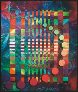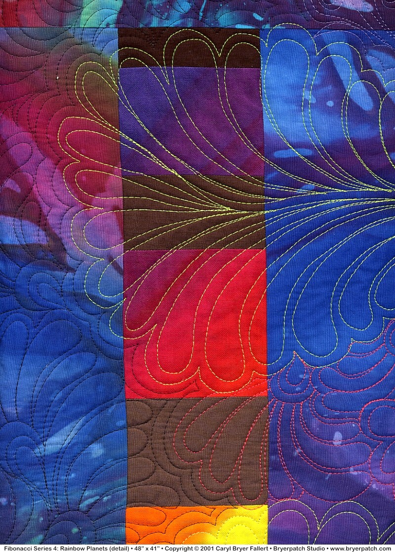 The design for the grid in this quilt is based on the orderly progressions of scale, observed in nature by thirteenth century mathematician Leonardo Fibonacci (1-2-3-5-8-etc.). A series of circles in graduated sizes and colors float over the surface of the grid in a diagonal compound curve.
