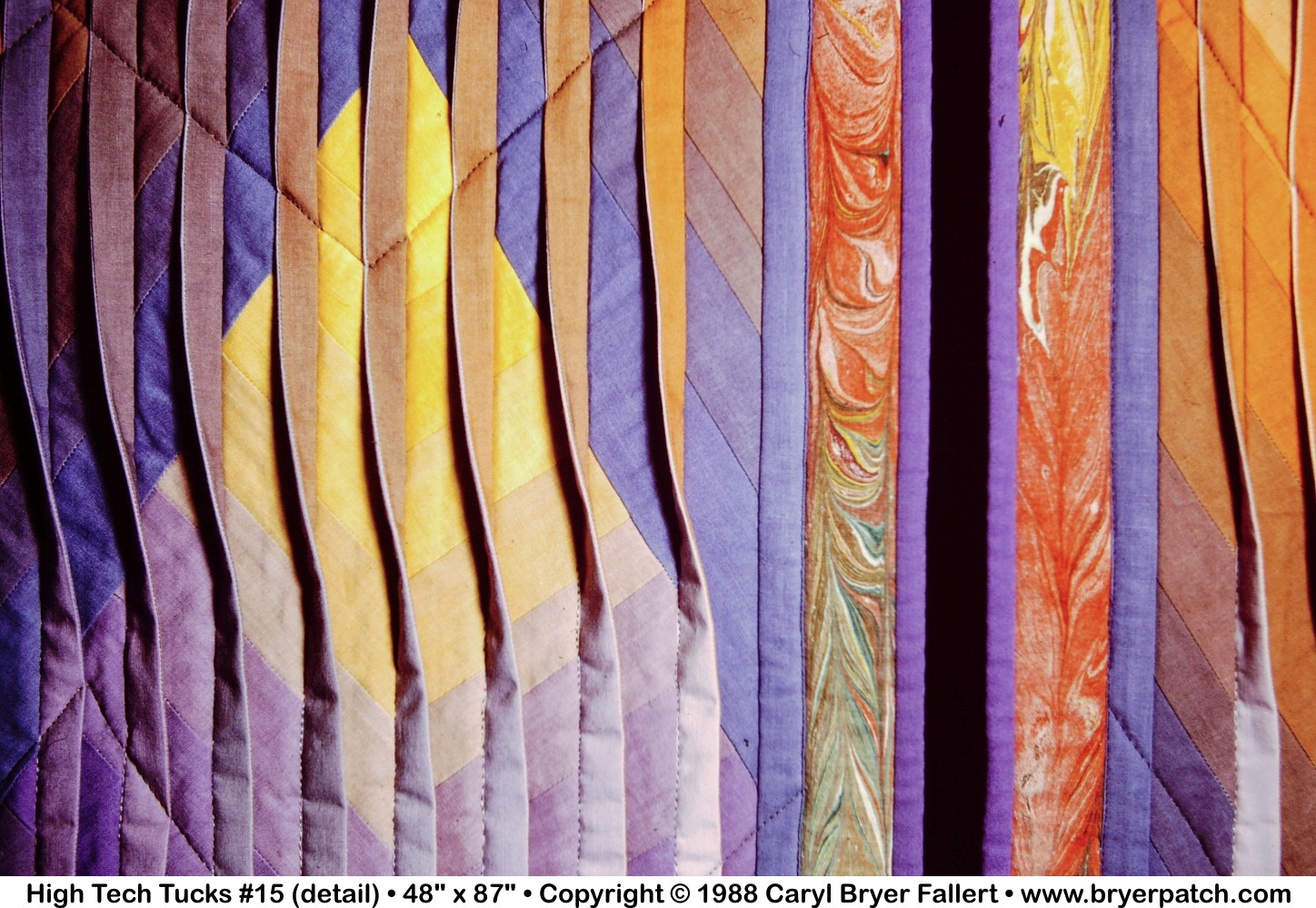 Each of the 1/2" "tucks” was constructed from two different fabrics. A different gradation of colors and values is used on each side of the tucks. The use of color and value gradations, and the twisting of the tucks from side to side, create the illusion of movement and light across the surface of the quilt.