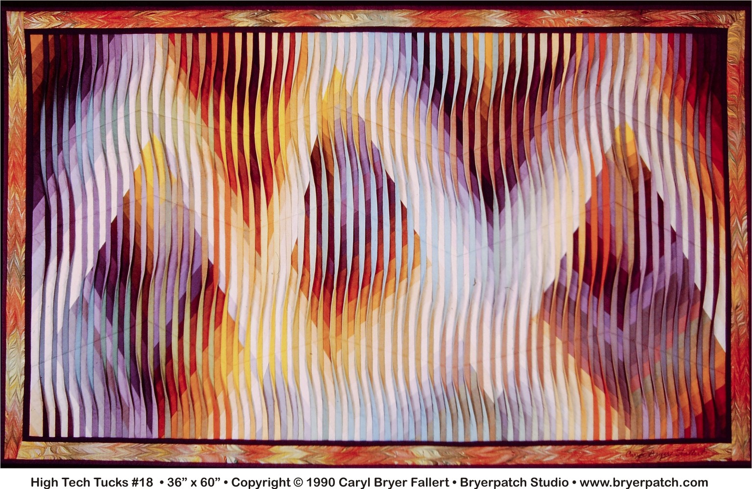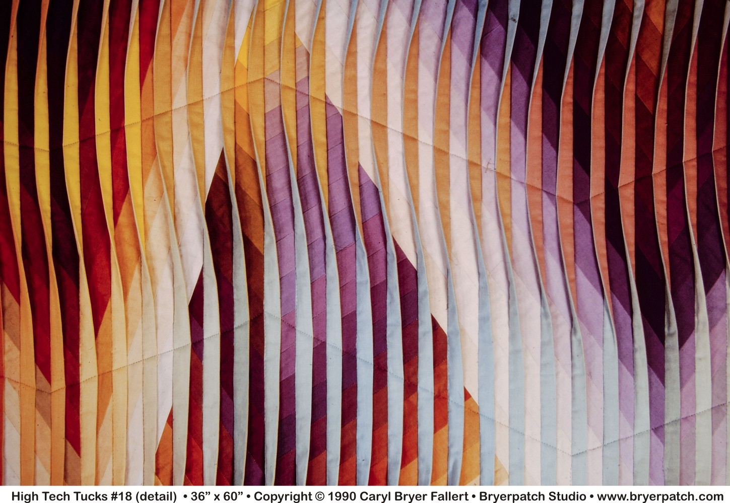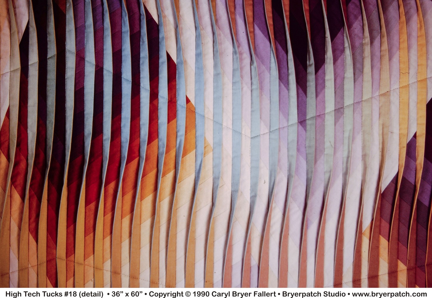 Each of the 1/2" "tucks” was constructed from two different fabrics. A different gradation of colors and values is used on each side of the tucks. The use of color and value gradations, and the twisting of the tucks from side to side, create the illusion of movement and light across the surface of the quilt.
